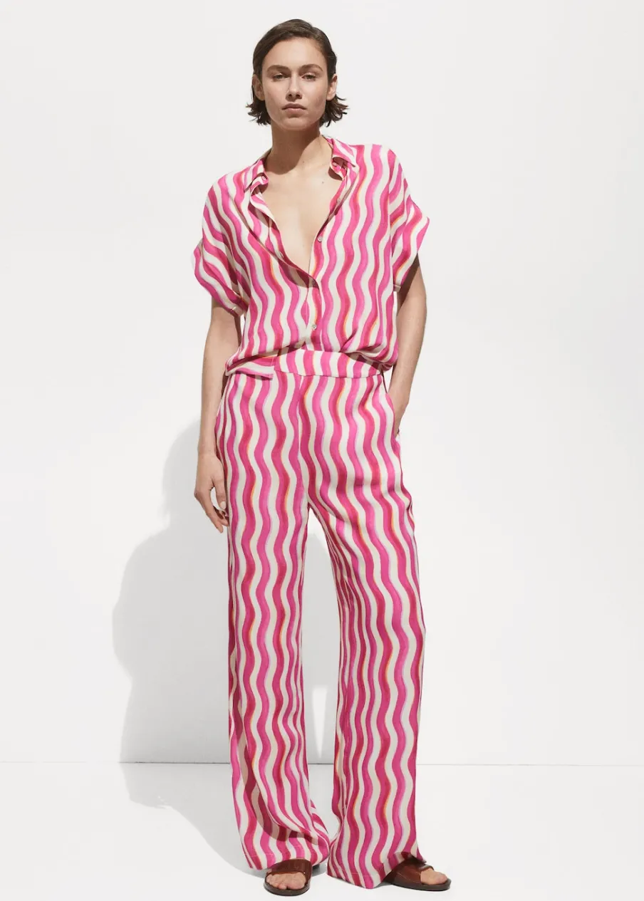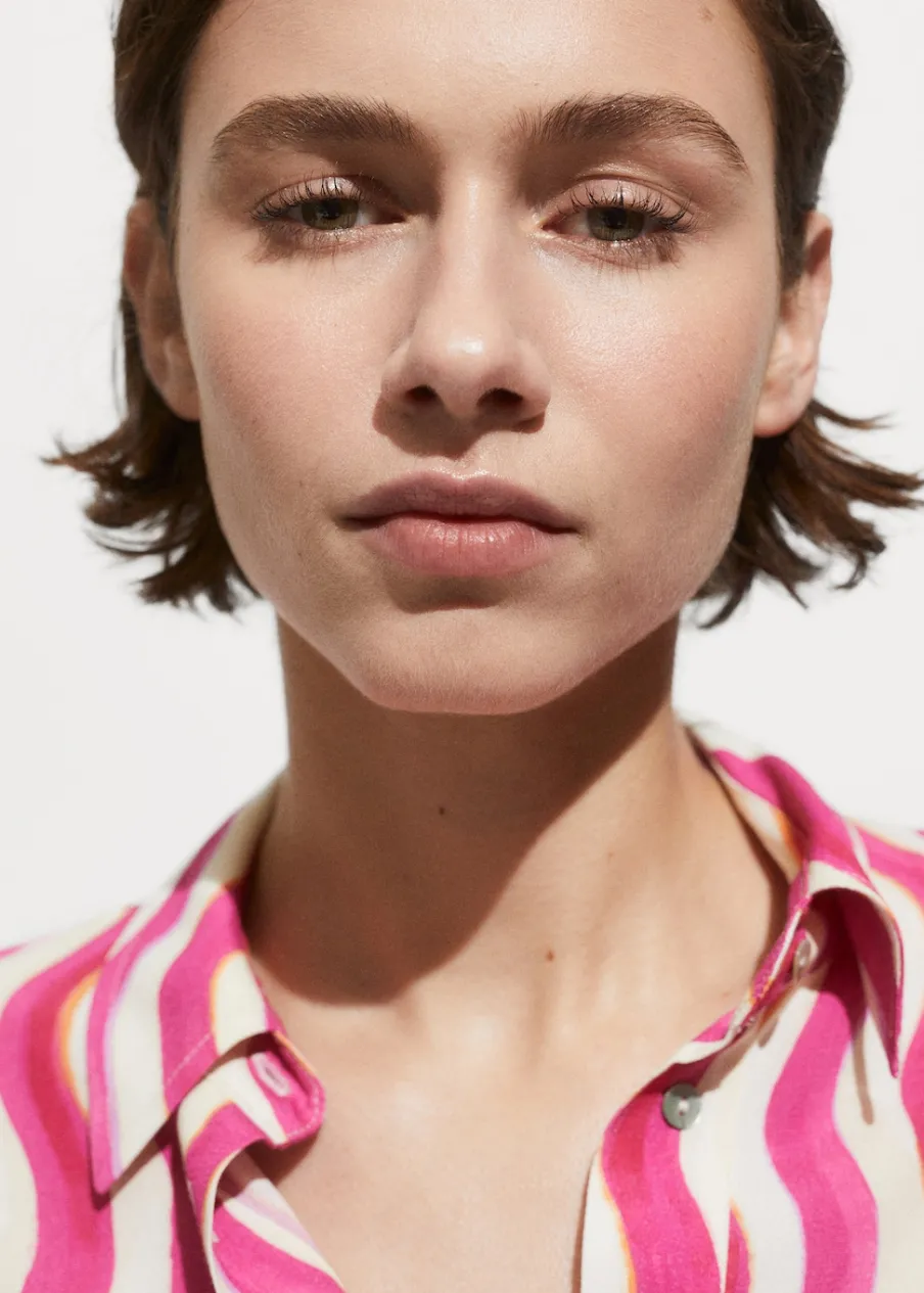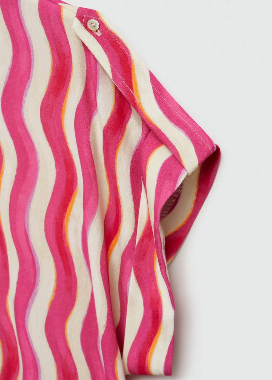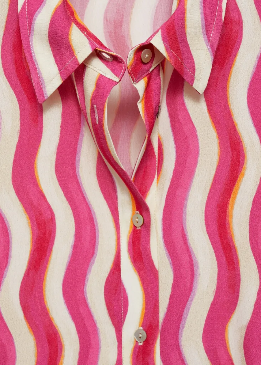 Lejąca tkanina. Model prosty. Koszulowy kołnierz. Krótki rękaw. Ozdobne guziki na rękawach. Dostępne w Plus Size. Total look. Sezon festiwalowy. Nadruk. Zapięcie na guziki z przodu.