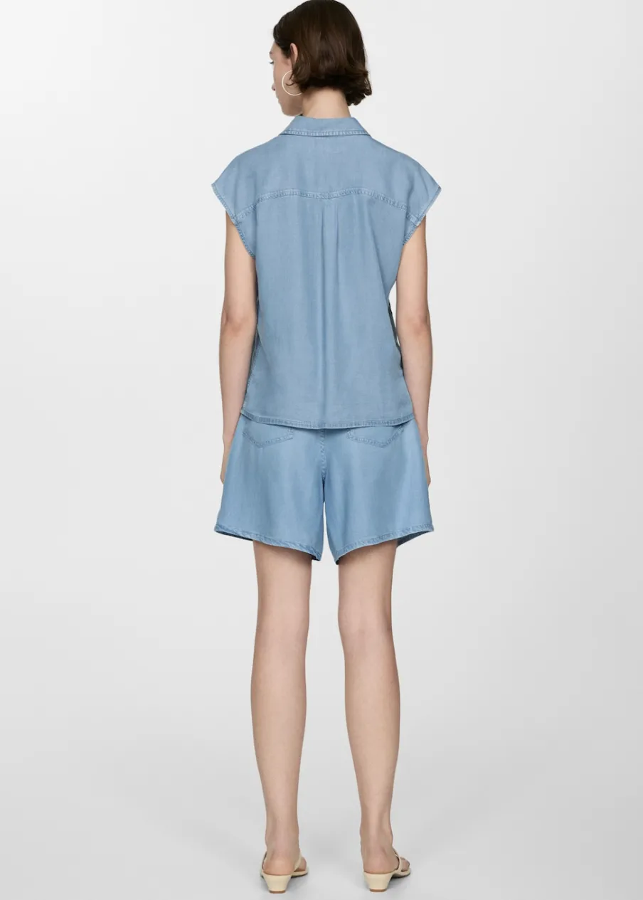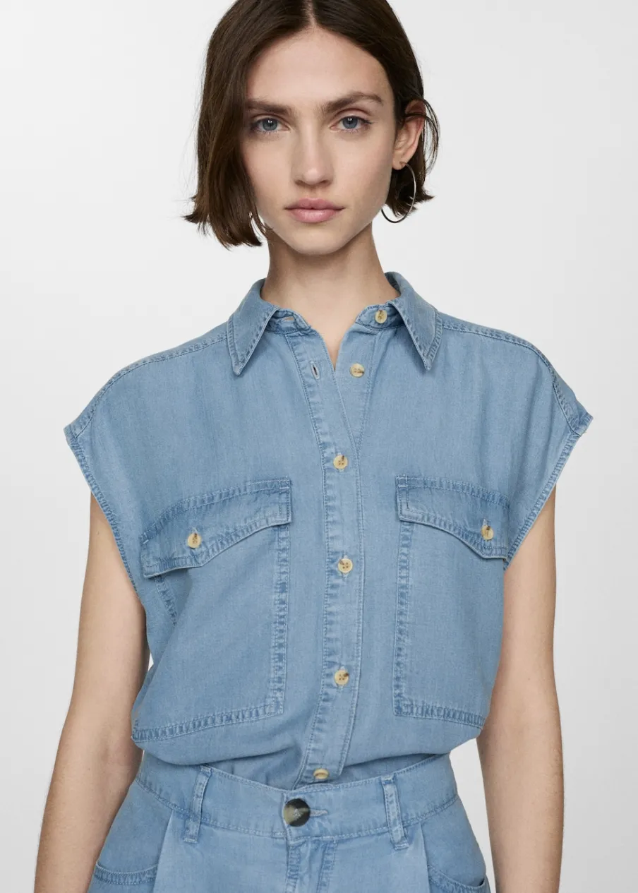 Tkanina lyocell. Kreszowana tkanina. Model prosty. Koszulowy kołnierz. Bez rękawów. Dwie kieszenie z patkami na guzik na klatce piersiowej. Dostępne w Plus Size. Zapięcie na guziki z przodu.