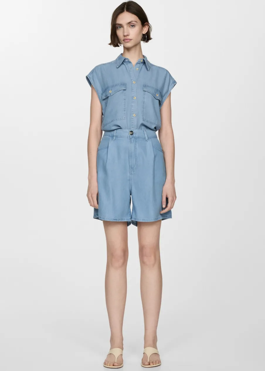OpisTkanina lyocell. Kreszowana tkanina. Model prosty. Koszulowy kołnierz. Bez rękawów. Dwie kieszenie z patkami na g…