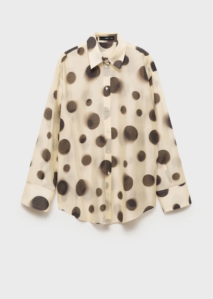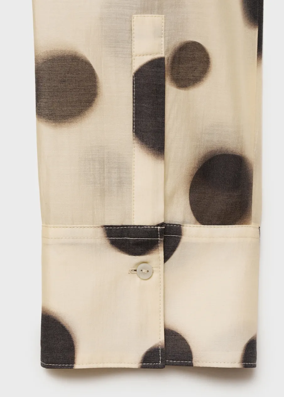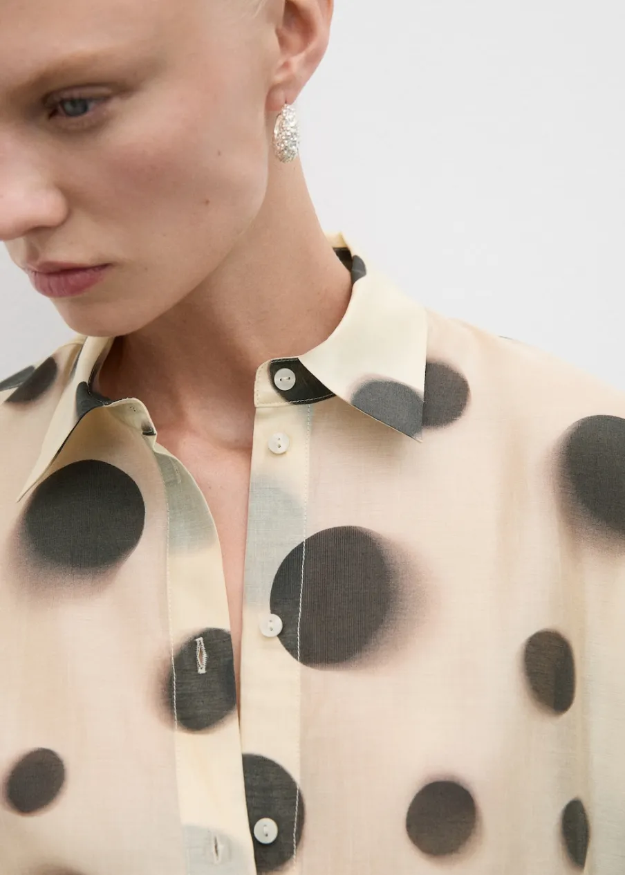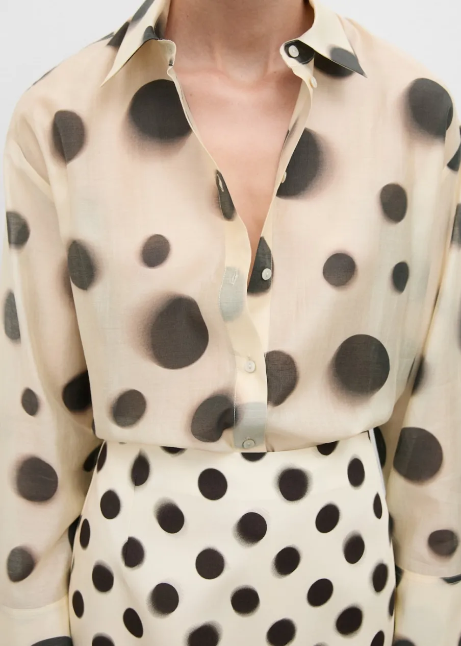 Lejąca tkanina. Tkanina mieszana z lyocellem. Model prosty. Półprzezroczysty design. Wzór w groszki. Koszulowy kołnierz. Długi rękaw z guzikami na mankietach. Zapięcie z przodu na guziki. Total look.