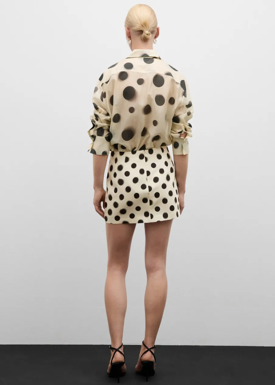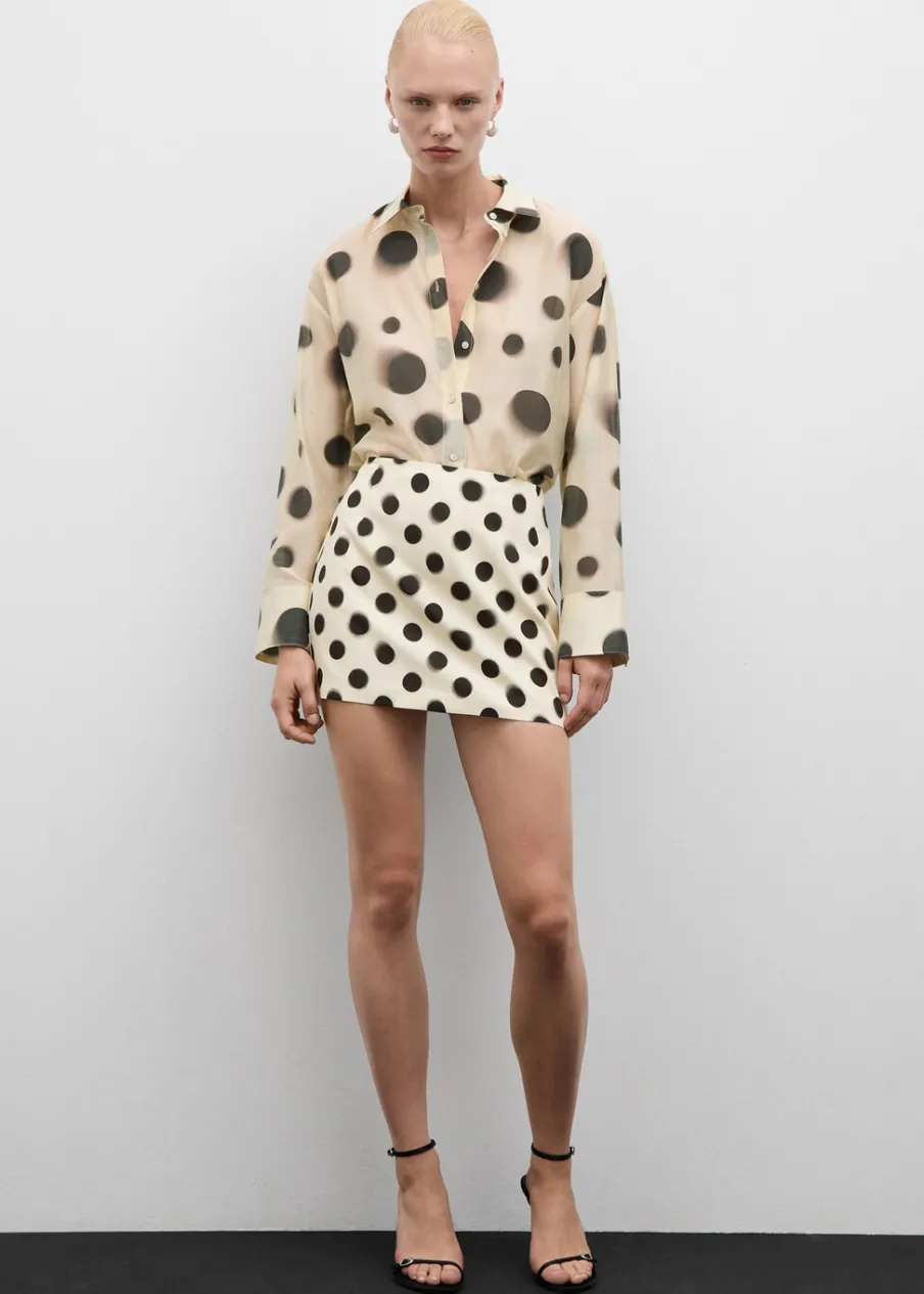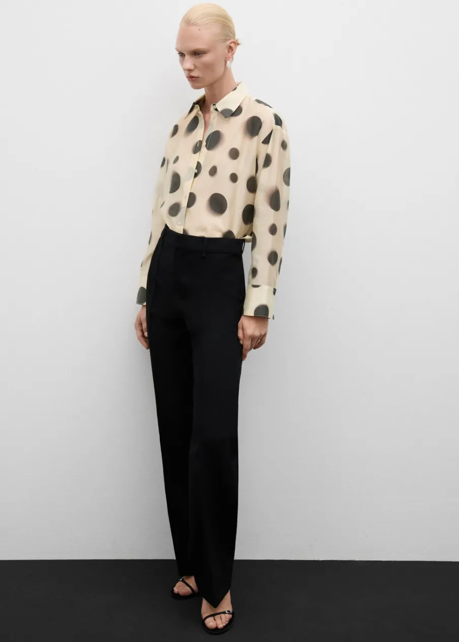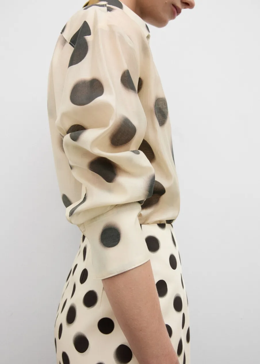 Lejąca tkanina. Tkanina mieszana z lyocellem. Model prosty. Półprzezroczysty design. Wzór w groszki. Koszulowy kołnierz. Długi rękaw z guzikami na mankietach. Zapięcie z przodu na guziki. Total look.
