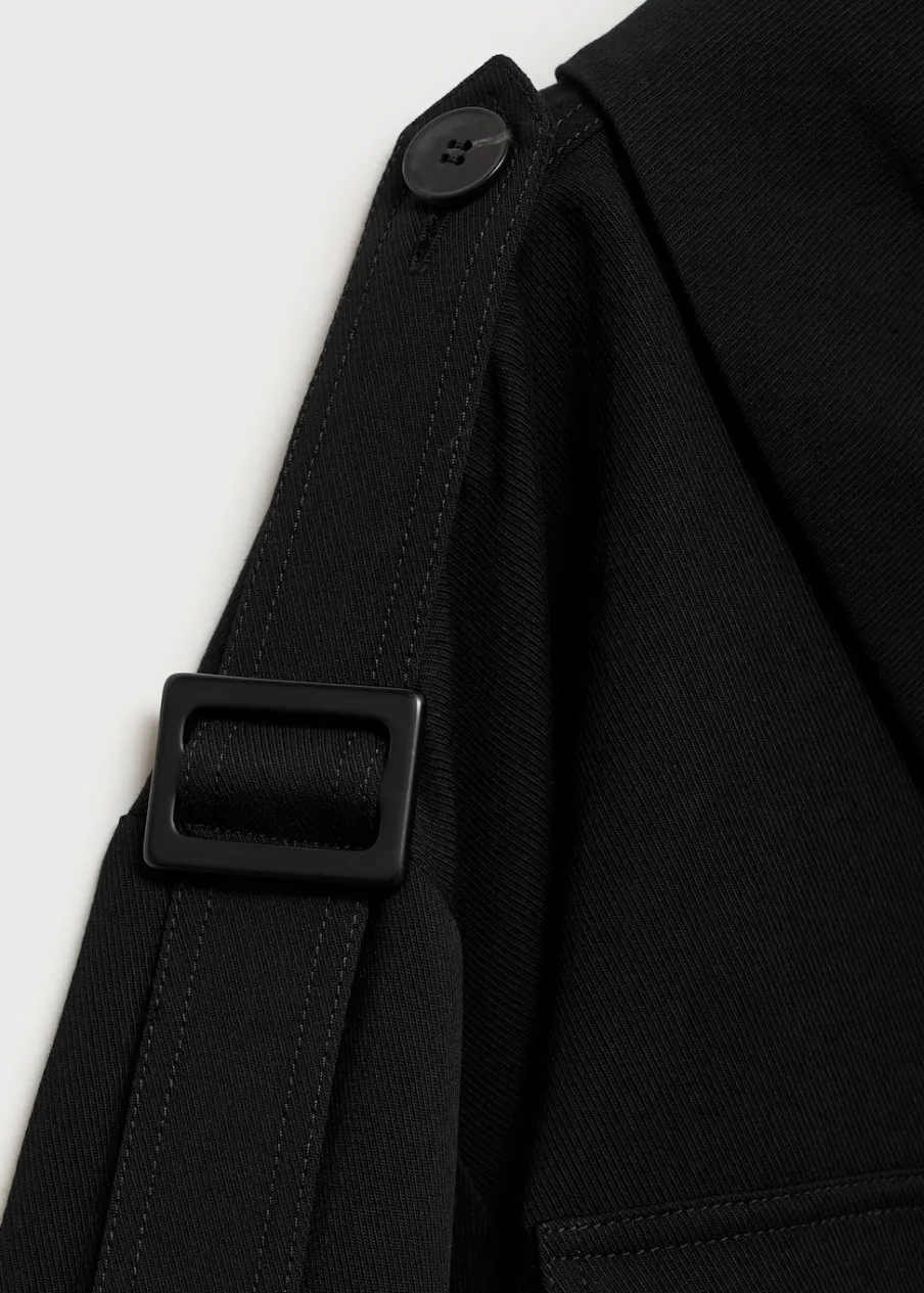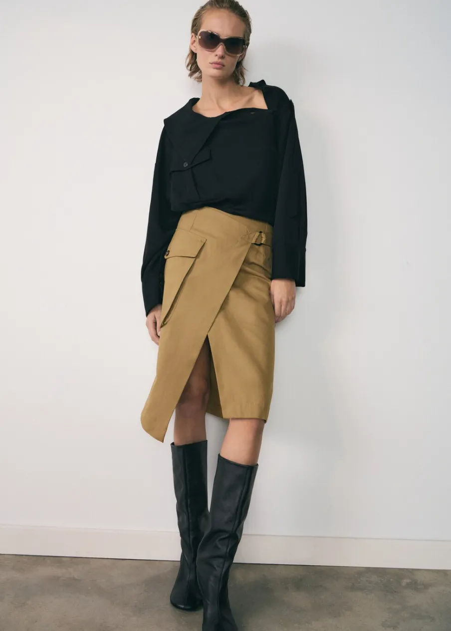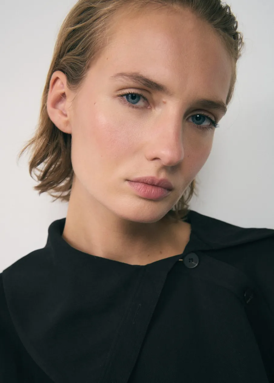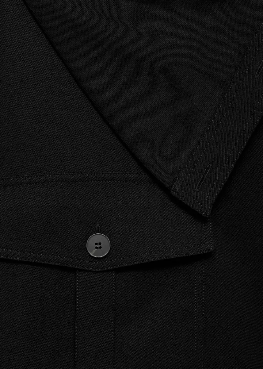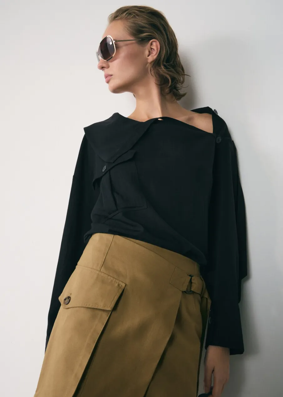 Kołnierz z klapami. Zapinana kieszeń z patką i guzikiem z przodu. Zapięcie na guzik pod szyją. Modelka ma 178 cm wzrostu i nosi rozmiar S/36. Tkanina mieszana z lyocellem. Asymetryczny krój. Asymetryczny dekolt. Długi rękaw. Model prosty.