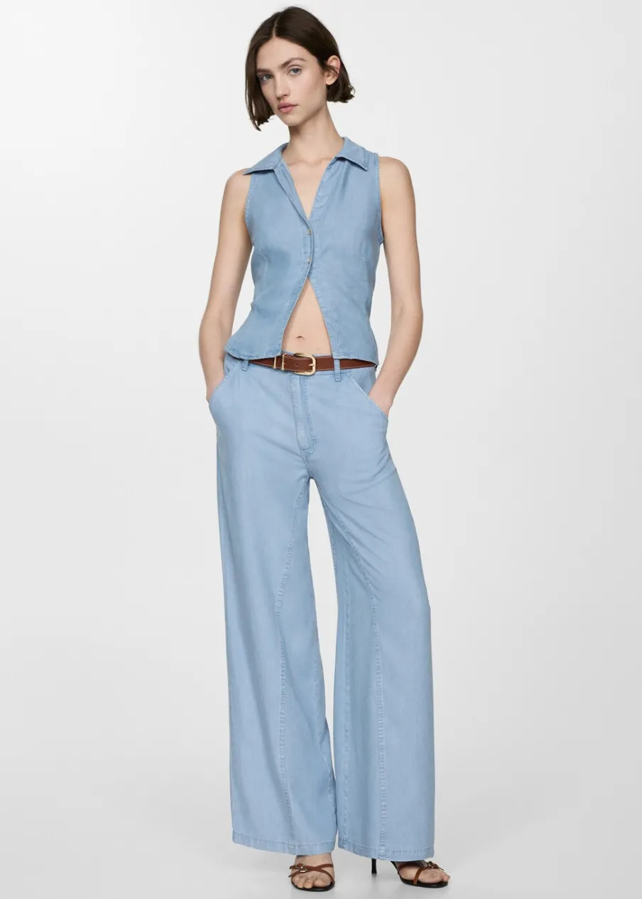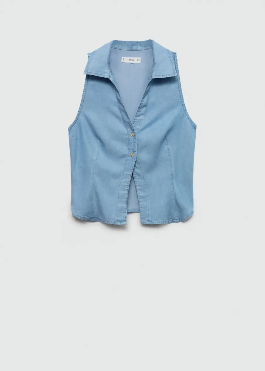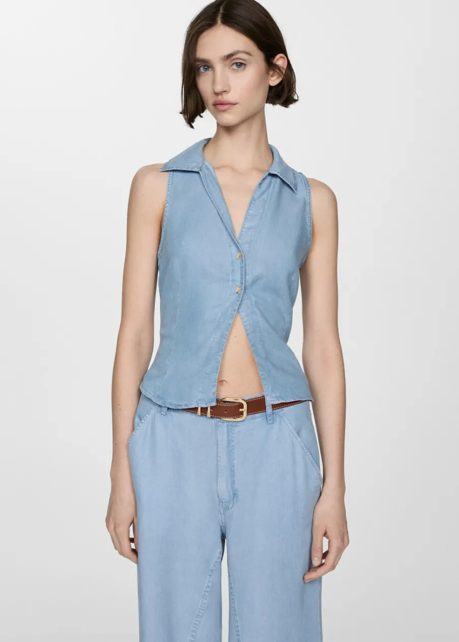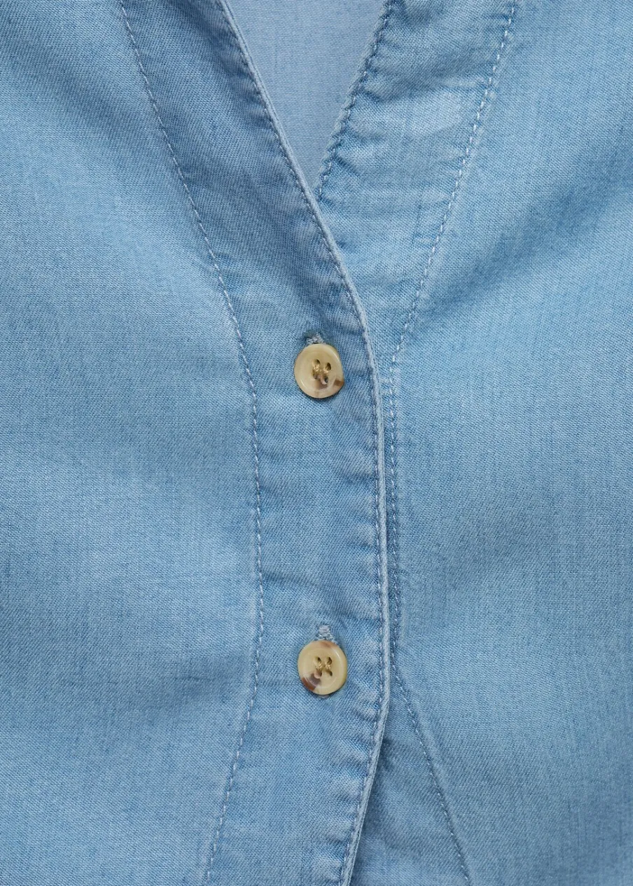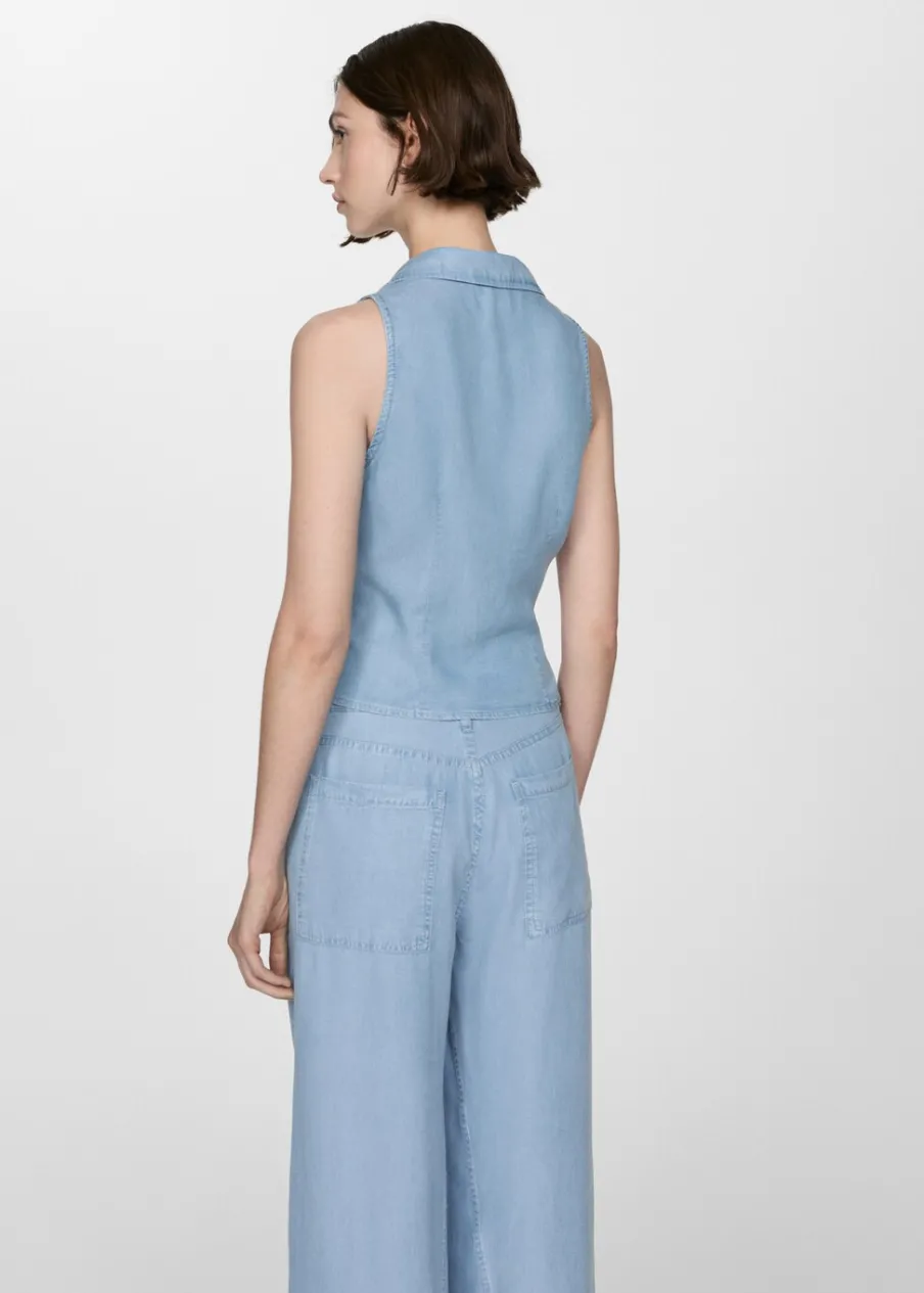 Tkanina lyocell. Kreszowana tkanina. Model prosty. Koszulowy kołnierz. Bez rękawów. Detal z rozcięciem. Total look. Zapięcie na guziki z przodu.