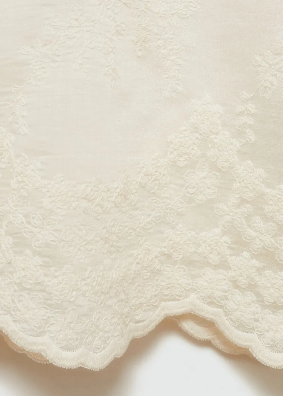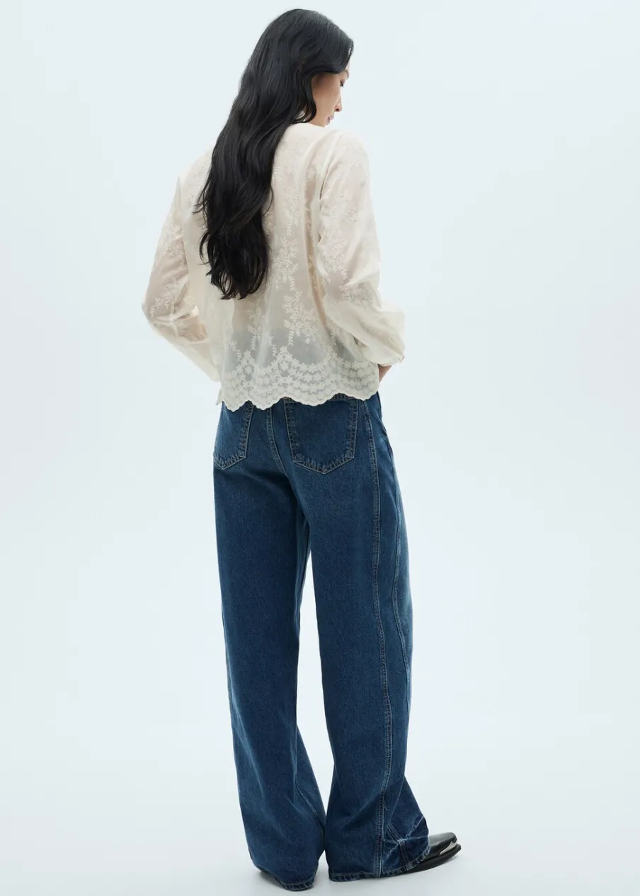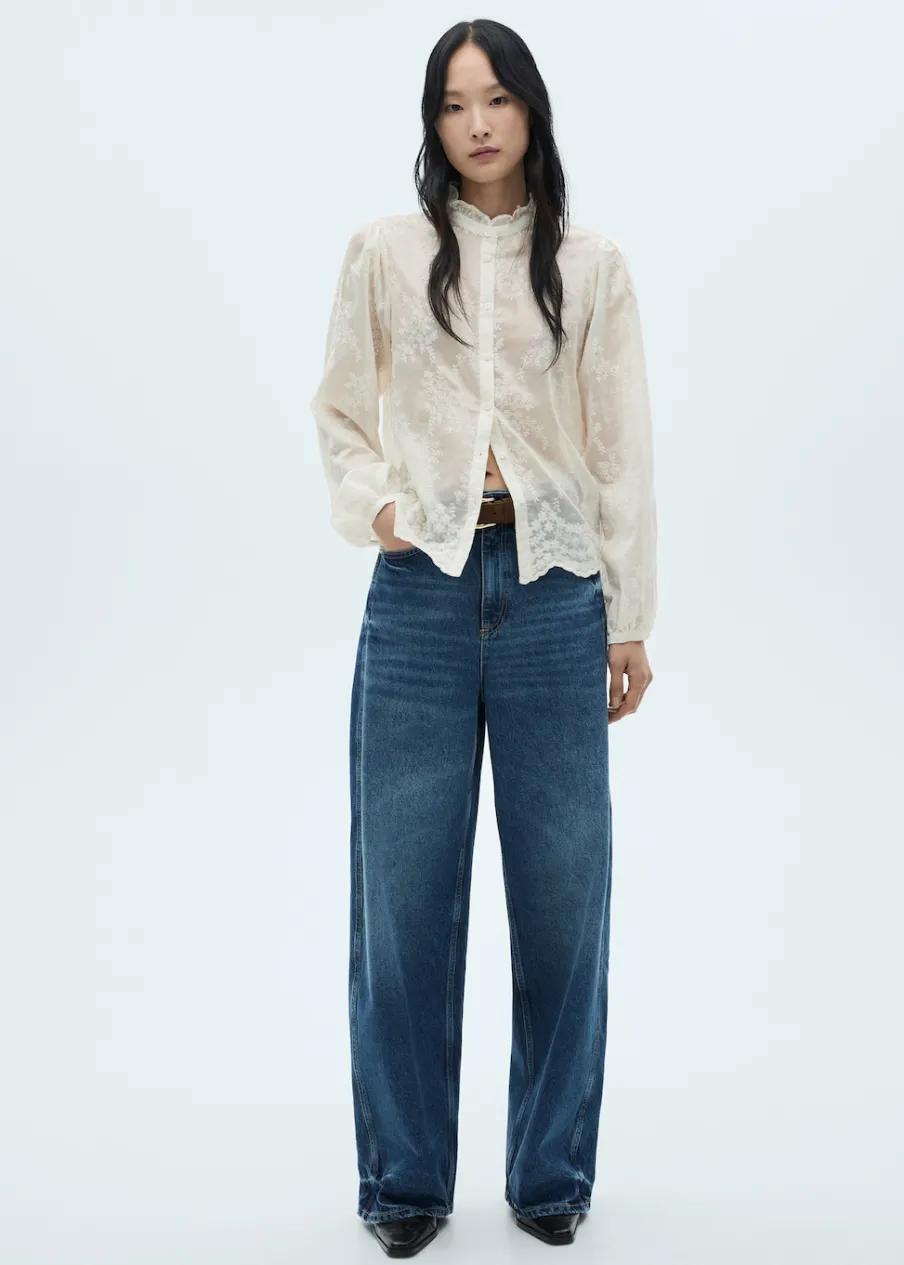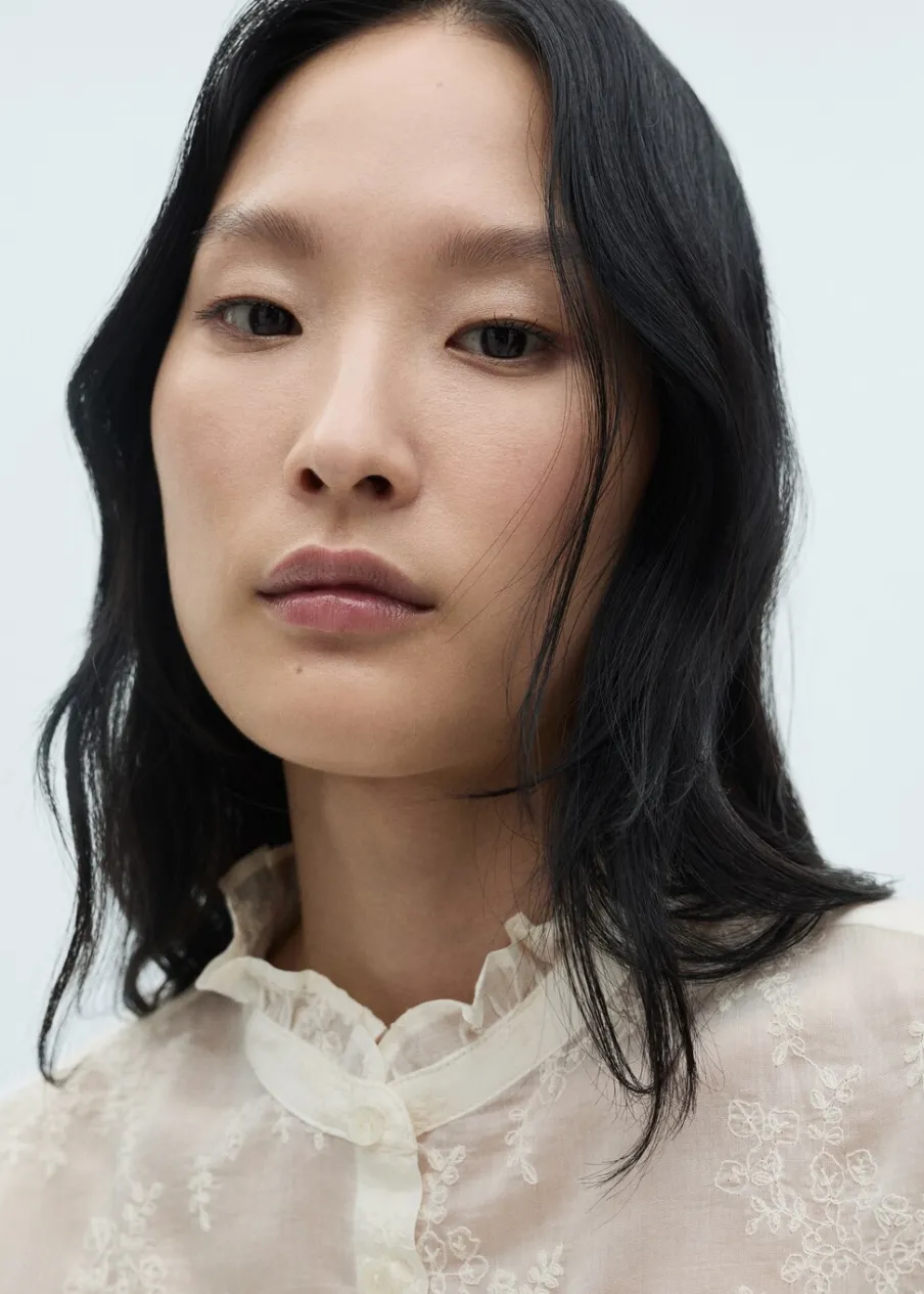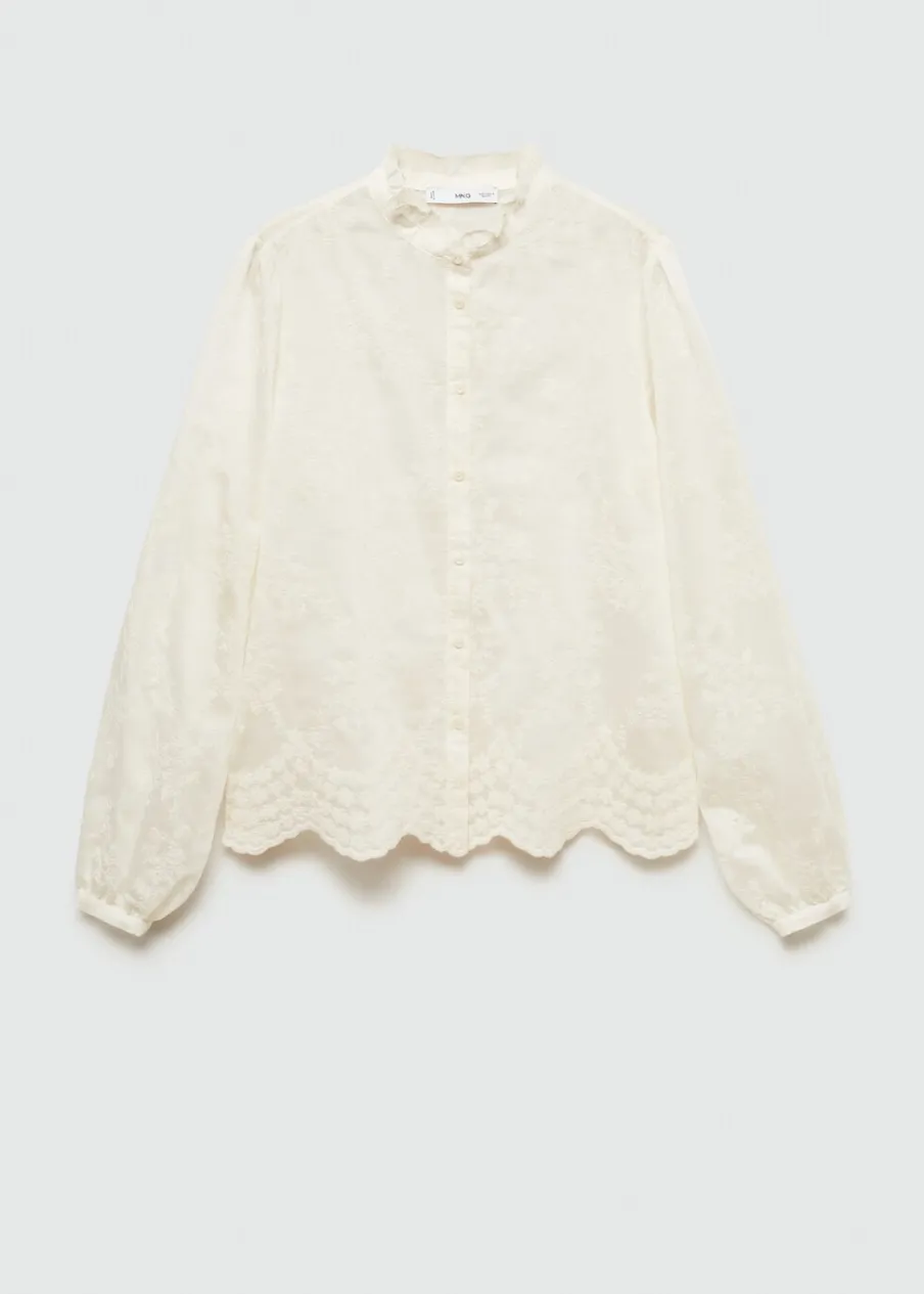 Mieszanka bawełny i lyocellu. Haftowana tkanina. Model prosty. Dekolt z listwą. Długi rękaw. Modelka ma 175 cm wzrostu i nosi rozmiar S/36. Zapięcie na guziki z przodu.