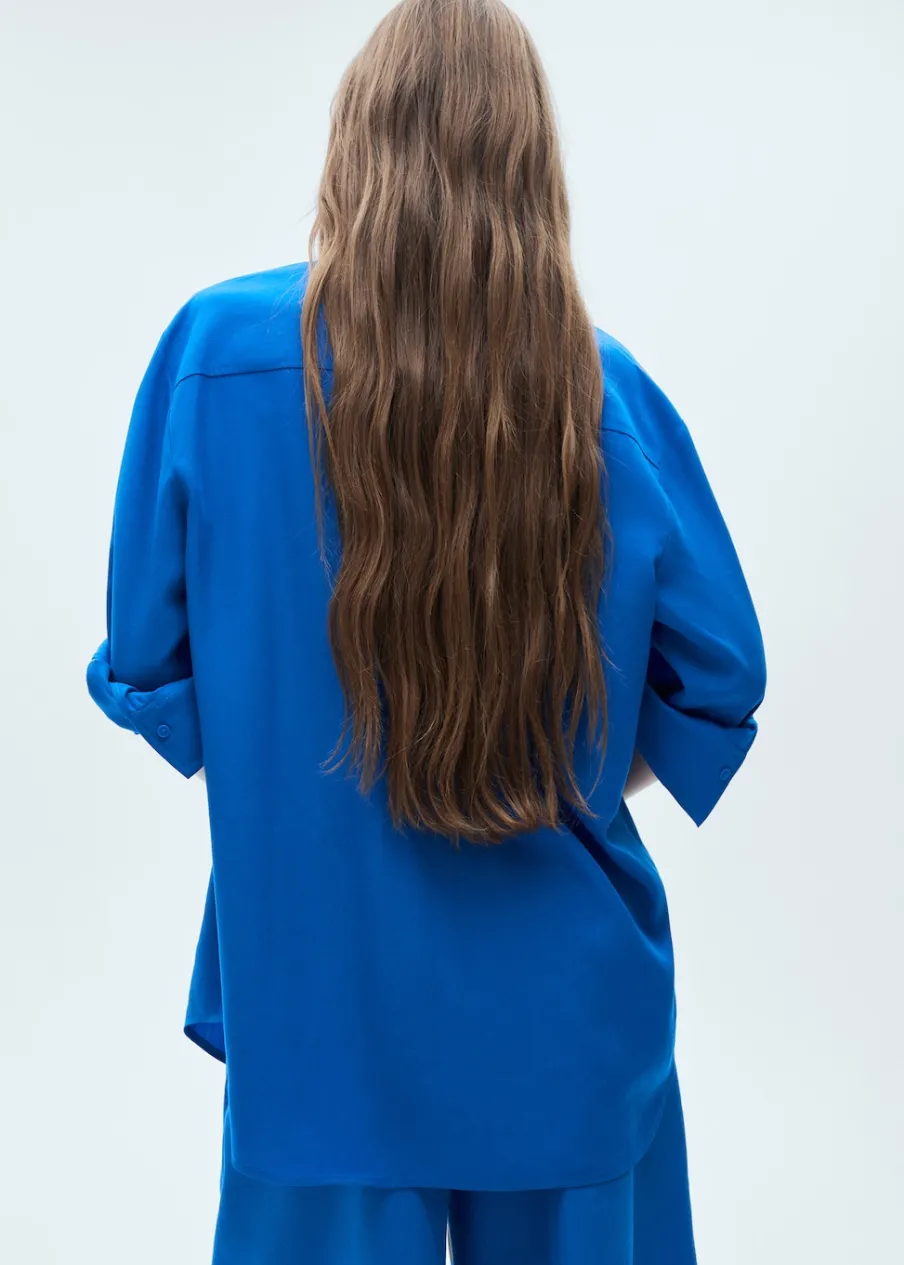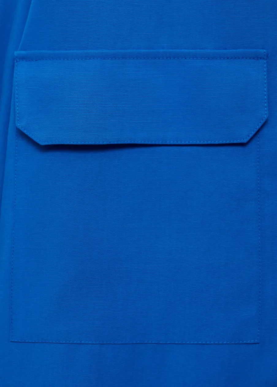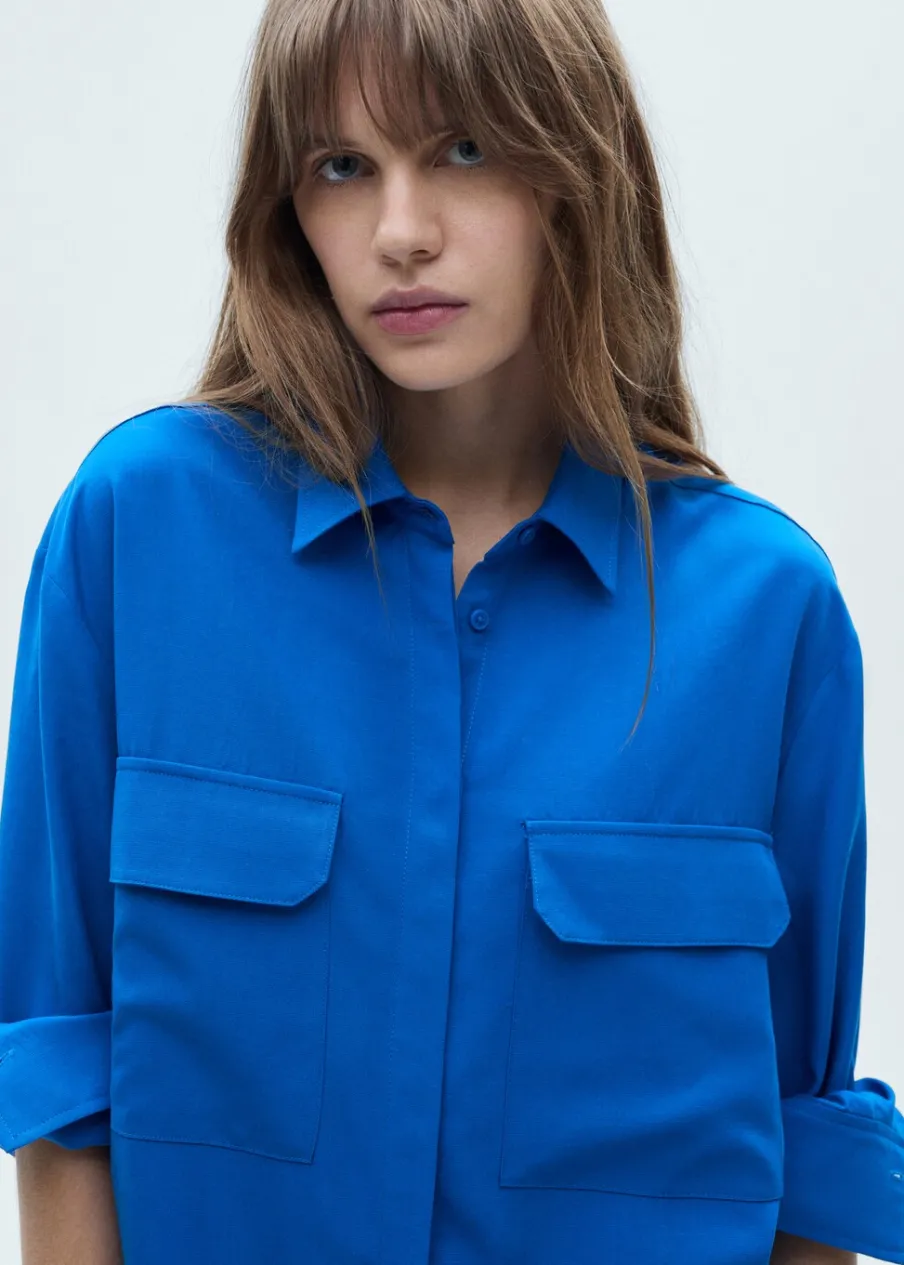 Tkanina mieszana z lnu i lyocellu. Lejąca tkanina. Model długi. Model prosty. Koszulowy kołnierz. Długi rękaw z guzikami na mankietach. Kryte zapięcie na guziki z listwą z przodu. Dwie kieszenie z patkami z przodu. Modelka ma 178 cm wzrostu i nosi rozmiar S/36.