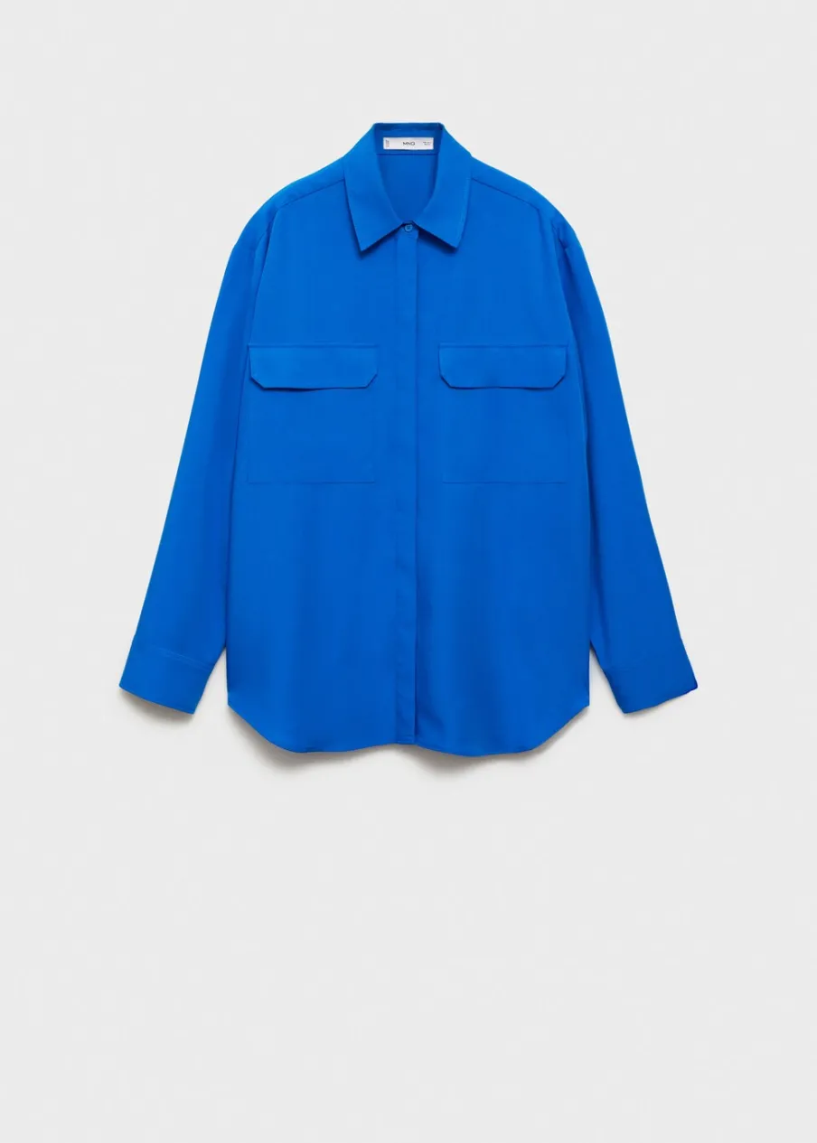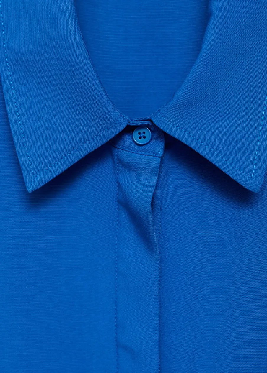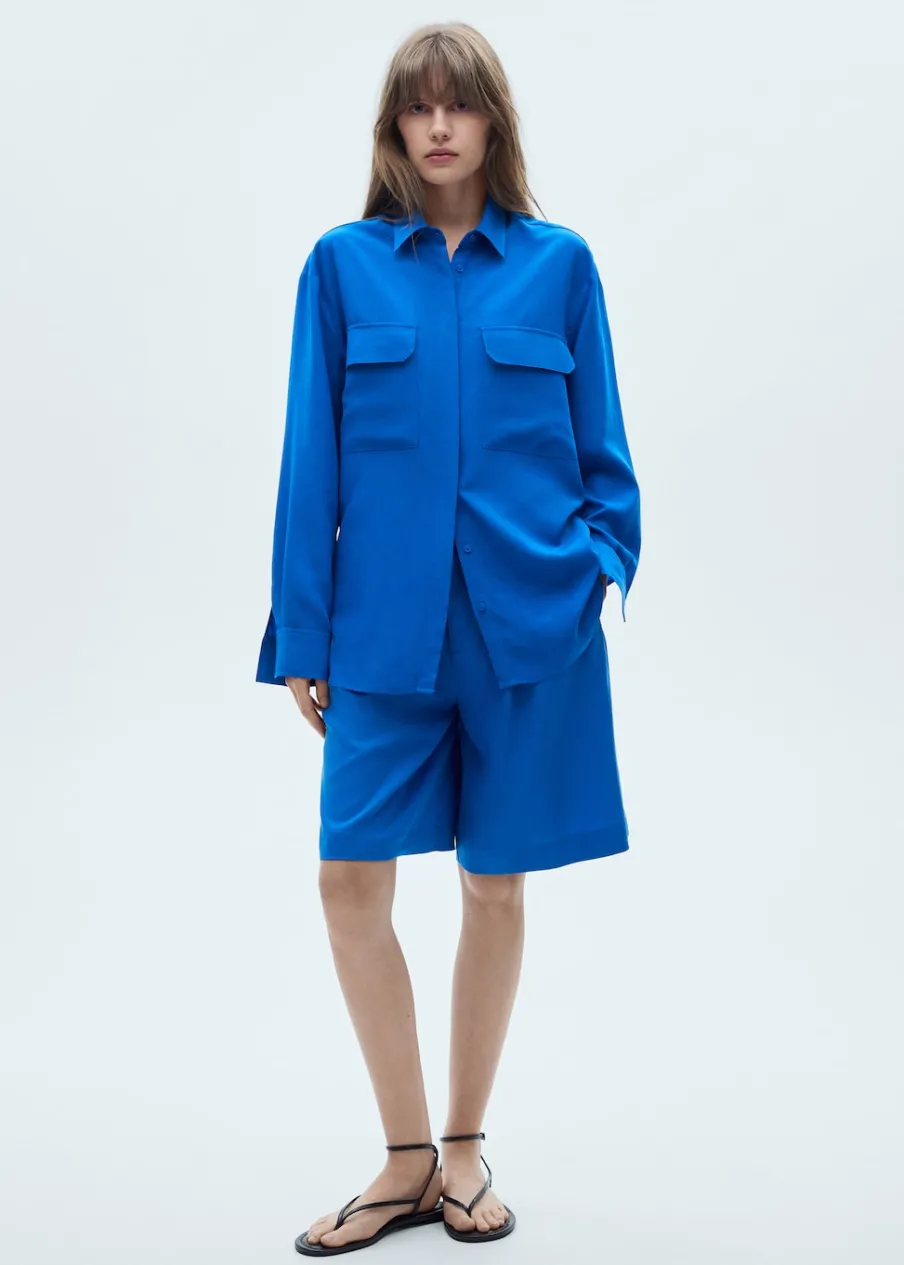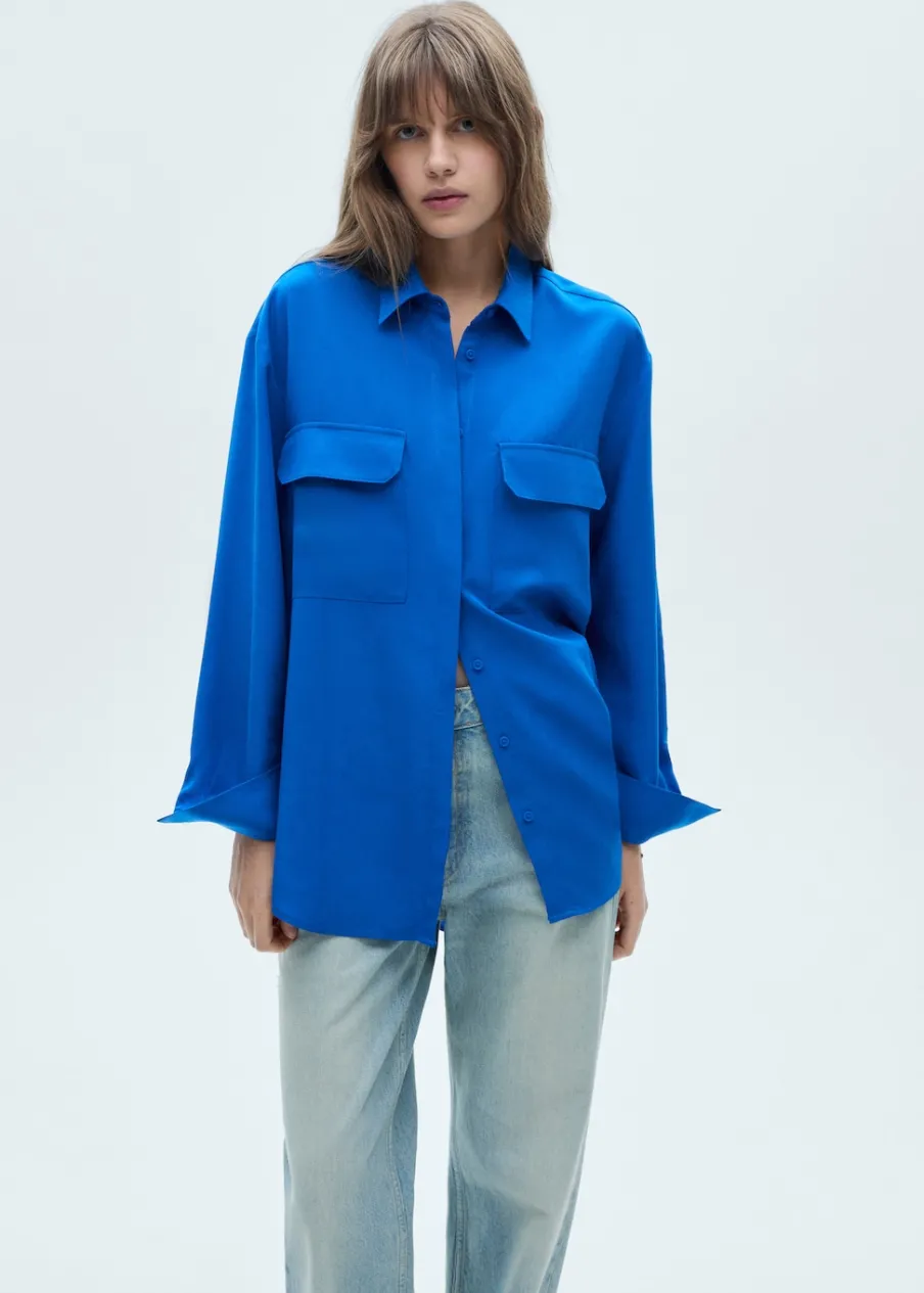 Tkanina mieszana z lnu i lyocellu. Lejąca tkanina. Model długi. Model prosty. Koszulowy kołnierz. Długi rękaw z guzikami na mankietach. Kryte zapięcie na guziki z listwą z przodu. Dwie kieszenie z patkami z przodu. Modelka ma 178 cm wzrostu i nosi rozmiar S/36.