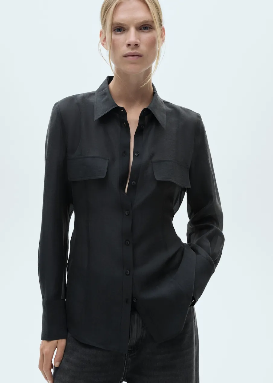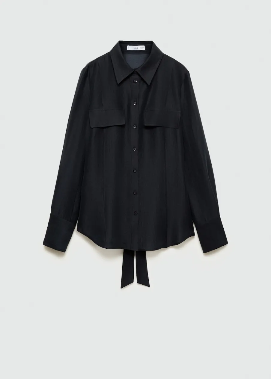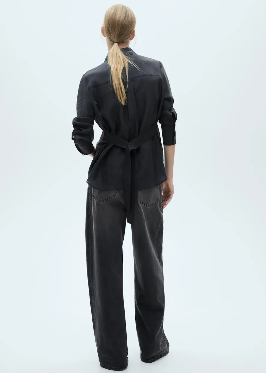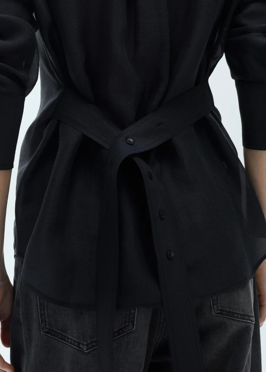Tkanina mieszana z lyocellem. Model prosty. Koszulowy kołnierz. Długi rękaw z guzikami na mankietach. Dwie kieszenie z patką na piersi. Zapięcie na regulowane wiązanie. Modelka ma 178 cm wzrostu i nosi rozmiar S/36. Zapięcie na guziki z przodu.