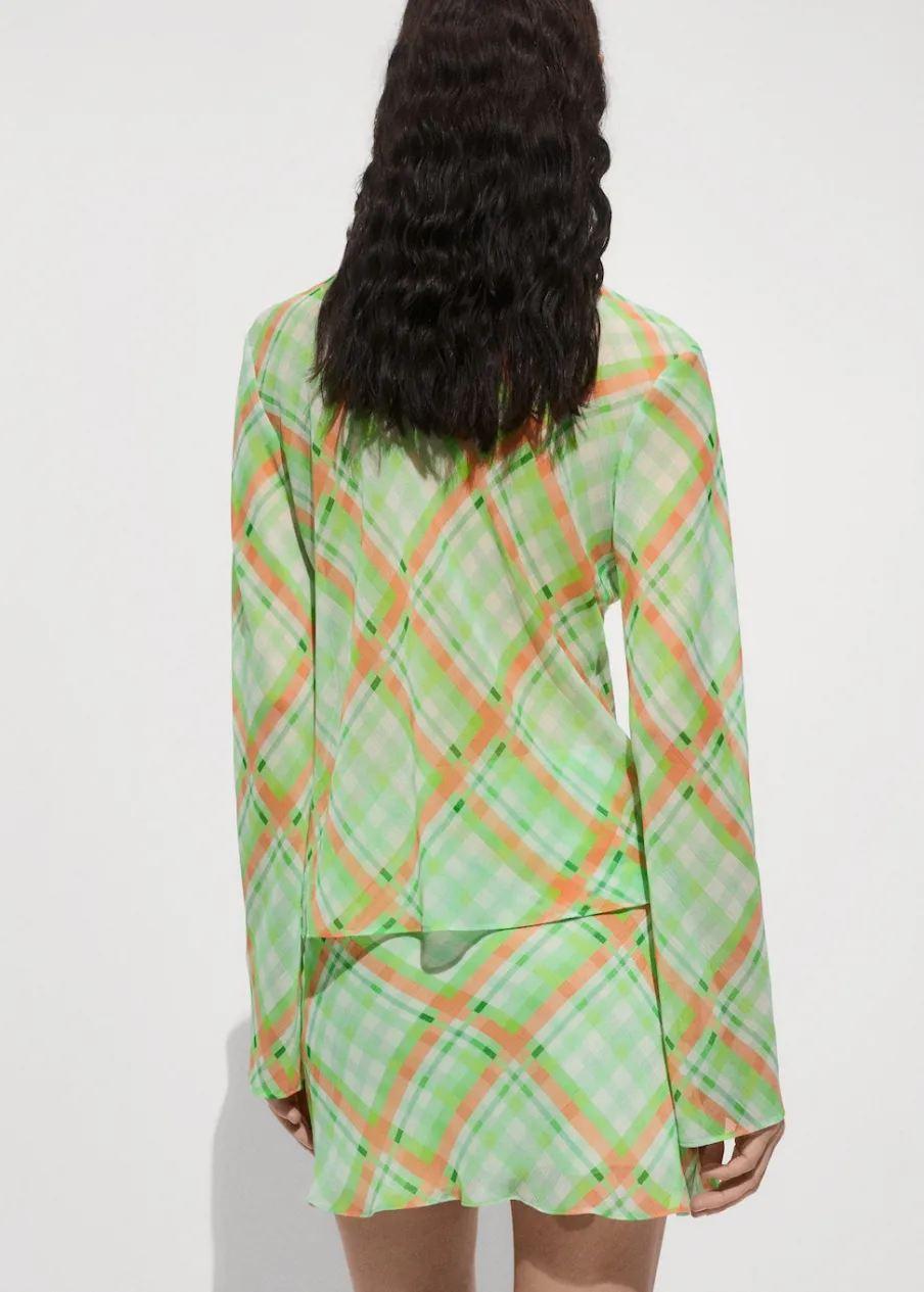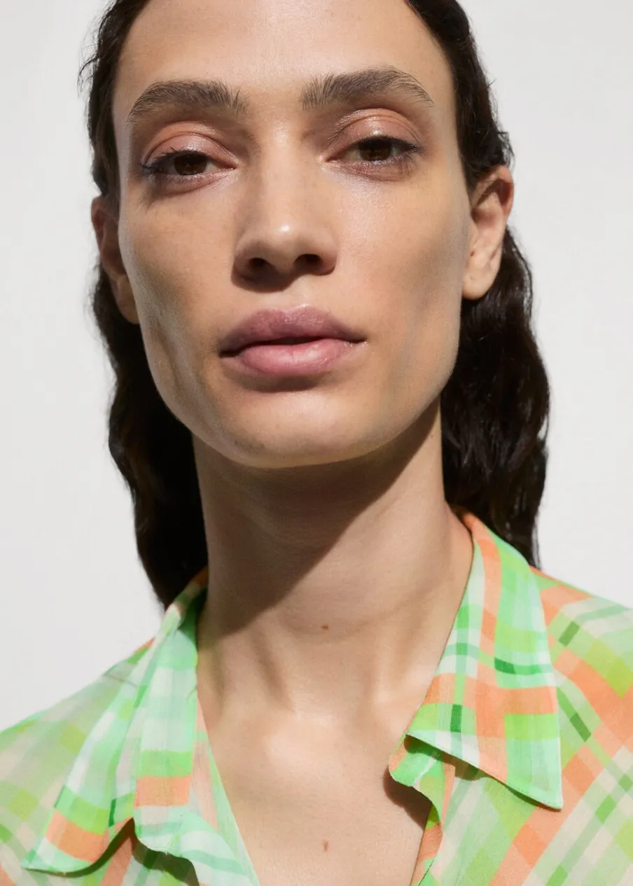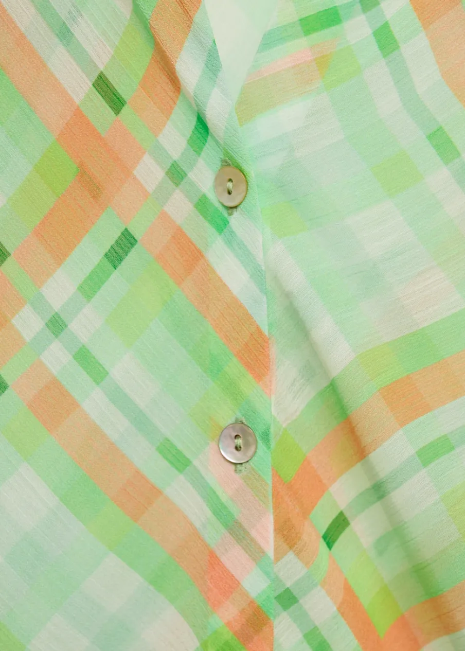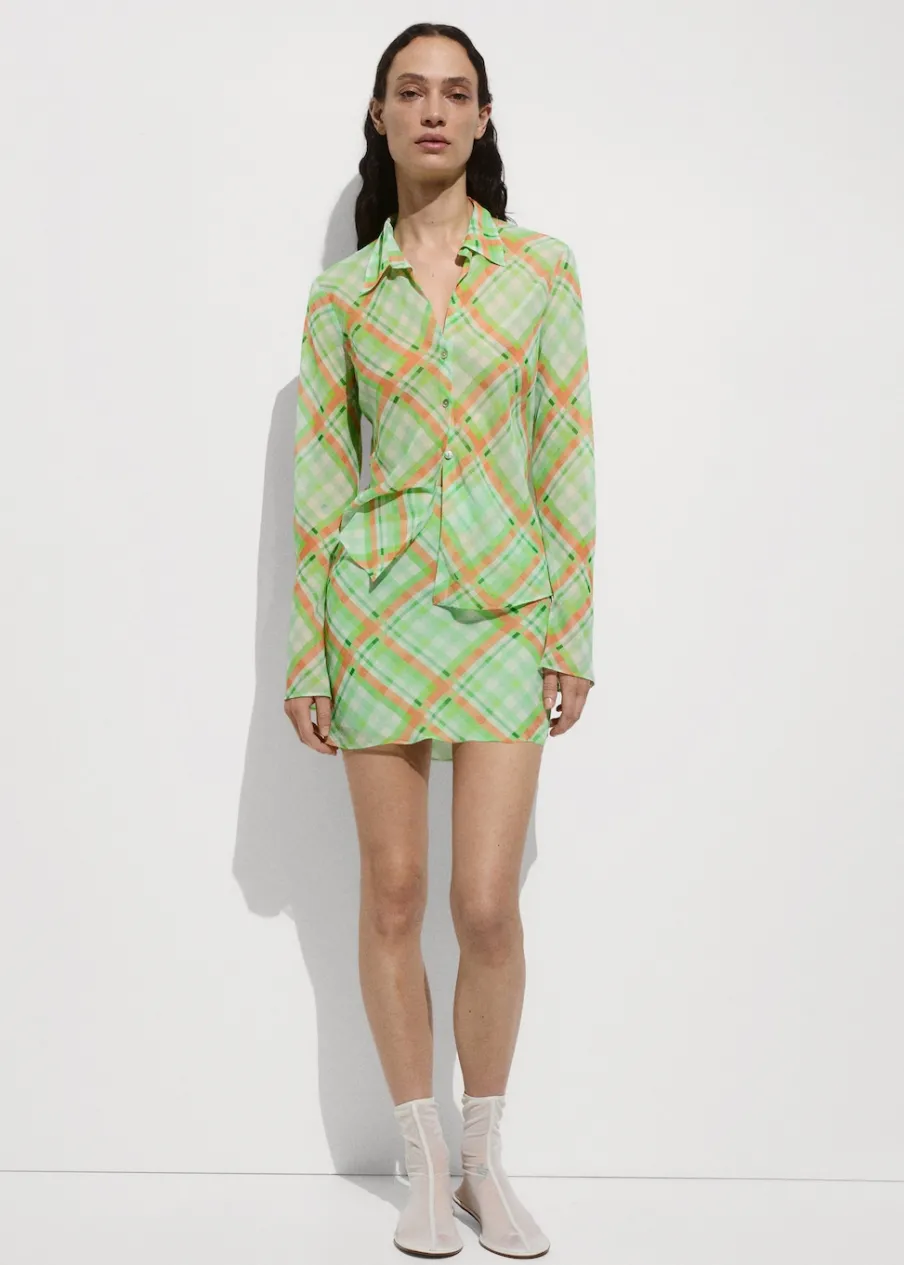 OpisLejąca tkanina. Model prosty. Wzór w kratę. Koszulowy kołnierz. Długi rękaw. Total look. Zapięcie na guziki z…