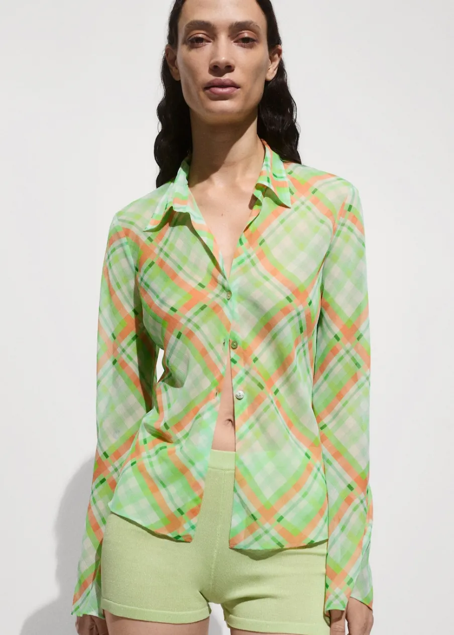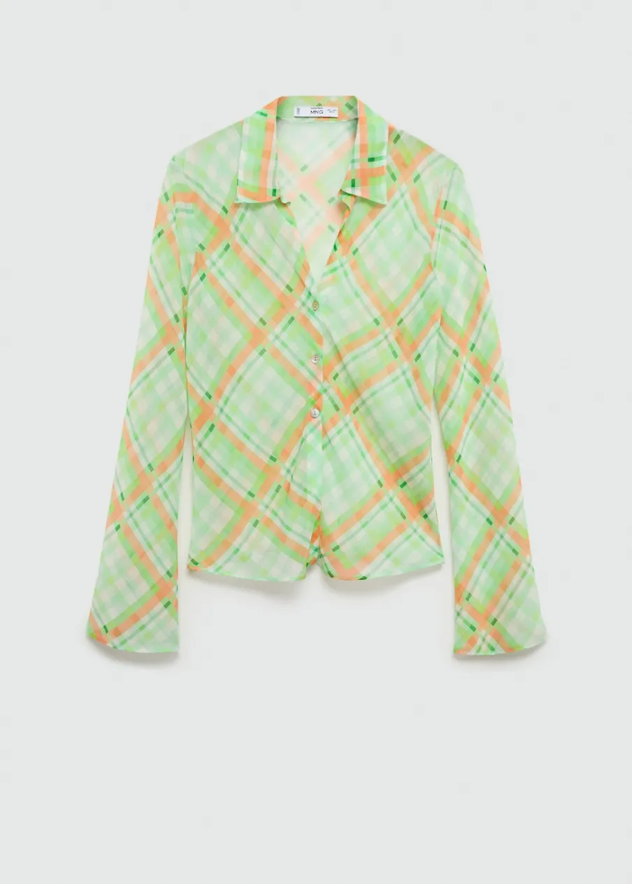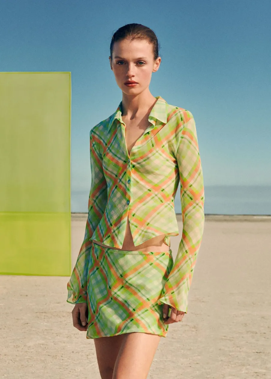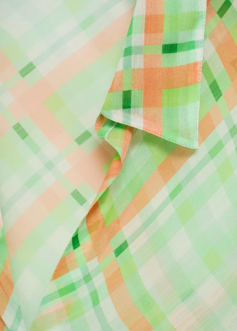 OpisLejąca tkanina. Model prosty. Wzór w kratę. Koszulowy kołnierz. Długi rękaw. Total look. Zapięcie na guziki z…