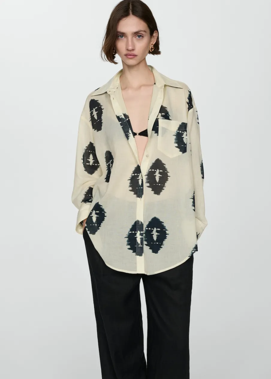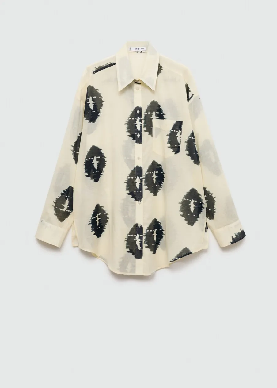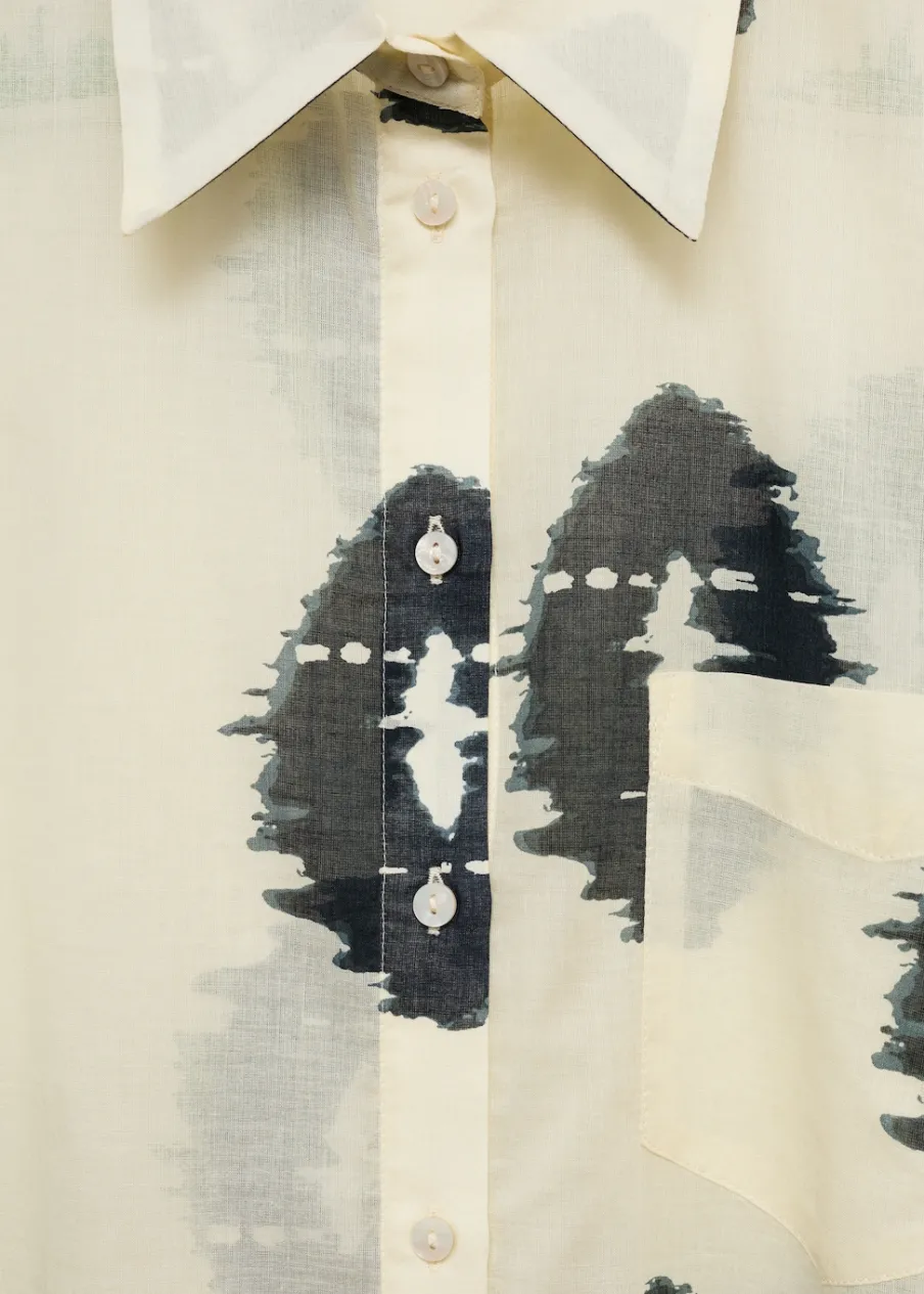 Model oversize. Model długi. Półprzezroczysty design. Koszulowy kołnierz. Długi rękaw z guzikami na mankietach. Total look. Nadruk. Tkanina z 100% bawełny. Zapięcie na guziki z przodu.