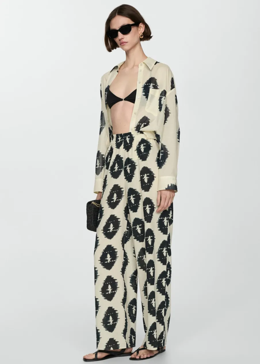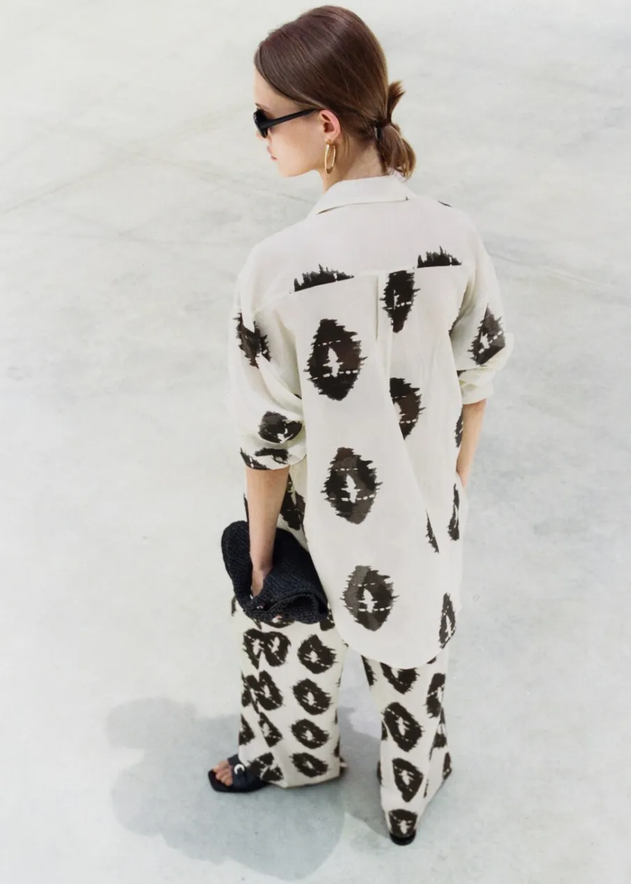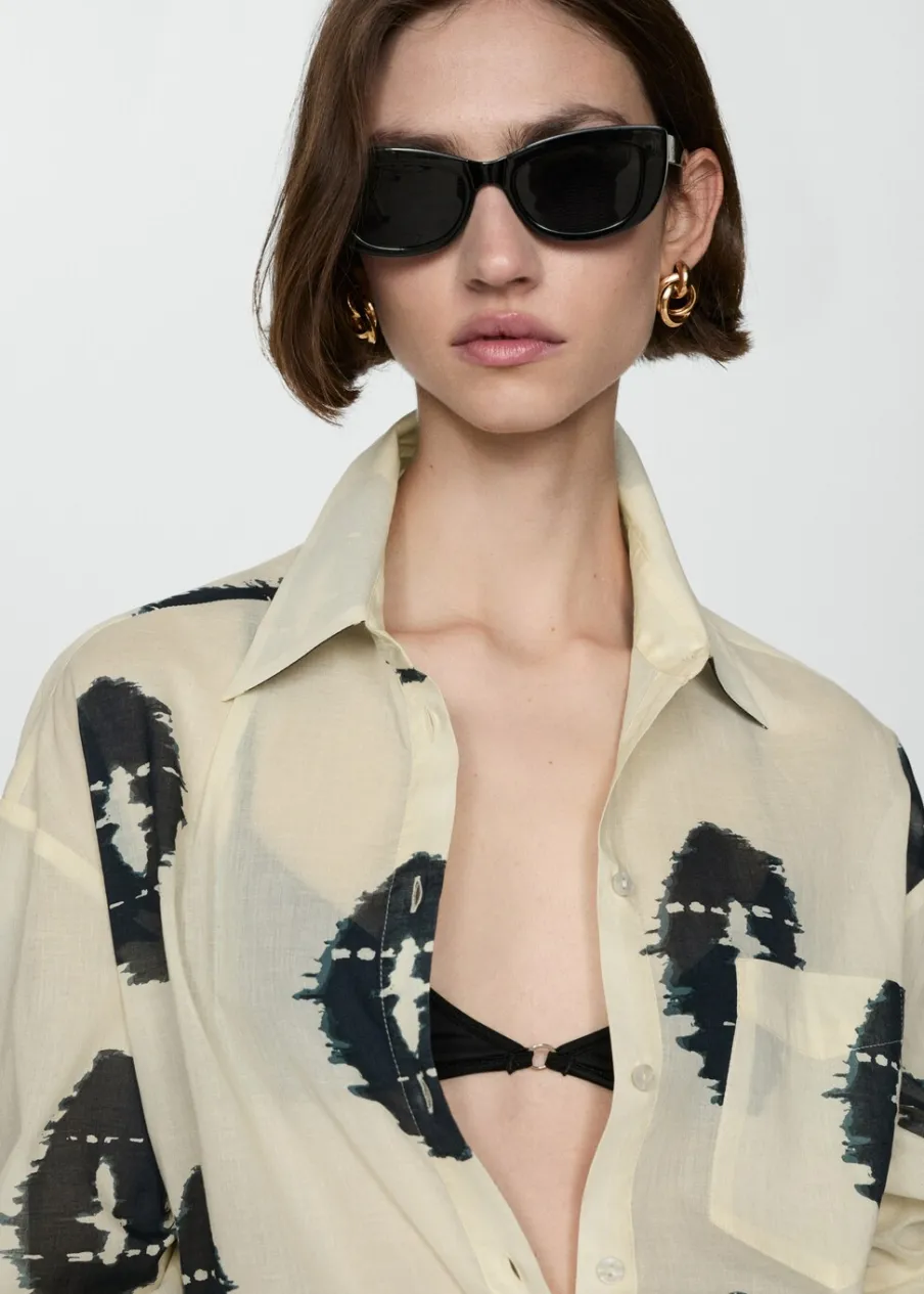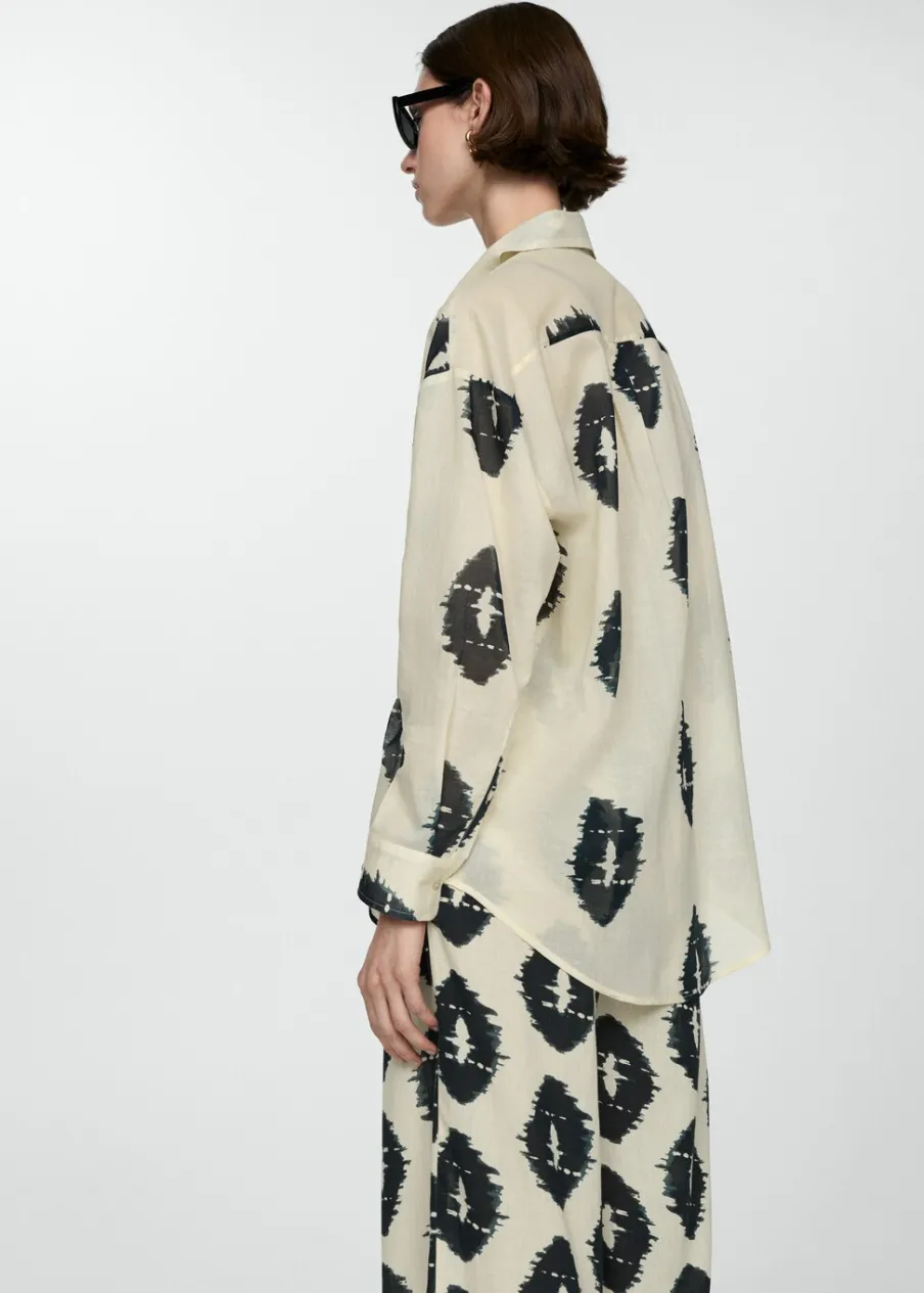 Model oversize. Model długi. Półprzezroczysty design. Koszulowy kołnierz. Długi rękaw z guzikami na mankietach. Total look. Nadruk. Tkanina z 100% bawełny. Zapięcie na guziki z przodu.