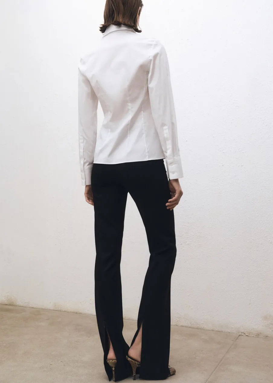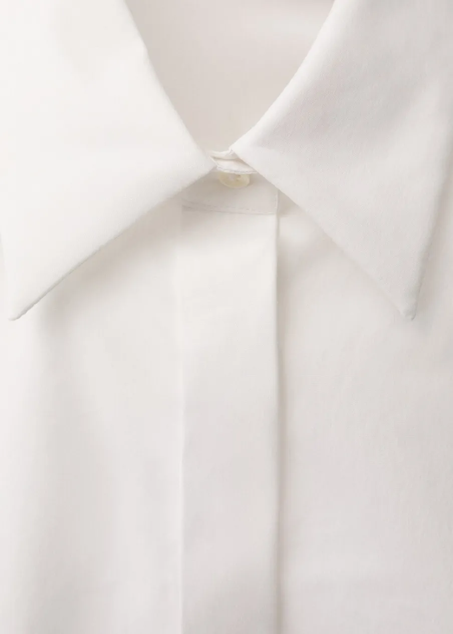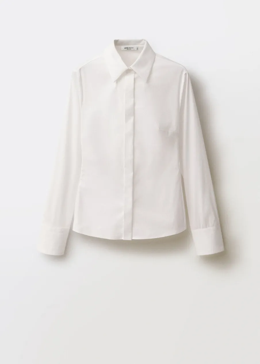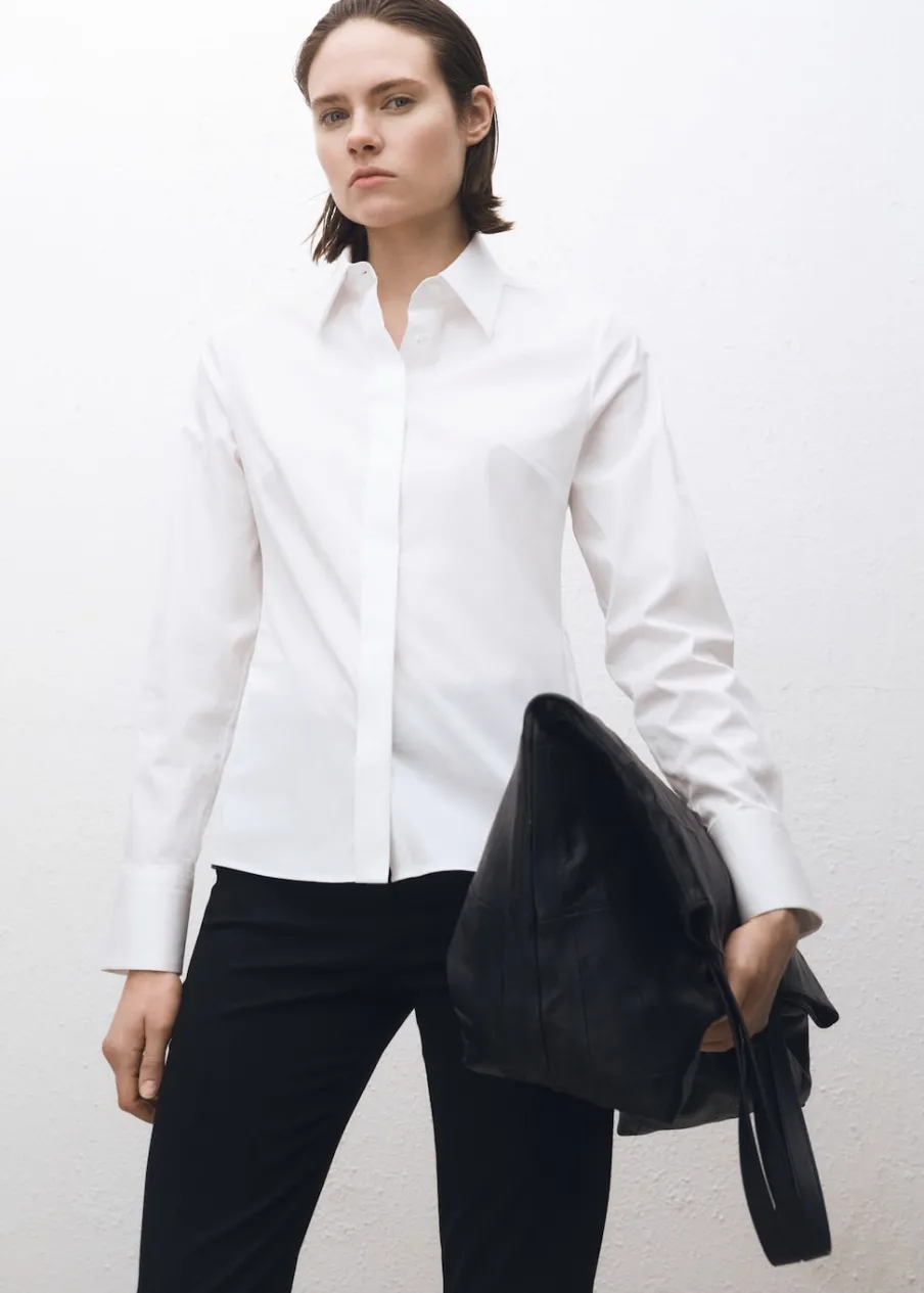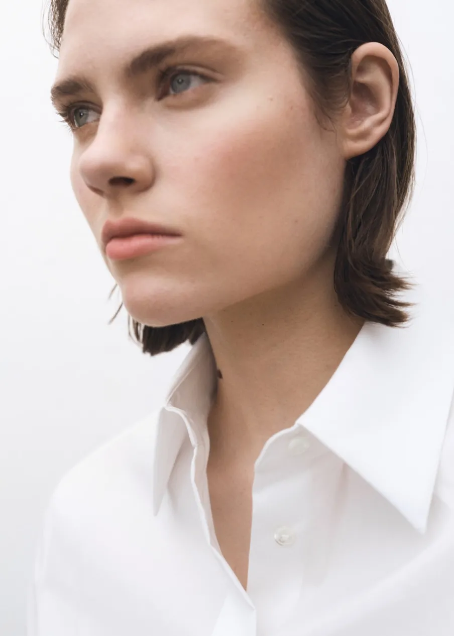 Tkanina z bawełnianej popeliny. Model wcięty. Koszulowy kołnierz. Długi rękaw z guzikami na mankietach. Zapięcie na guziki z przodu. Kolekcja Selection.