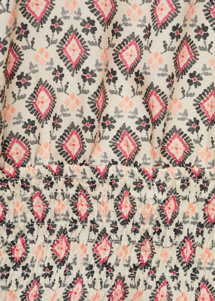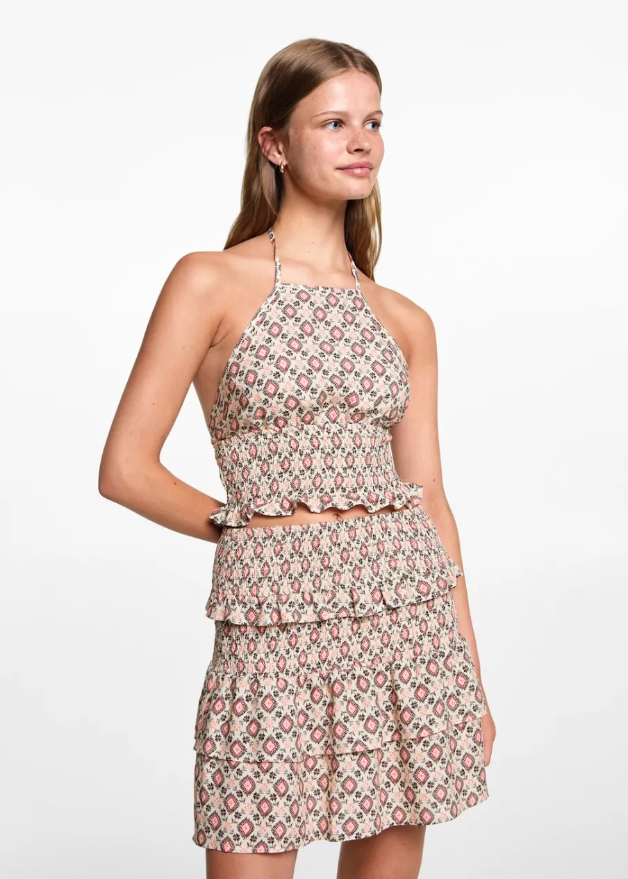 Krótki krój. Ozdobne marszczenie. Cienkie, regulowane ramiączka. Wiązanie przy szyi i na plecach. Nadruk. Tkanina z wiskozy.