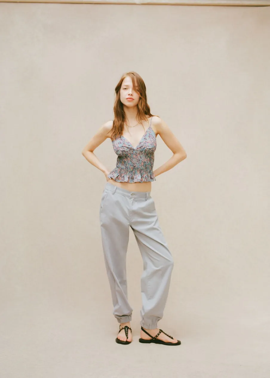 OpisTotal look. Kwiatowy wzór. Model prosty. Deseń crop. Dekolt V. Ozdobne marszczenie. Cienkie ramiączka.