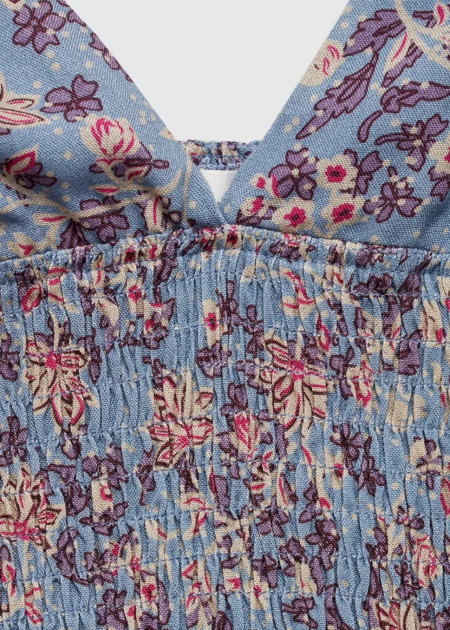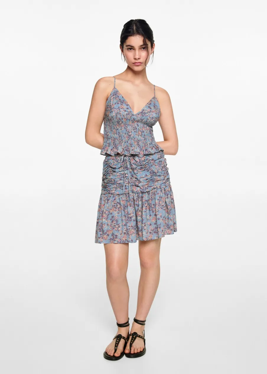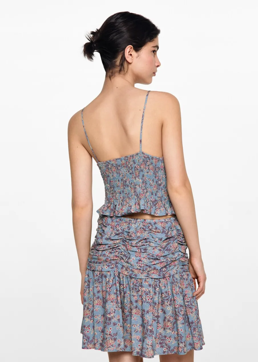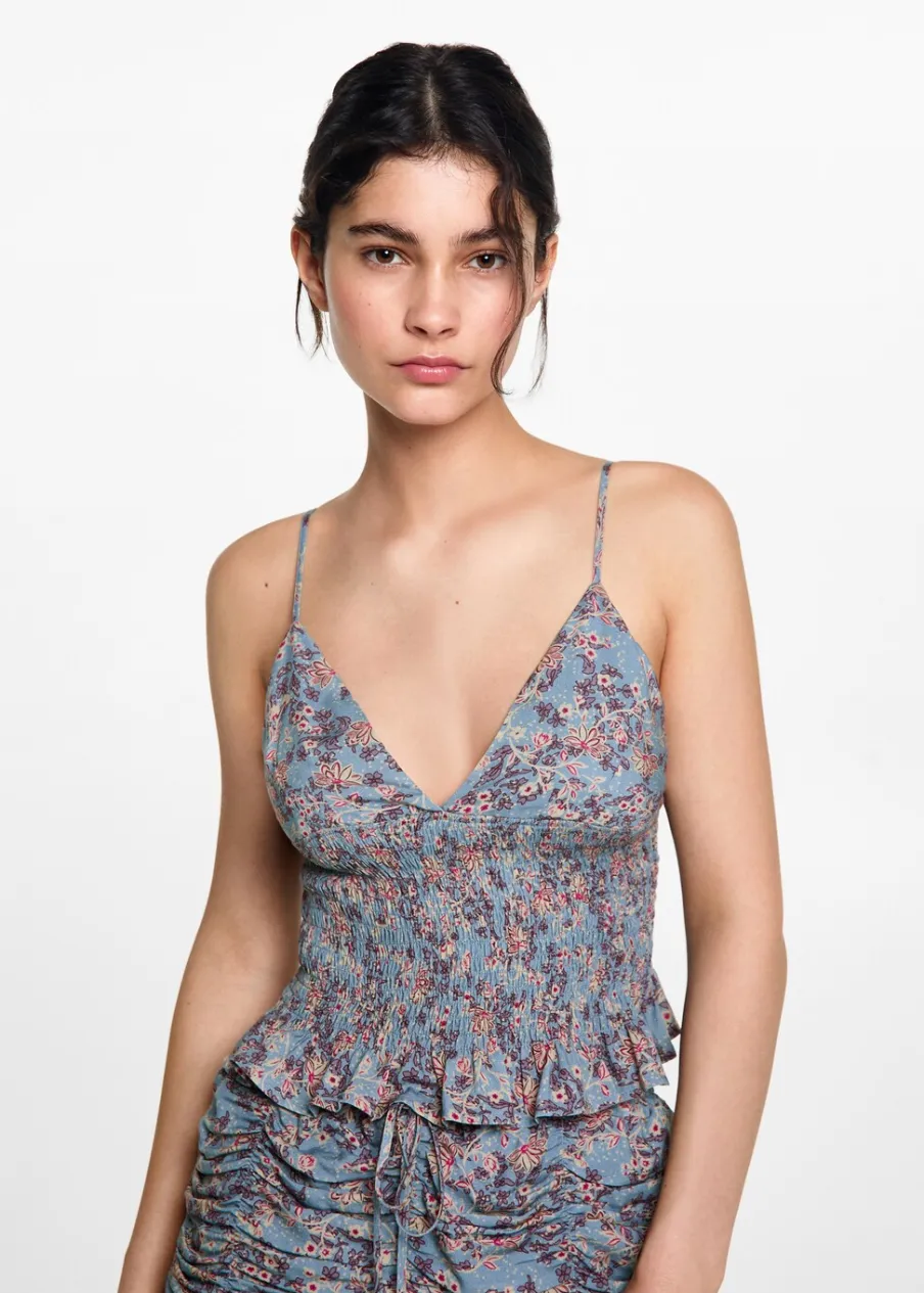 Total look. Kwiatowy wzór. Model prosty. Deseń crop. Dekolt V. Ozdobne marszczenie. Cienkie ramiączka.