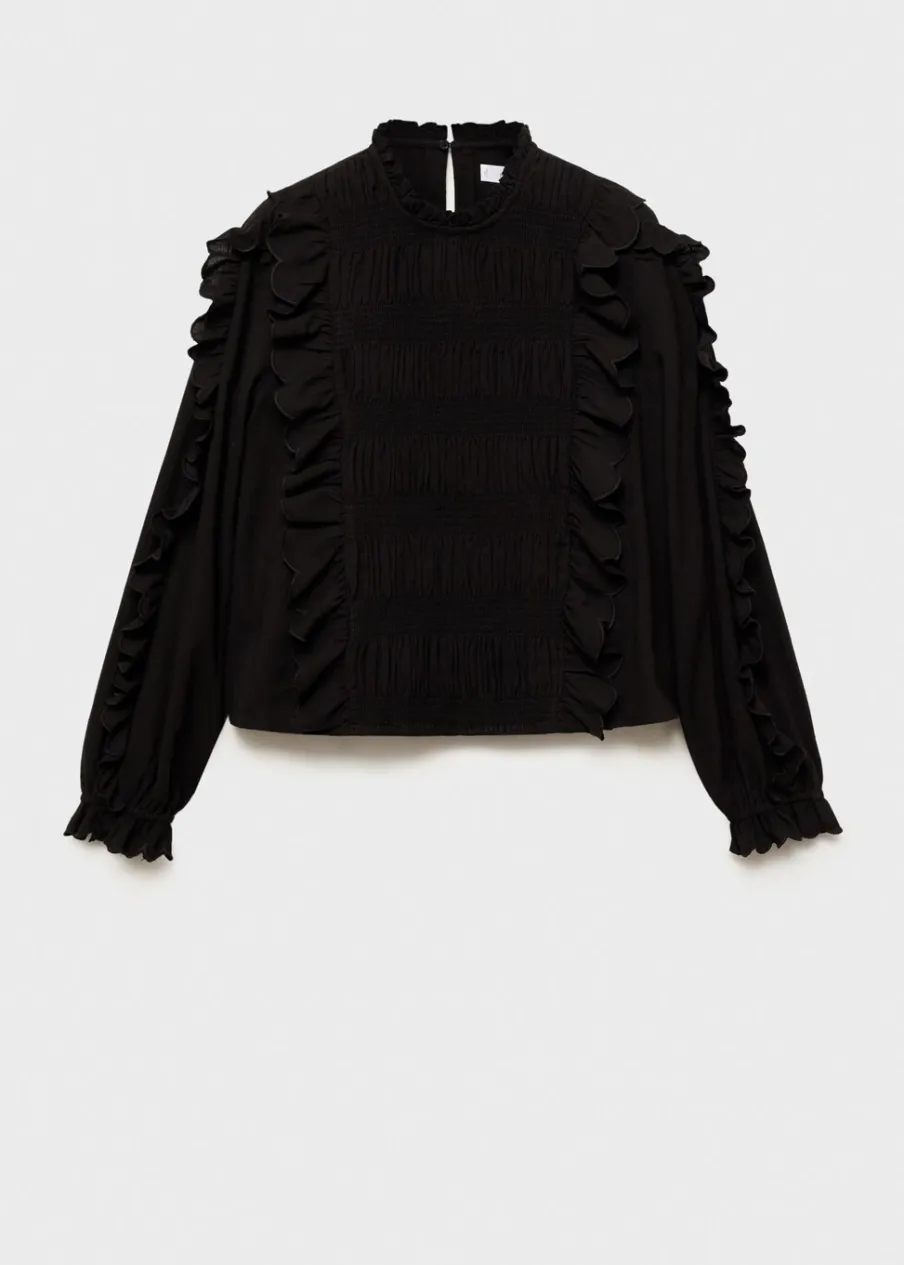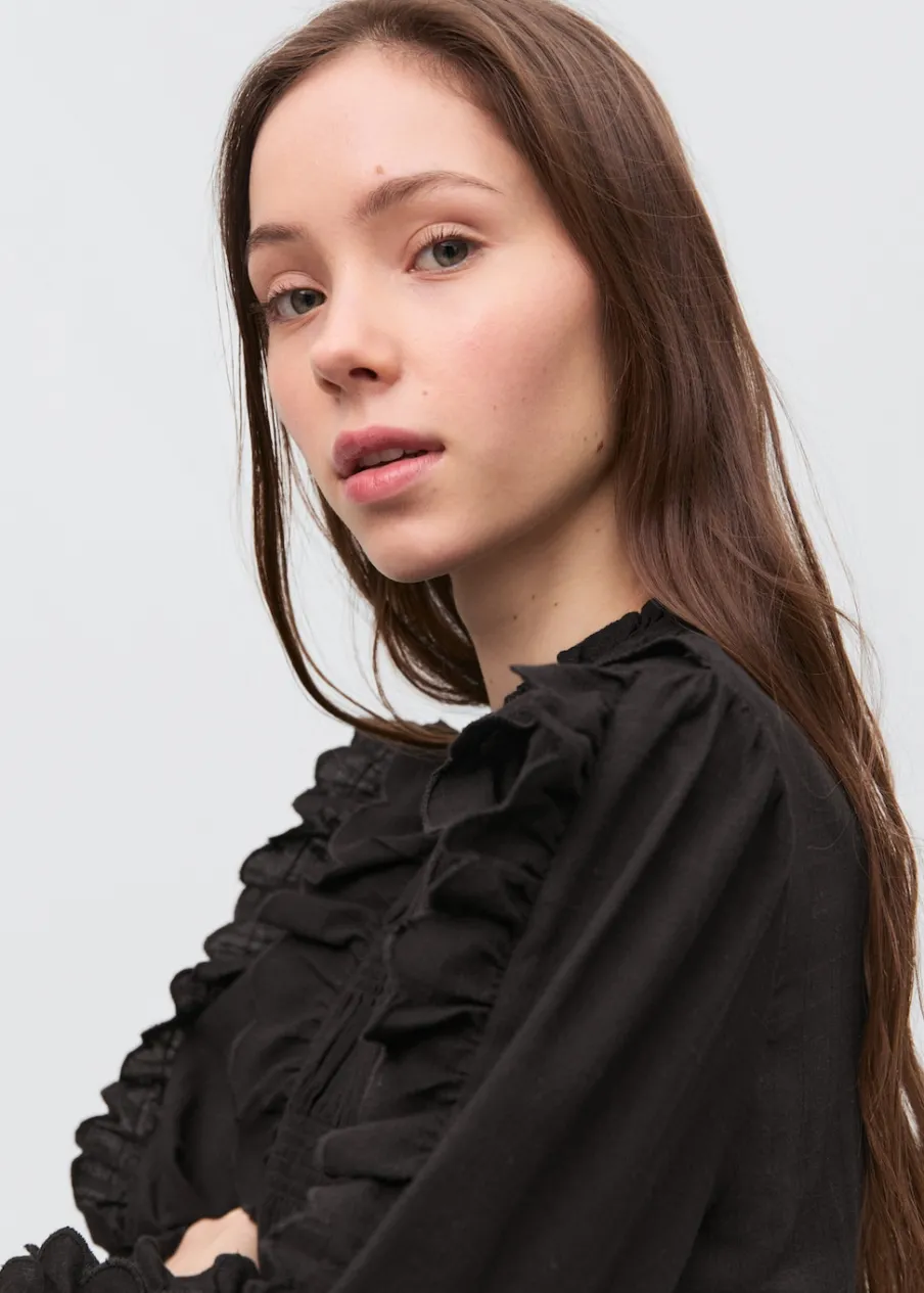 Bawełna 100%. Wysoki kołnierz otulający szyję. Długi rękaw. Falbanki na mankietach. Ozdobne marszczenie. Zapięcie na guzik pod szyją. Falbanki na ramionach.