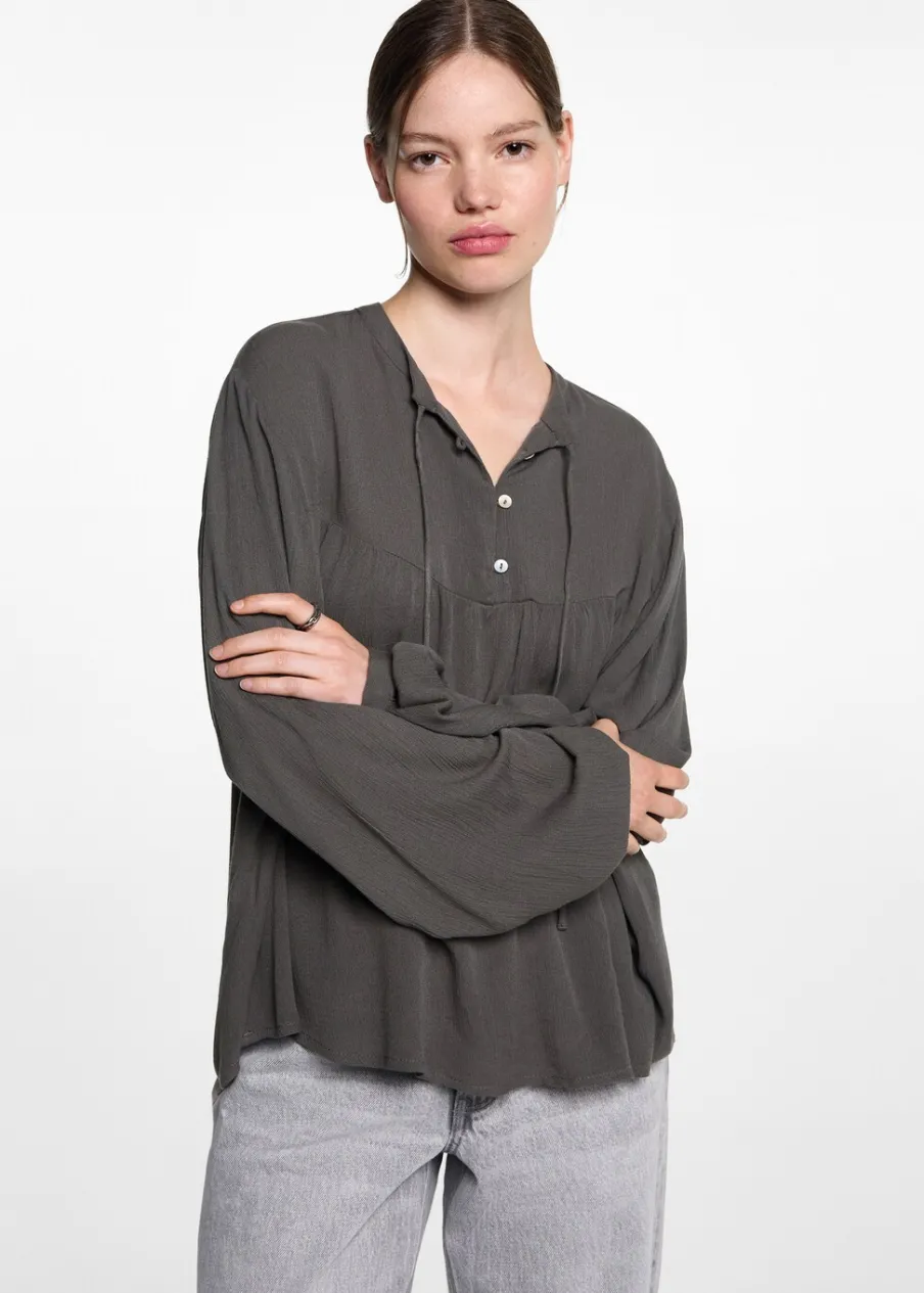 OpisLejąca tkanina. Model oversize. Długi bufiasty rękaw. Zapinane mankiety. Okrągły dekolt. Wiązane zapięcie. Za…