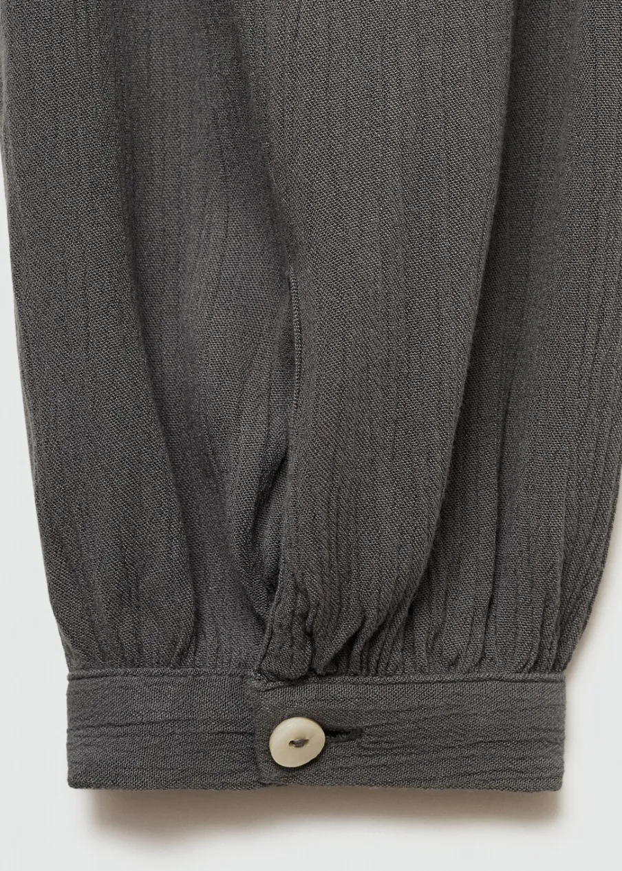 Lejąca tkanina. Model oversize. Długi bufiasty rękaw. Zapinane mankiety. Okrągły dekolt. Wiązane zapięcie. Zapięcie na trzy guziki z przodu. Model ma 175 cm wzrostu i nosi rozmiar M. Powrót do szkoły.