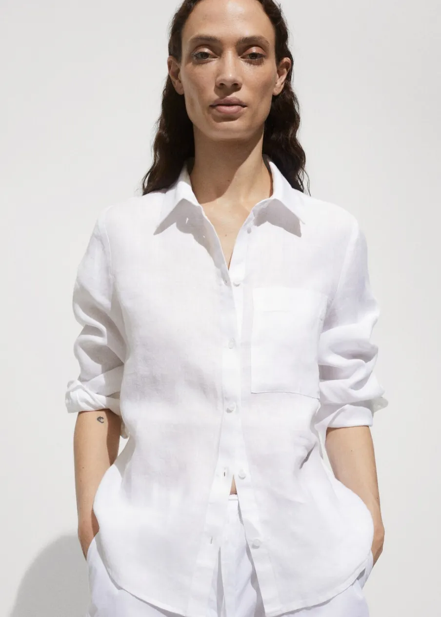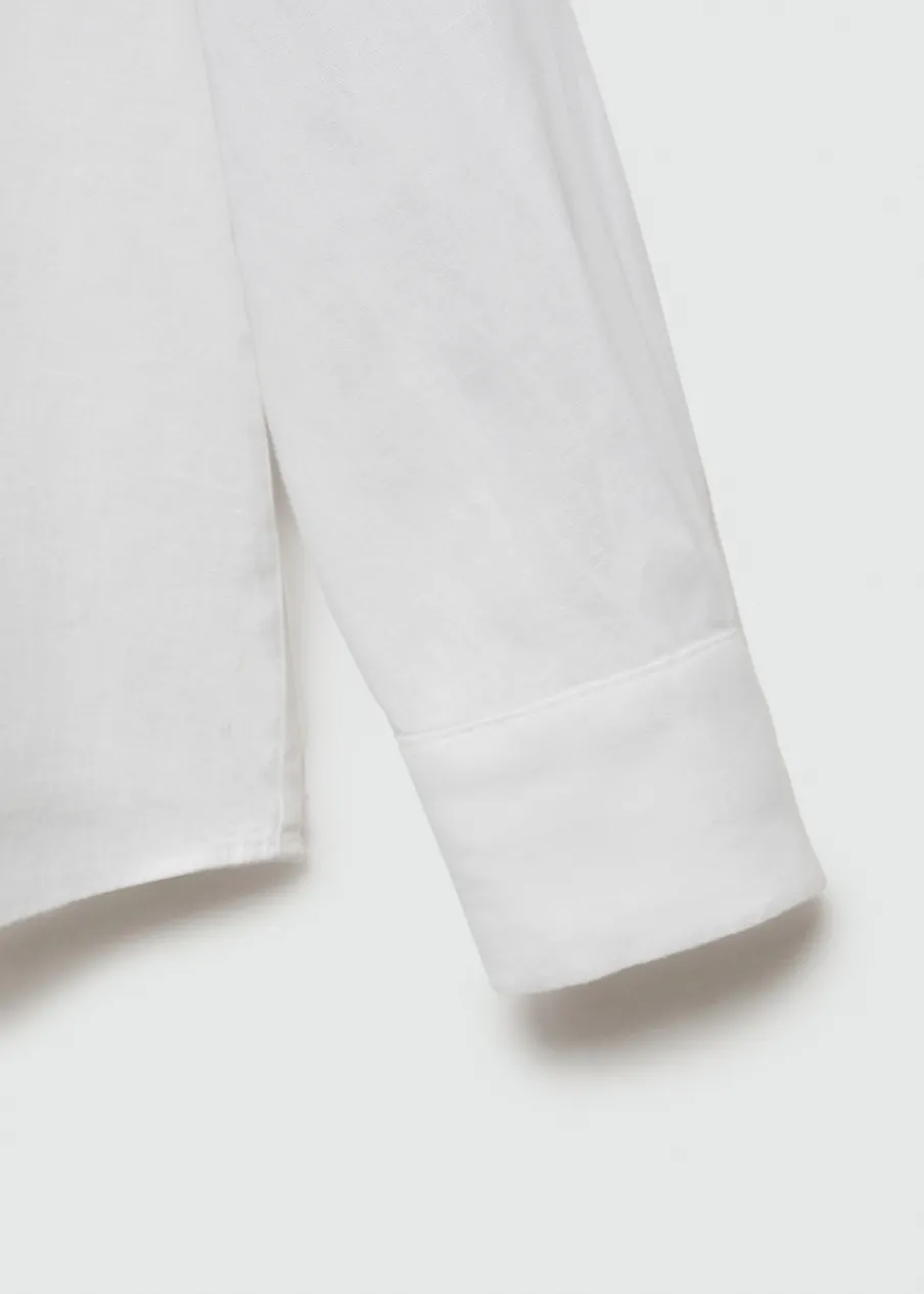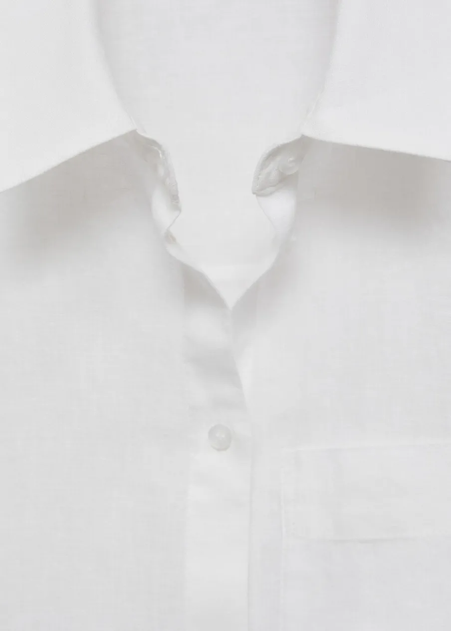 OpisTkanina z 100% lnu. Model prosty. Koszulowy kołnierz. Długi rękaw z guzikami na mankietach. Nakładana kieszeń p…