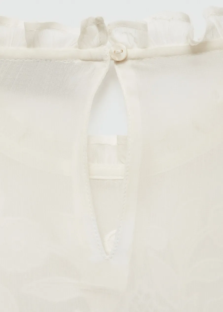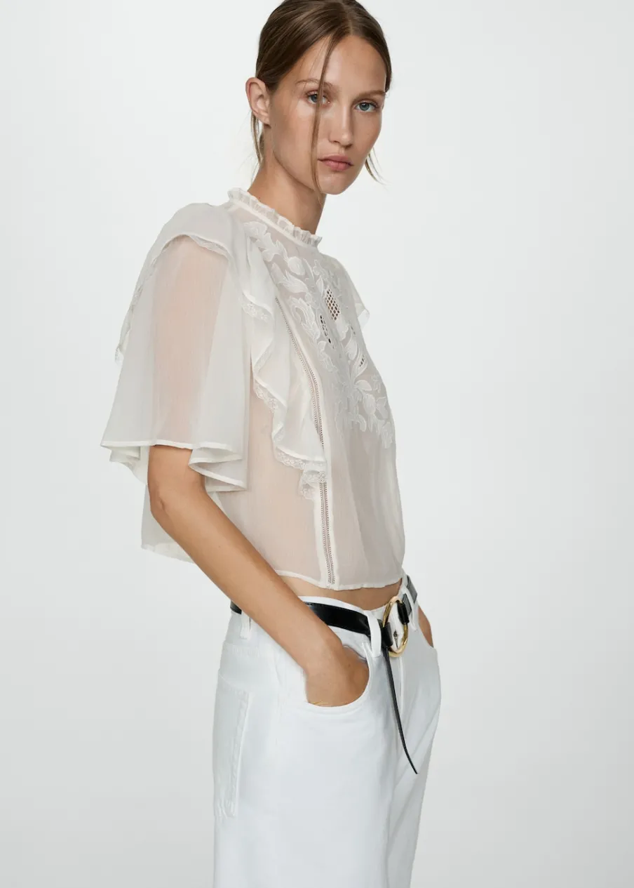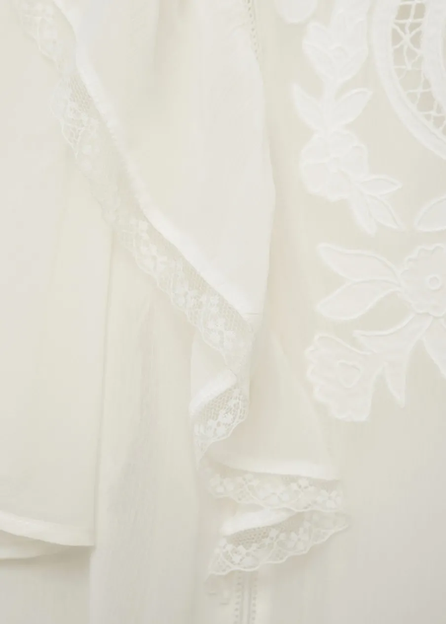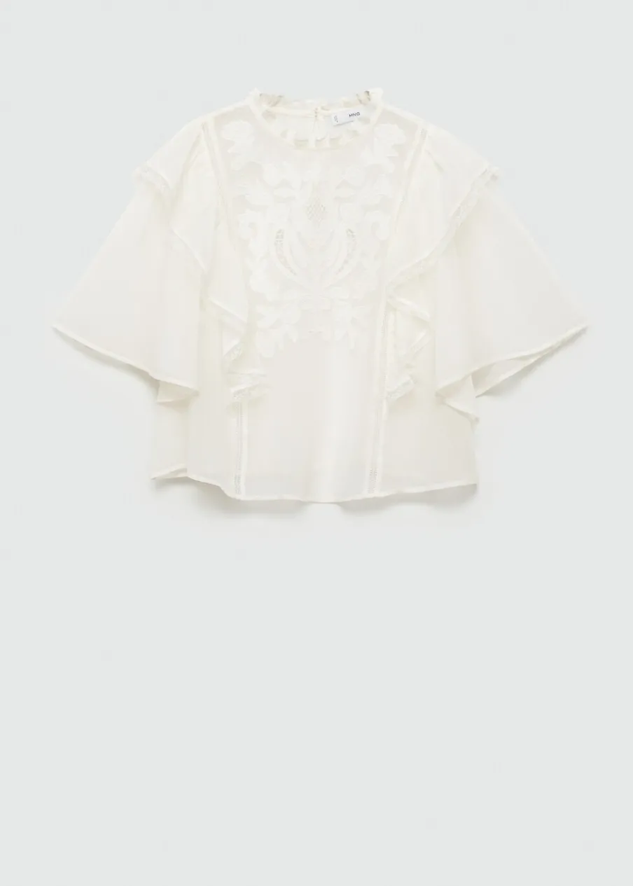 Lejąca tkanina. Deseń crop. Model prosty. Okrągły dekolt. Krótki rękaw. Zapięcie na guzik z tyłu. Koronkowe elementy. Haftowane detale.