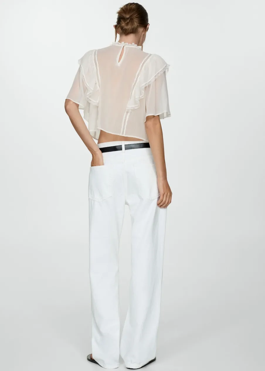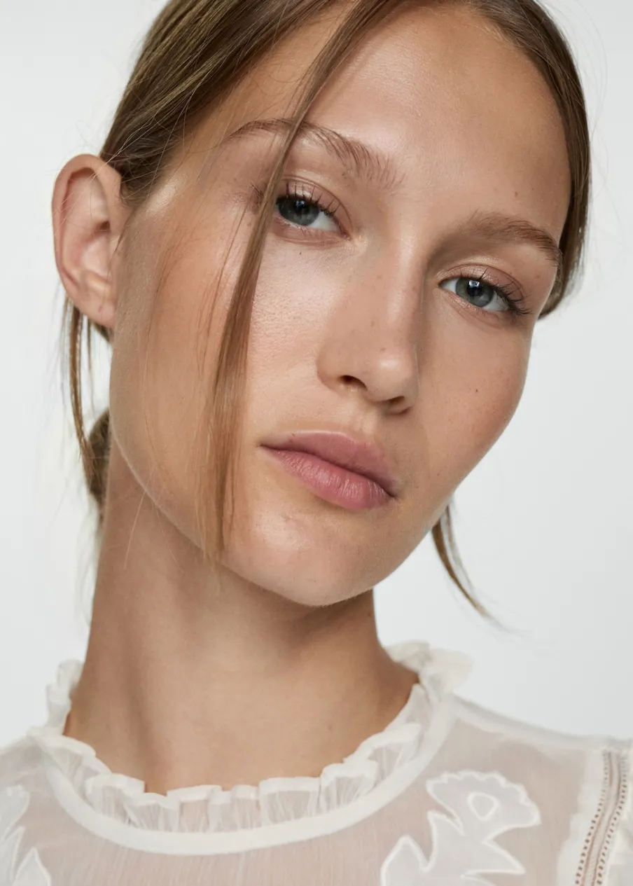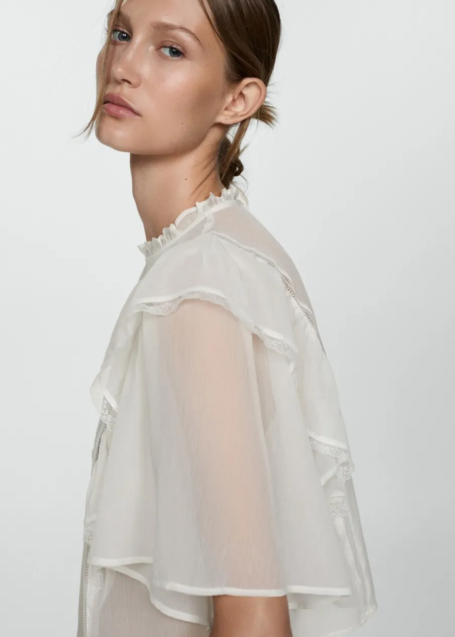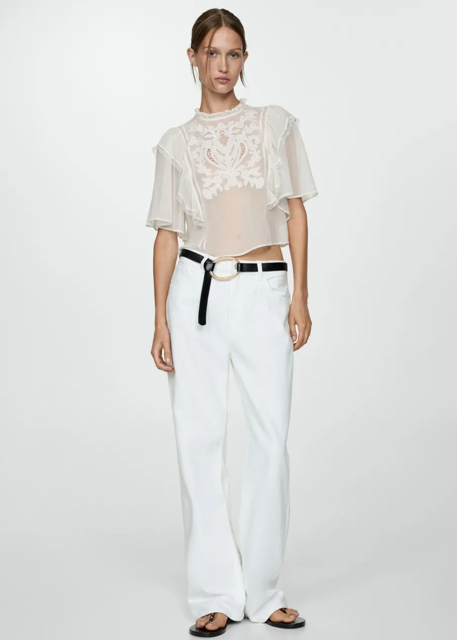 Lejąca tkanina. Deseń crop. Model prosty. Okrągły dekolt. Krótki rękaw. Zapięcie na guzik z tyłu. Koronkowe elementy. Haftowane detale.