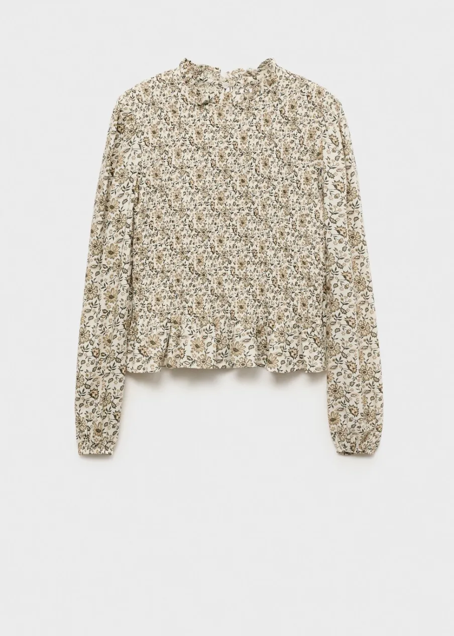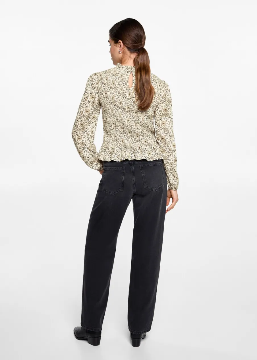 Model prosty. Kwiatowy wzór. Marszczony detal. Okrągły dekolt. Długi rękaw. Zapięcie na guzik z tyłu. Modelka ma 172 cm wzrostu i nosi rozmiar M.