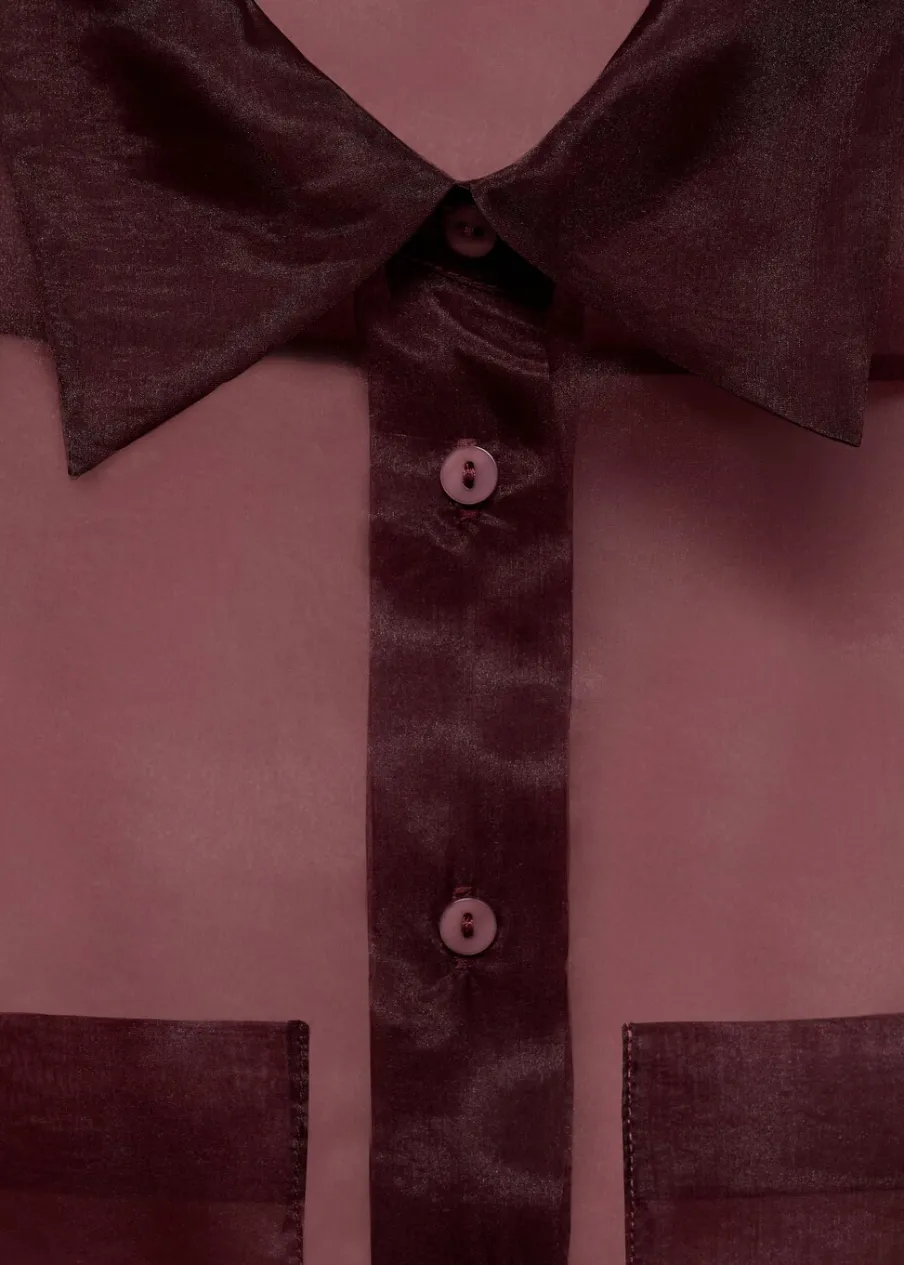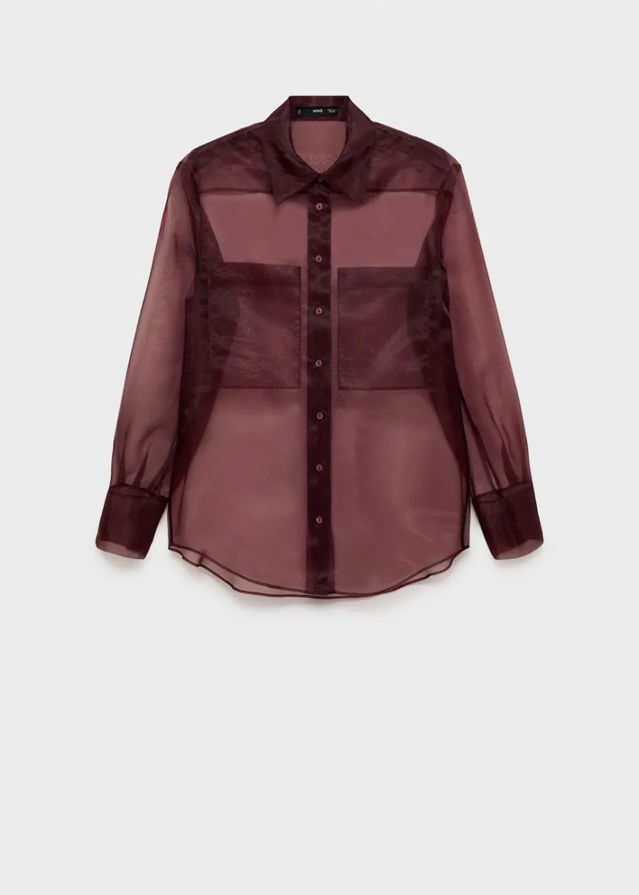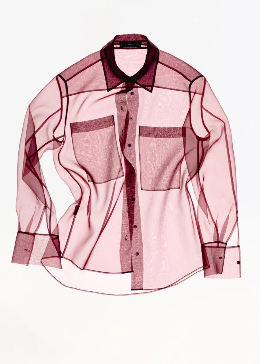 Lejąca tkanina. Zapięcie z przodu na guziki. Dwie kieszenie nakładane z przodu. Modelka ma 177 cm wzrostu i nosi rozmiar S/36. Kolekcja wizytowa. Półprzezroczysta tkanina. Model prosty. Koszulowy kołnierz. Długi rękaw z guzikami na mankietach.
