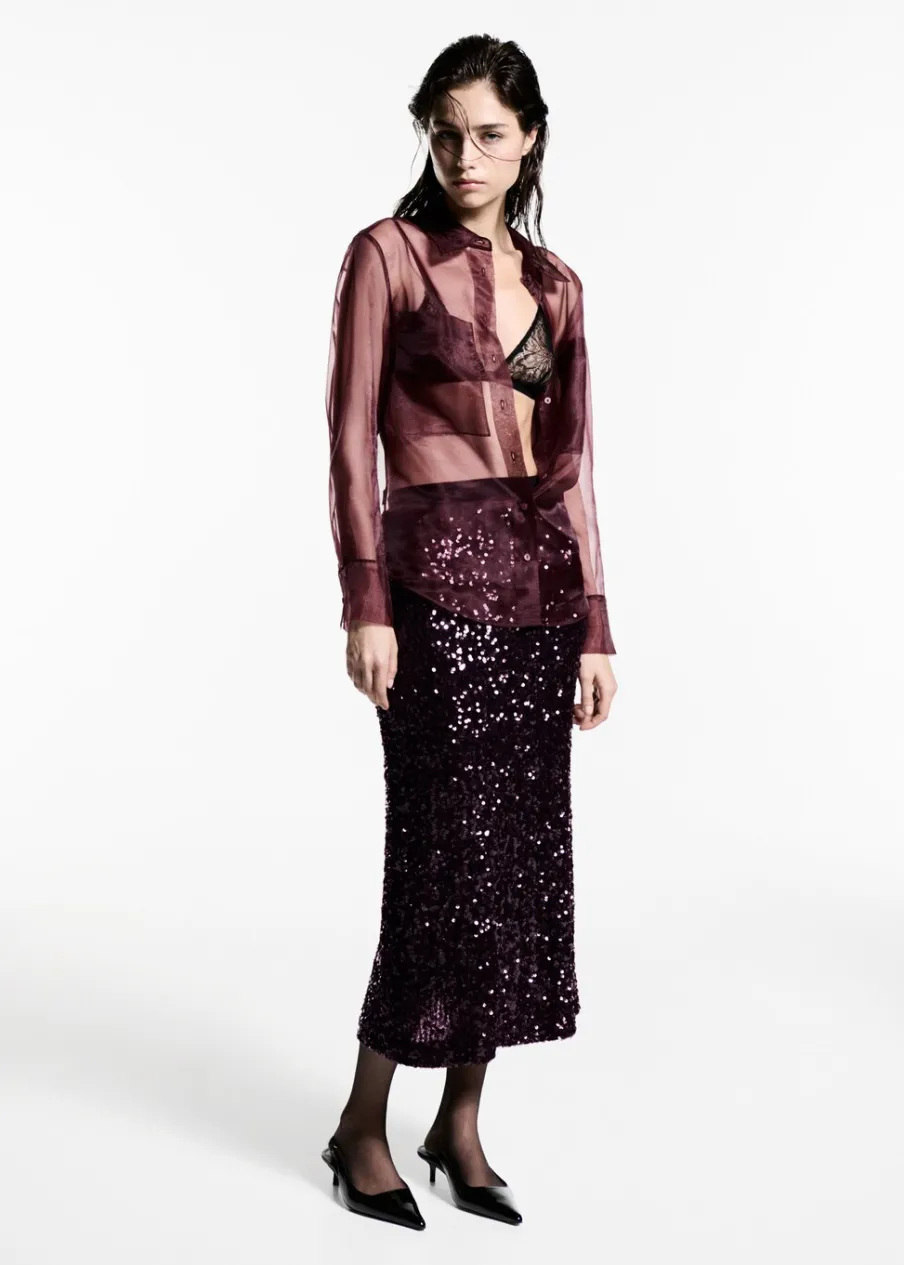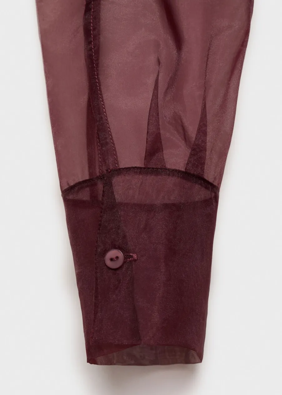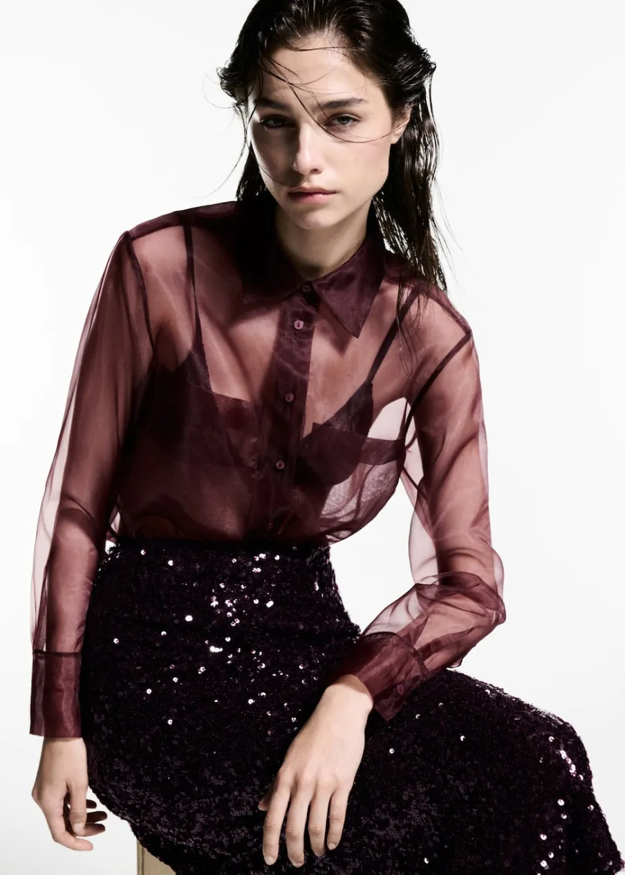 Lejąca tkanina. Zapięcie z przodu na guziki. Dwie kieszenie nakładane z przodu. Modelka ma 177 cm wzrostu i nosi rozmiar S/36. Kolekcja wizytowa. Półprzezroczysta tkanina. Model prosty. Koszulowy kołnierz. Długi rękaw z guzikami na mankietach.