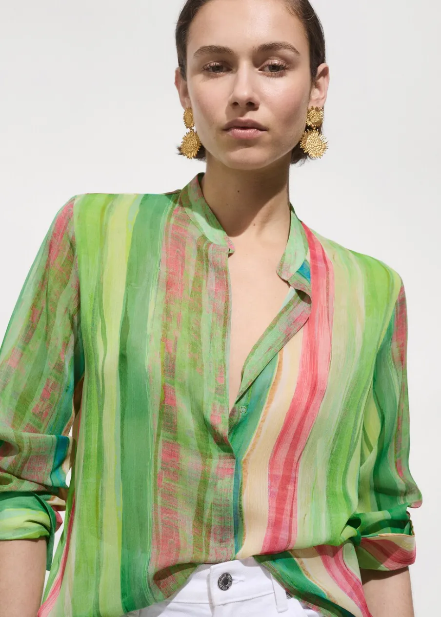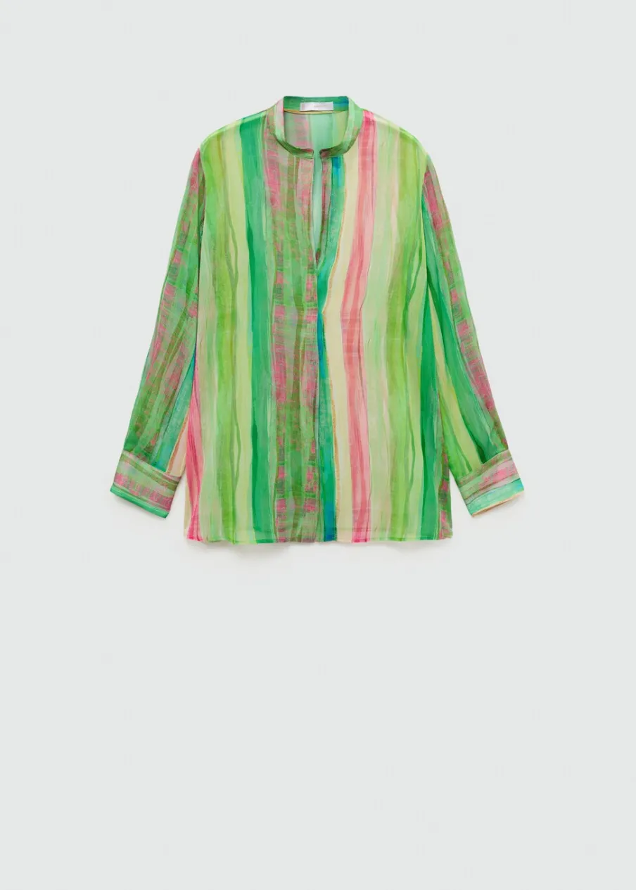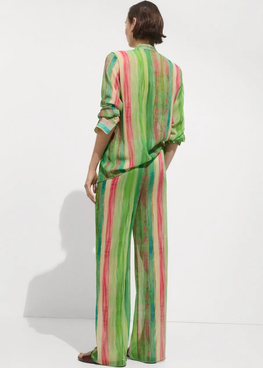 Lejąca tkanina. Półprzezroczysta tkanina. Model prosty. Wzór w pasy. Długi rękaw z guzikami na mankietach. Bez zapięcia. Total look. Sezon festiwalowy.
