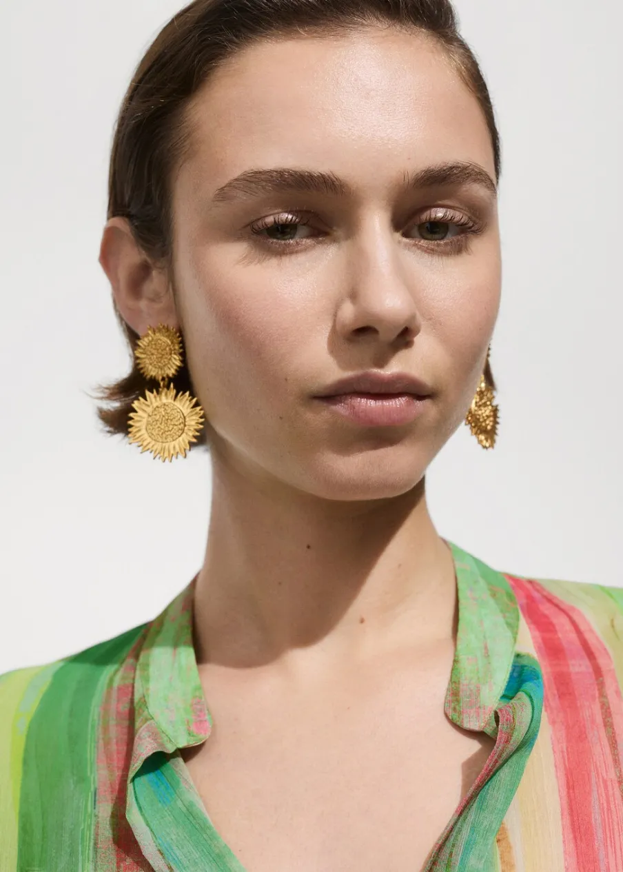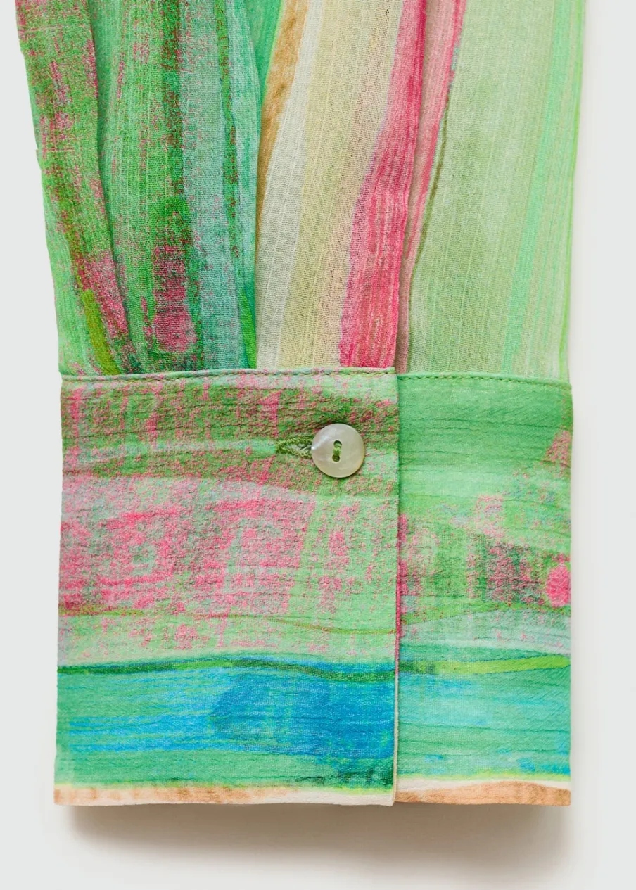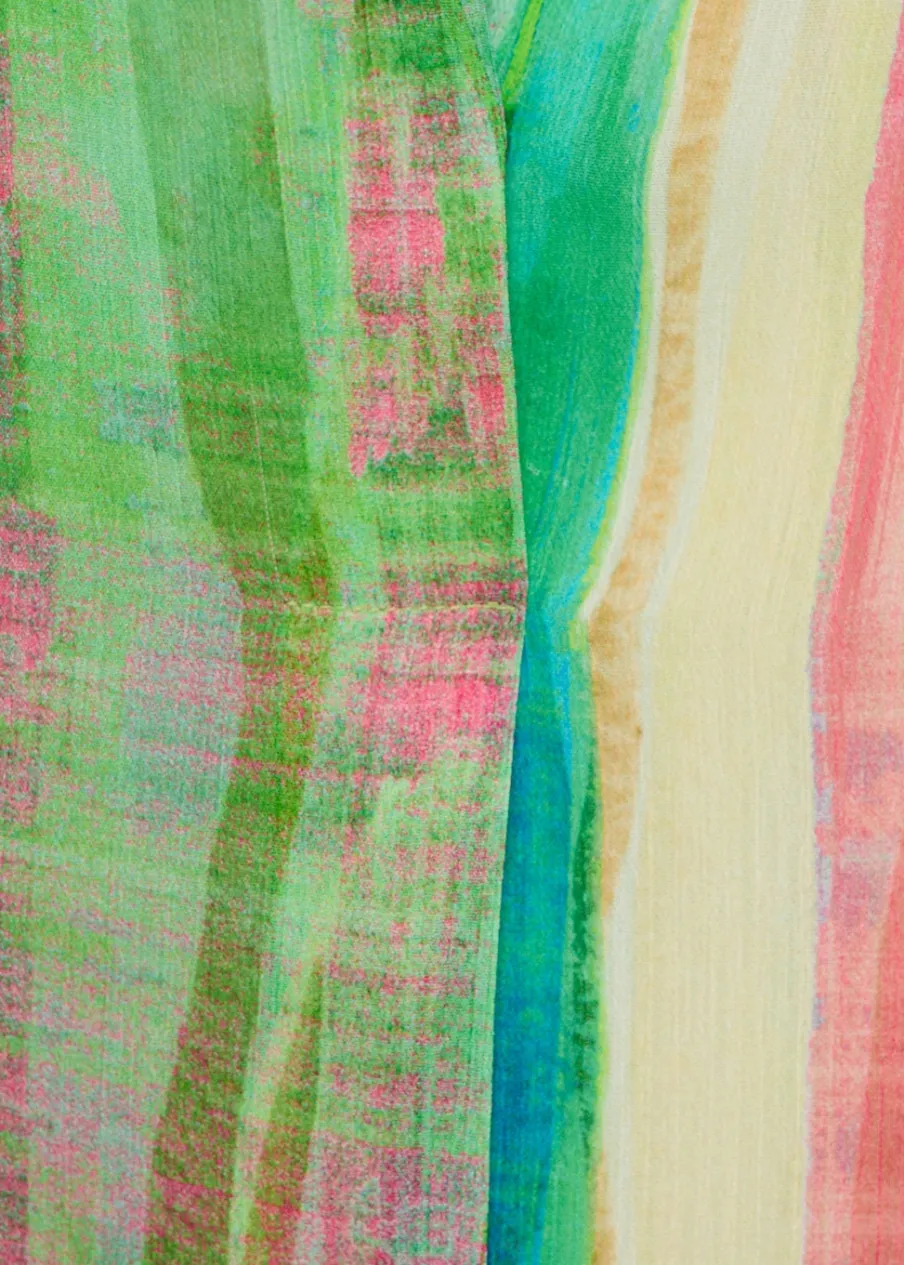 Lejąca tkanina. Półprzezroczysta tkanina. Model prosty. Wzór w pasy. Długi rękaw z guzikami na mankietach. Bez zapięcia. Total look. Sezon festiwalowy.