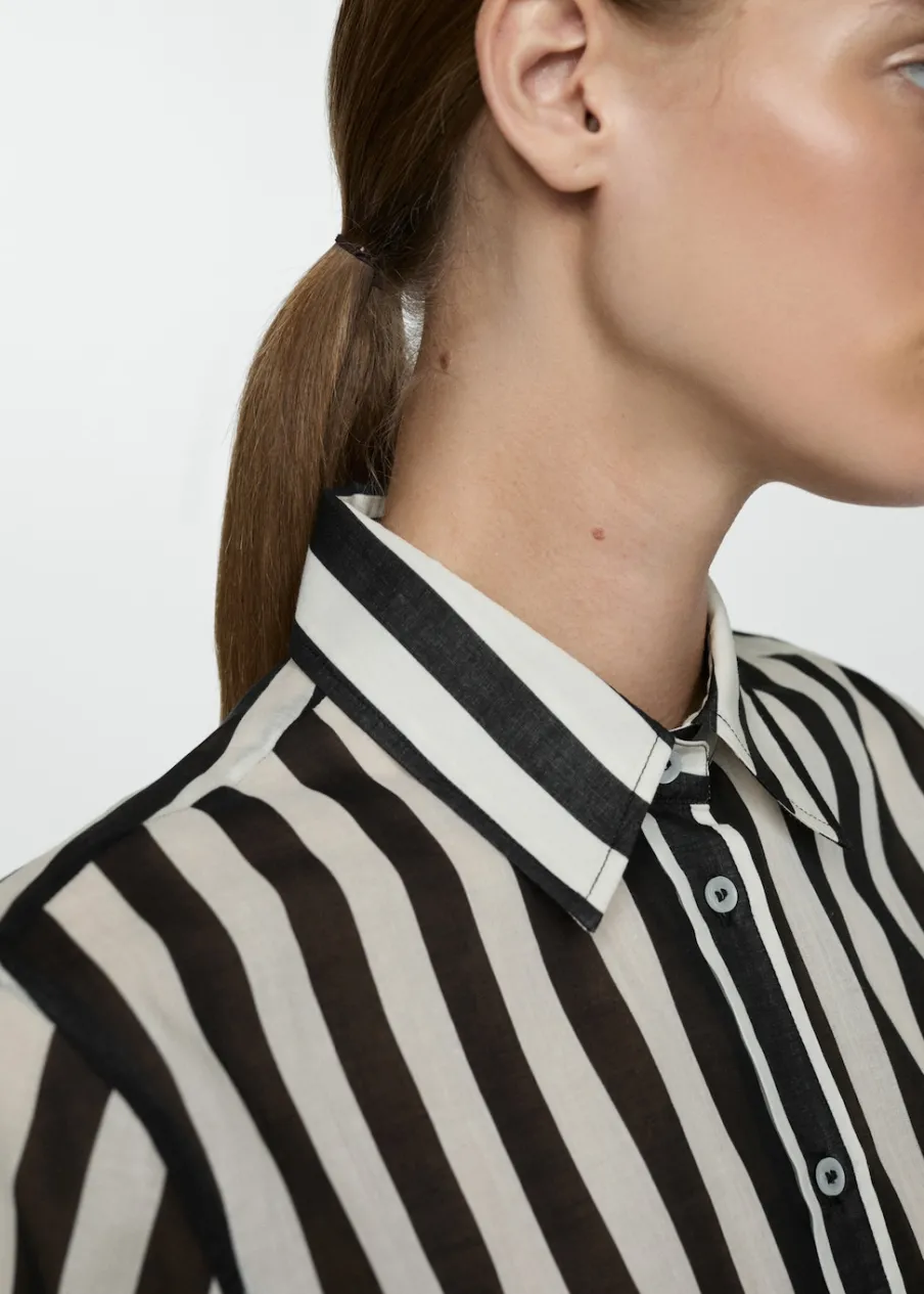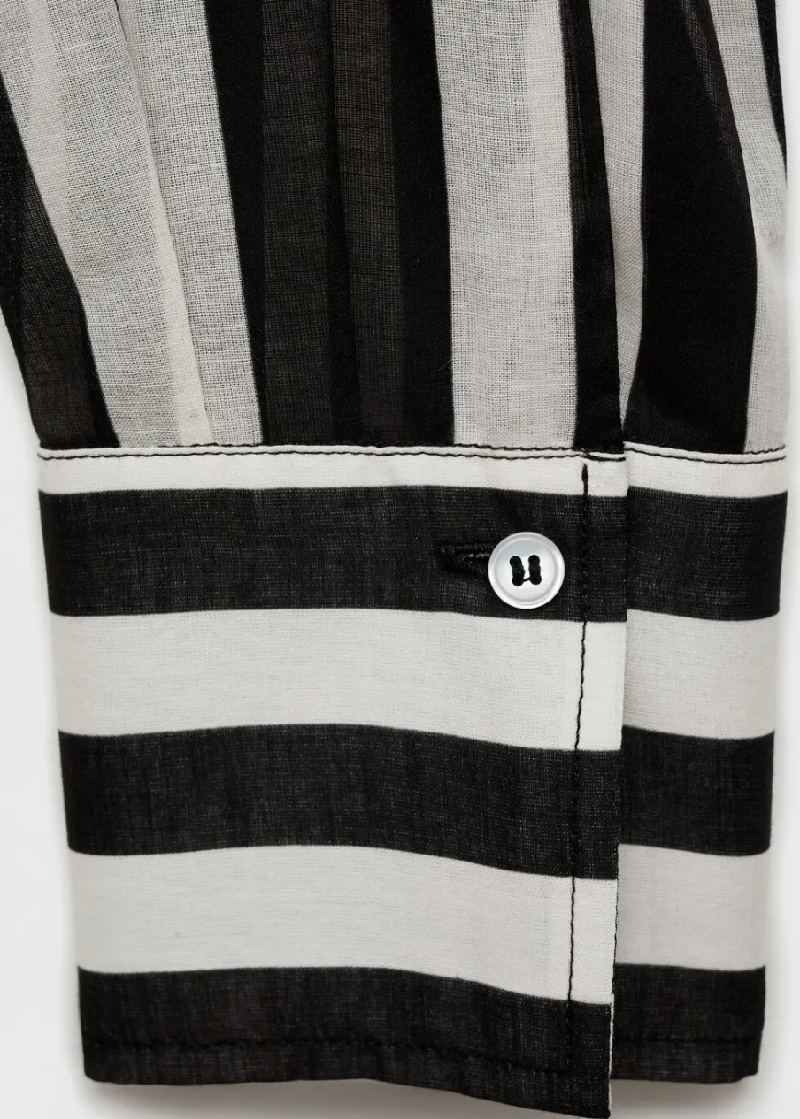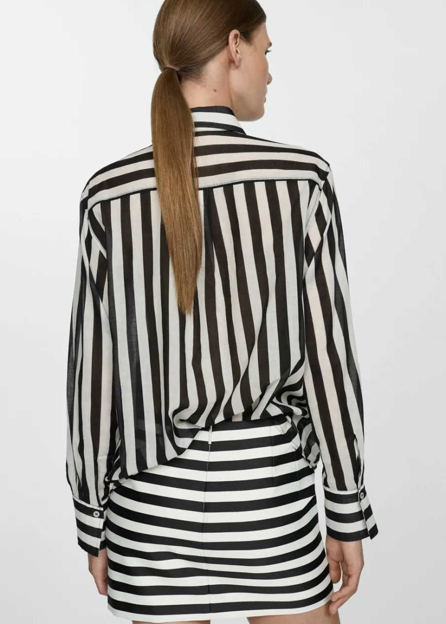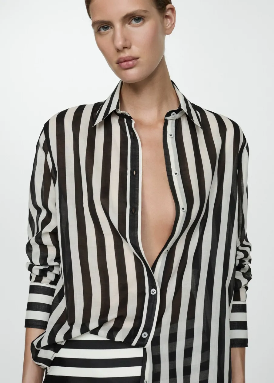 Półprzezroczysta tkanina. Wzór w pasy. Koszulowy kołnierz. Długi rękaw z guzikami na mankietach. Zapięcie z przodu na guziki. Modelka ma 180 cm wzrostu i nosi rozmiar S. Tkanina z 100% bawełny.