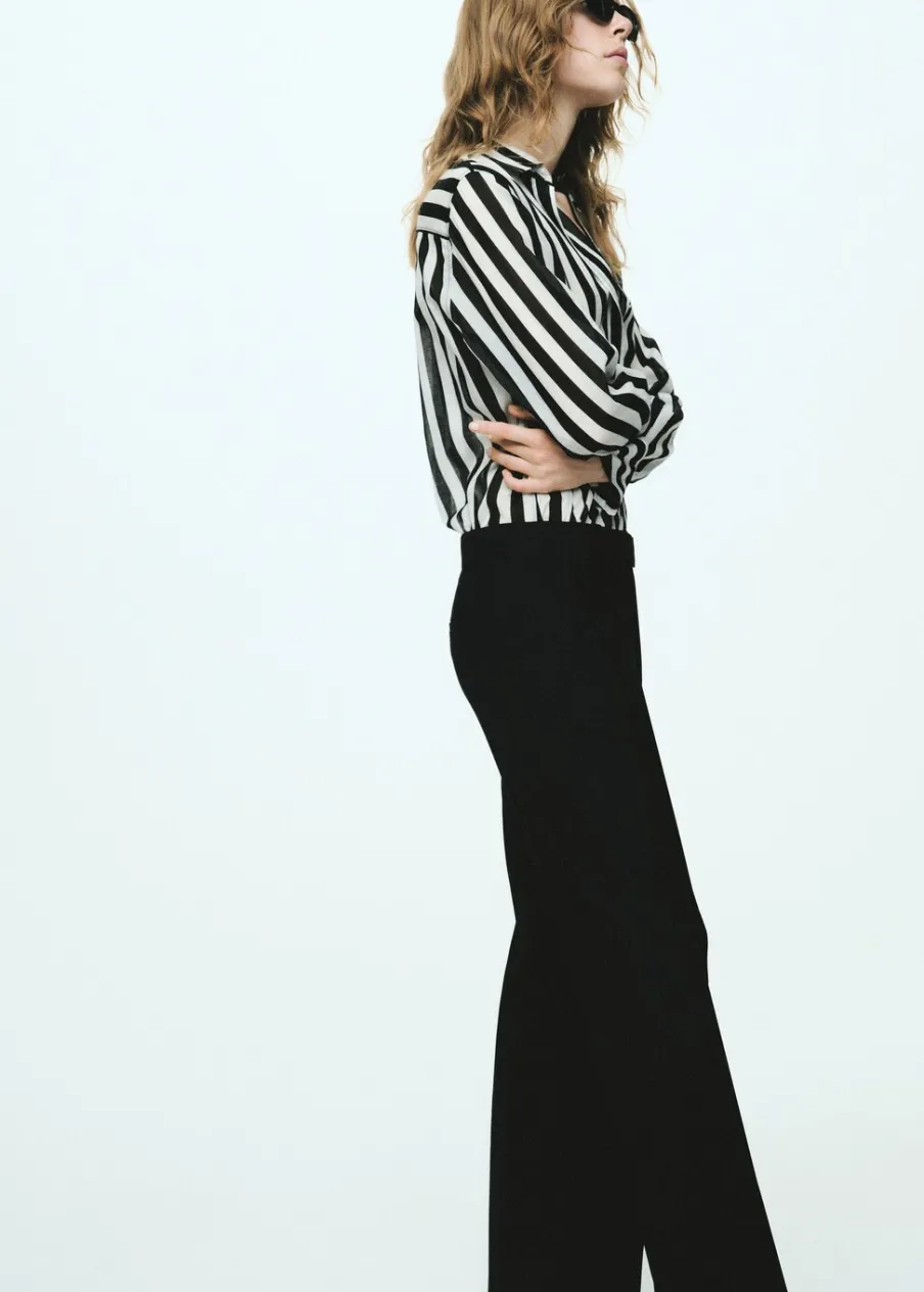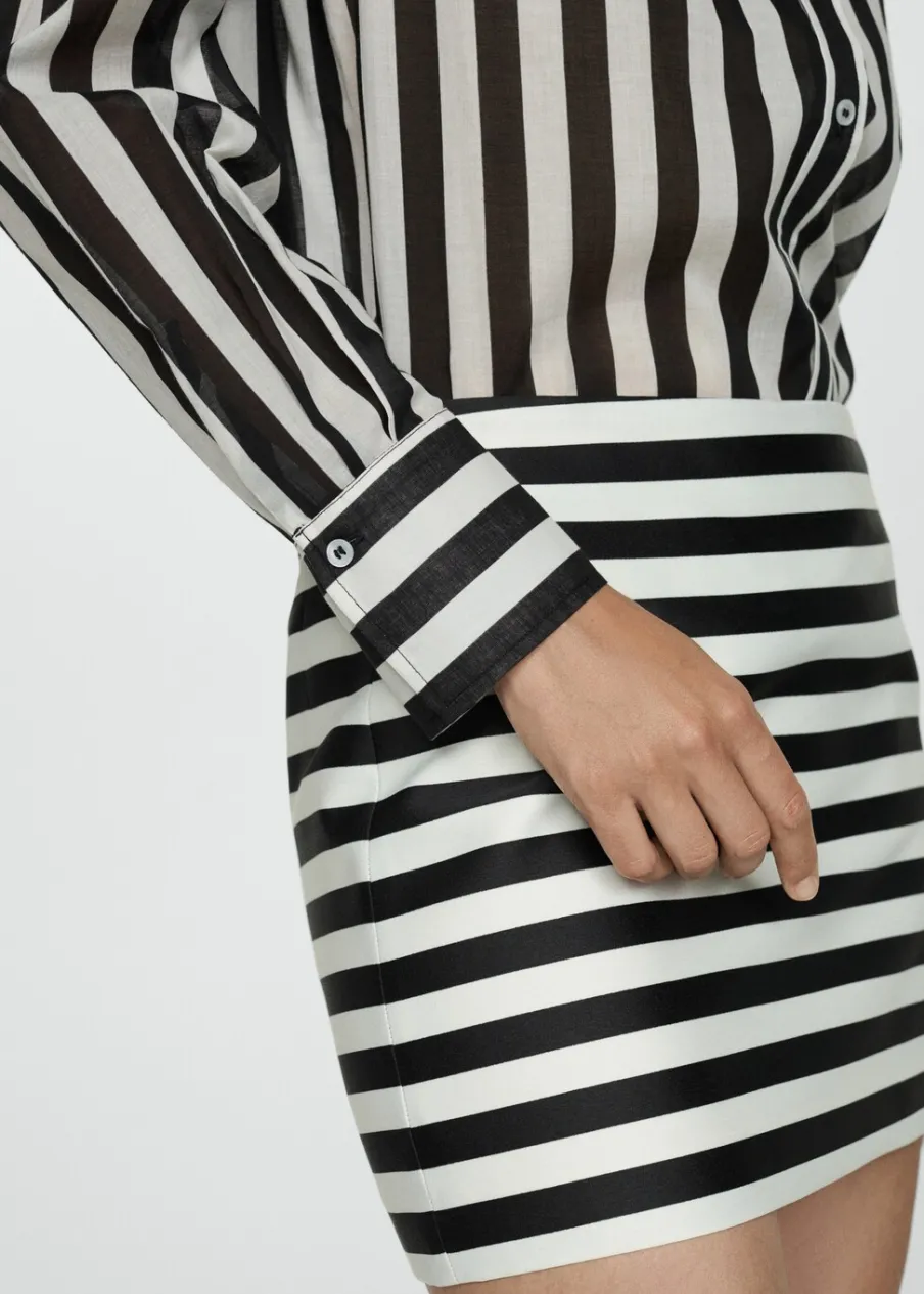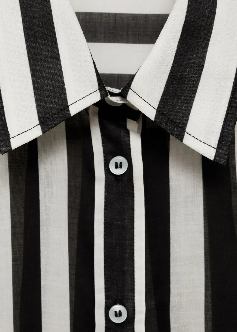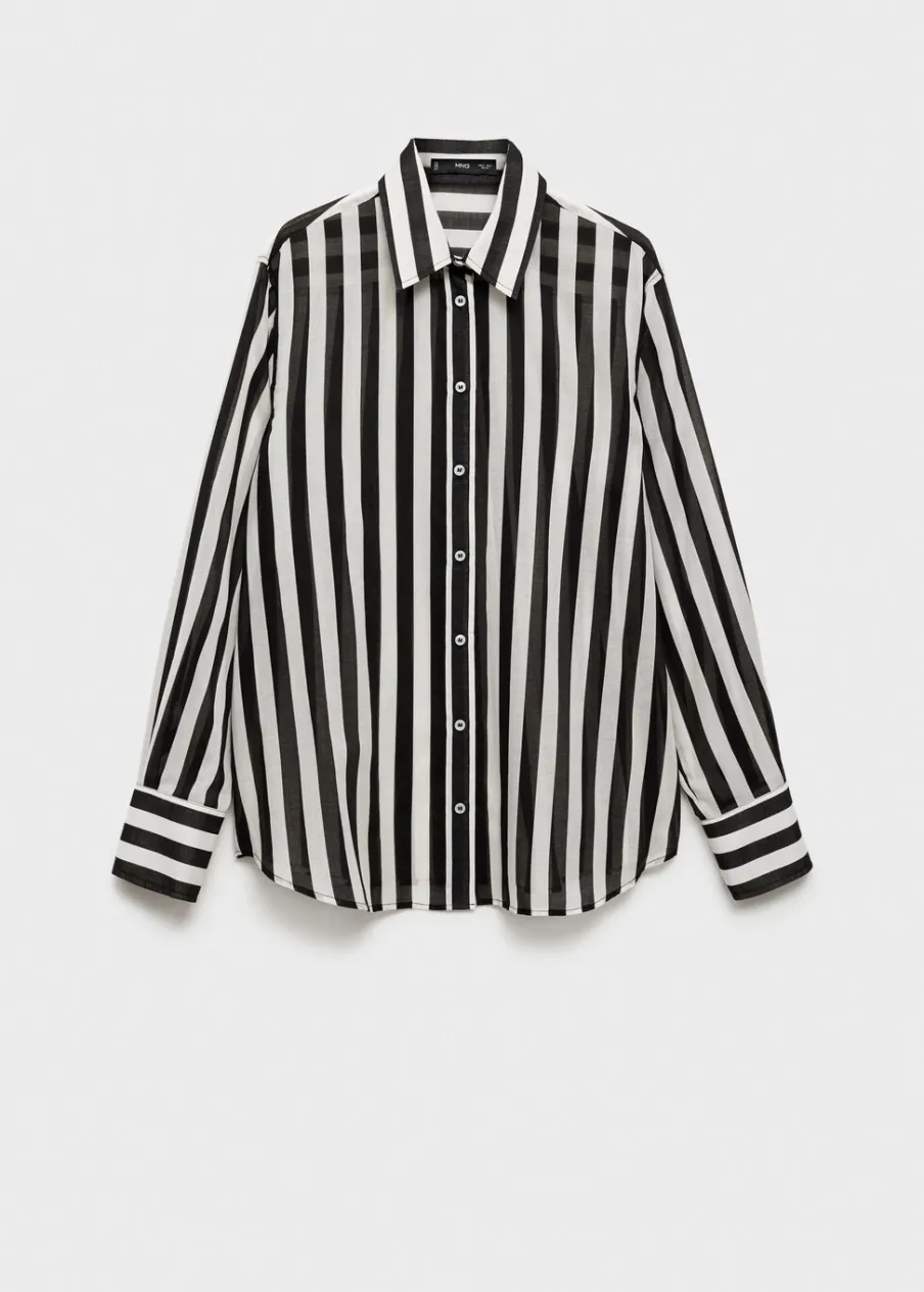 Półprzezroczysta tkanina. Wzór w pasy. Koszulowy kołnierz. Długi rękaw z guzikami na mankietach. Zapięcie z przodu na guziki. Modelka ma 180 cm wzrostu i nosi rozmiar S. Tkanina z 100% bawełny.
