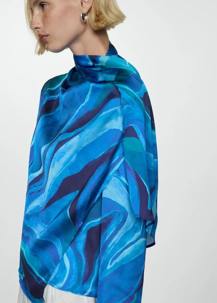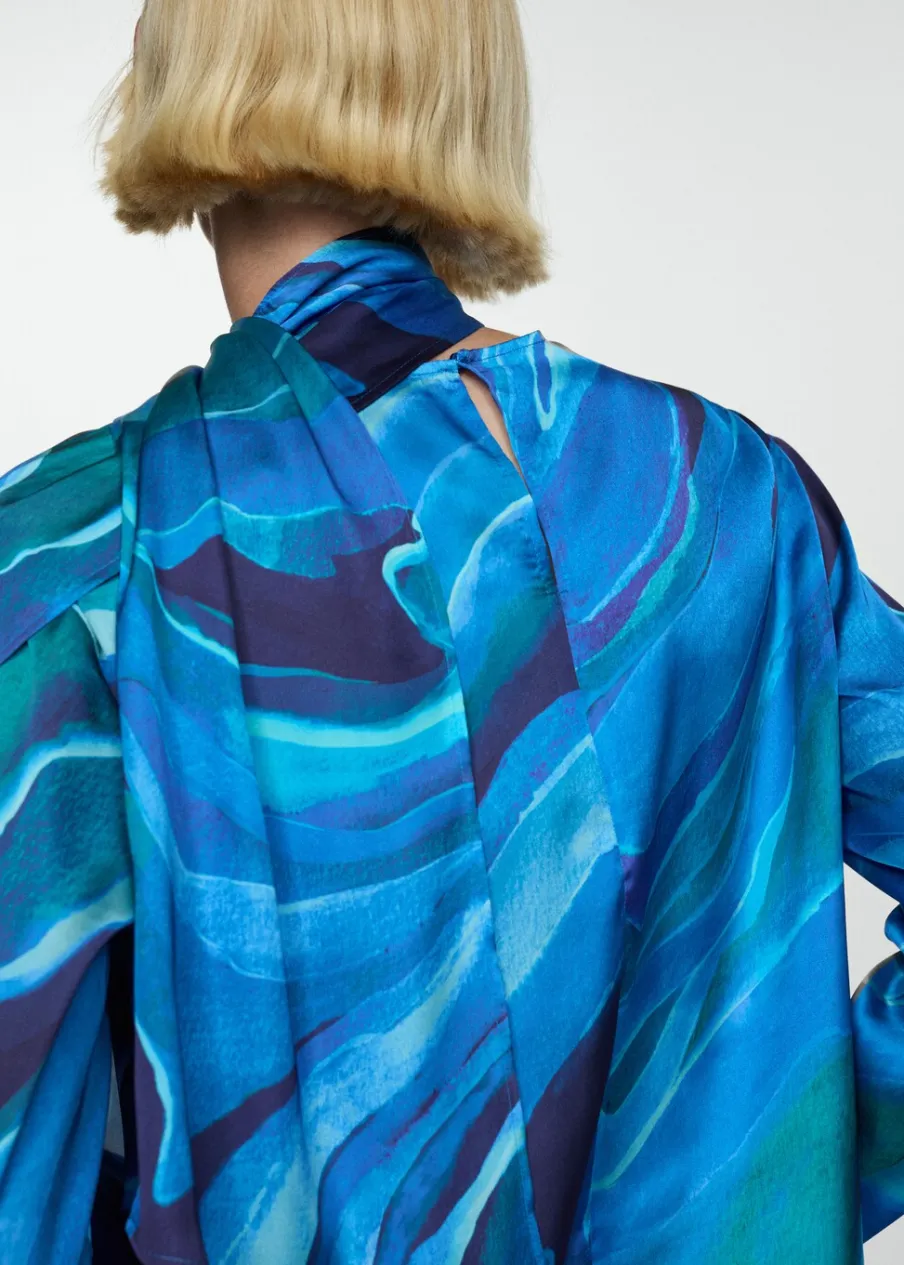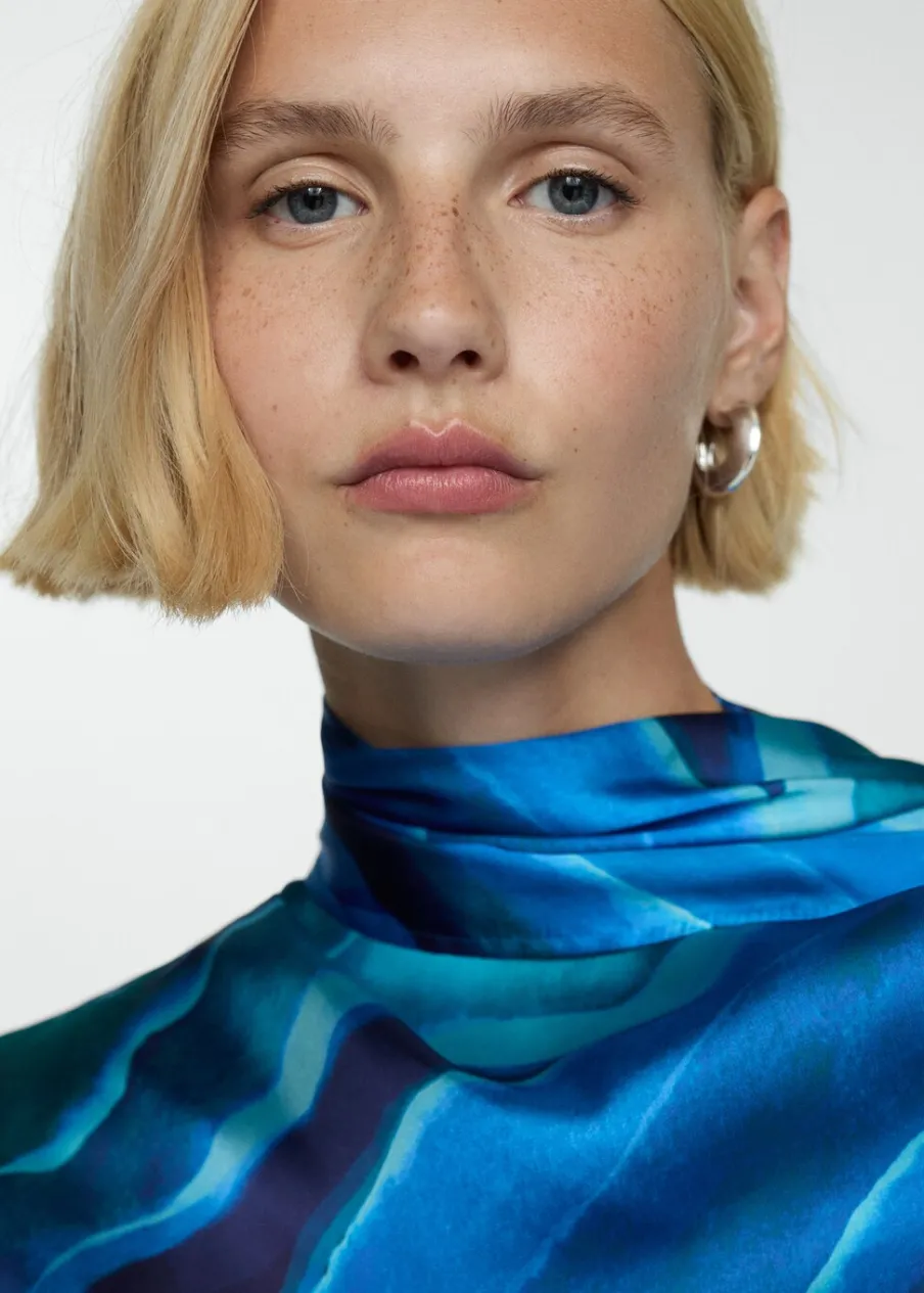 Satynowa tkanina. Lejąca tkanina. Model prosty. Golf. Drapowany dekolt. Długi rękaw. Zapięcie na guzik z tyłu. Kolekcja wizytowa. Nadruk.