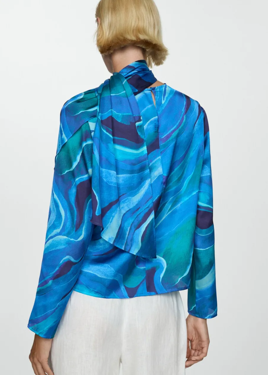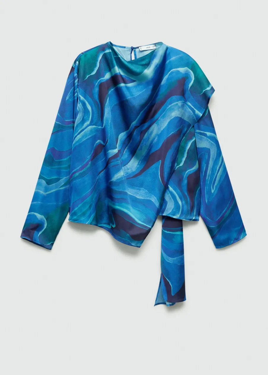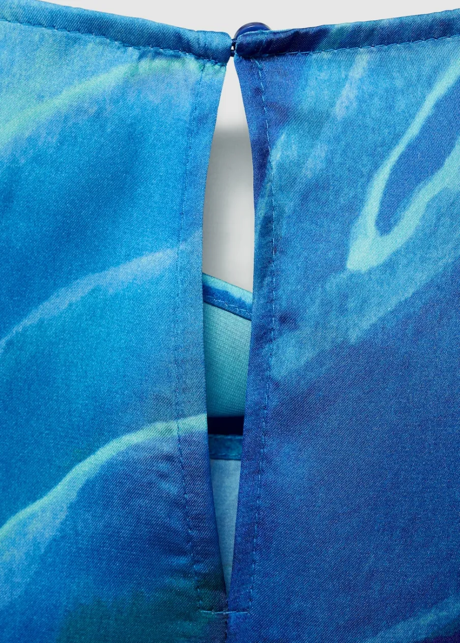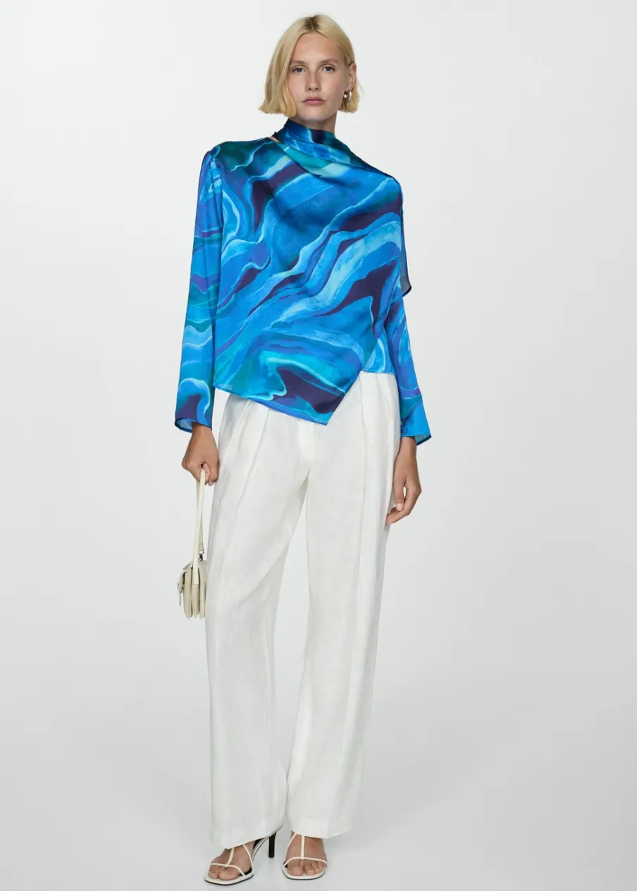 Satynowa tkanina. Lejąca tkanina. Model prosty. Golf. Drapowany dekolt. Długi rękaw. Zapięcie na guzik z tyłu. Kolekcja wizytowa. Nadruk.