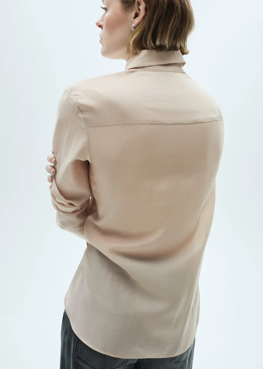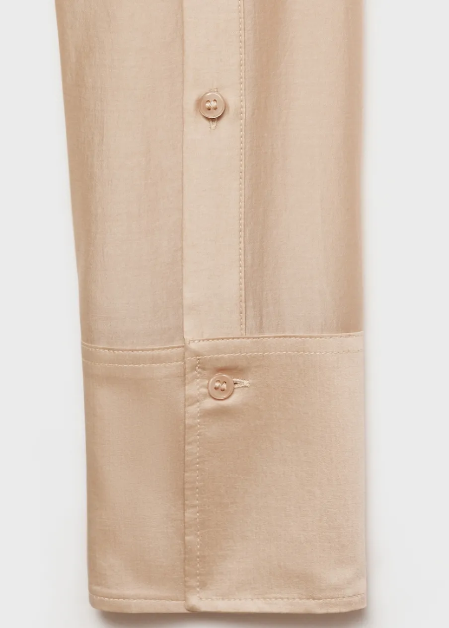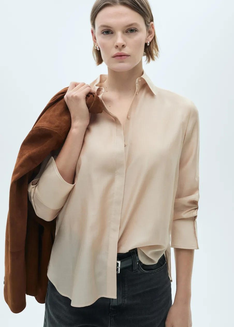 Satynowa tkanina. Tkanina mieszana z lyocellem. Model oversize. Model prosty. Koszulowy kołnierz. Długi rękaw z guzikami na mankietach. Modelka ma 179 cm wzrostu i nosi rozmiar S/36. Modelka ma 180 cm wzrostu i nosi rozmiar S/36. Kryte zapięcie na guziki z przodu.