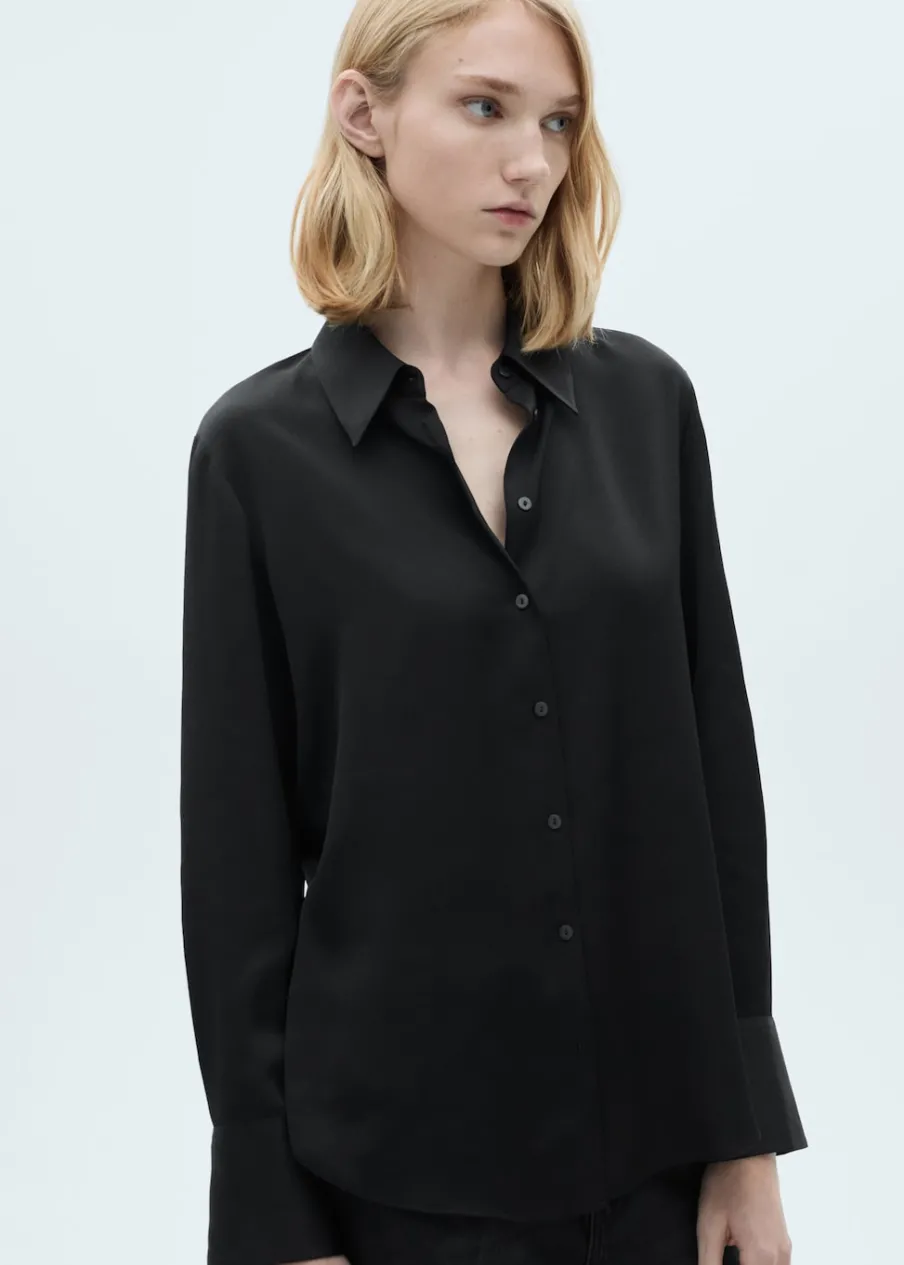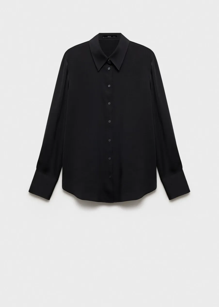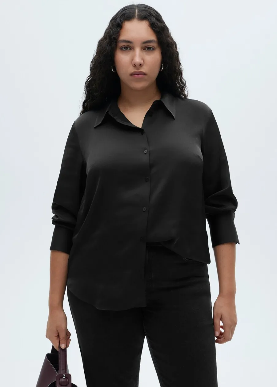 Satynowa tkanina. Lejąca tkanina z teksturą. Model prosty. Model standardowy. Krój regular. Koszulowy kołnierz. Długi rękaw z guzikami na mankietach. Zapięcie z przodu na guziki. Dostępne w Plus Size.