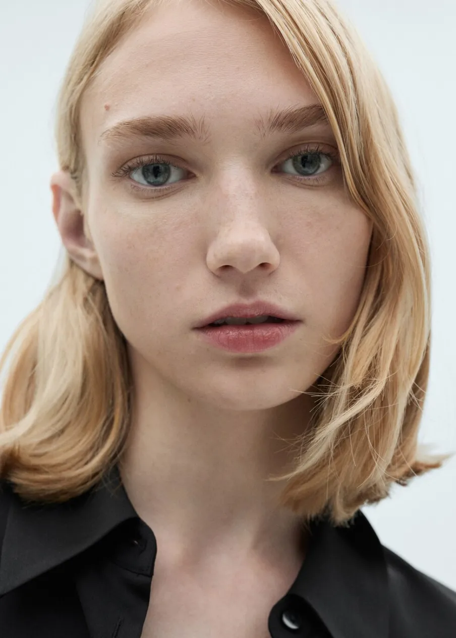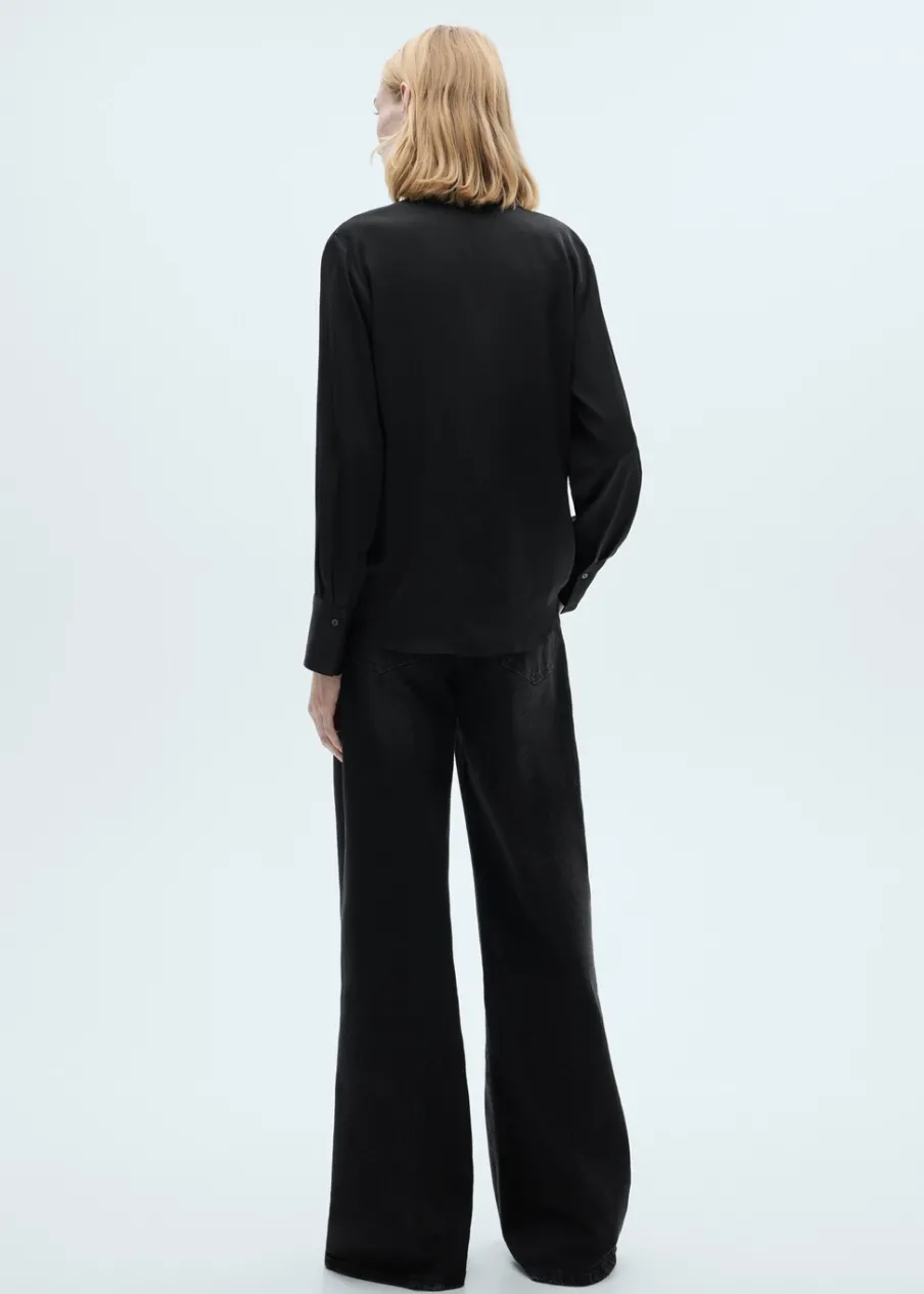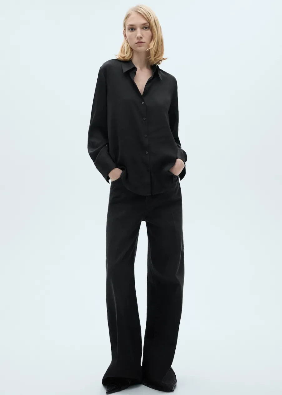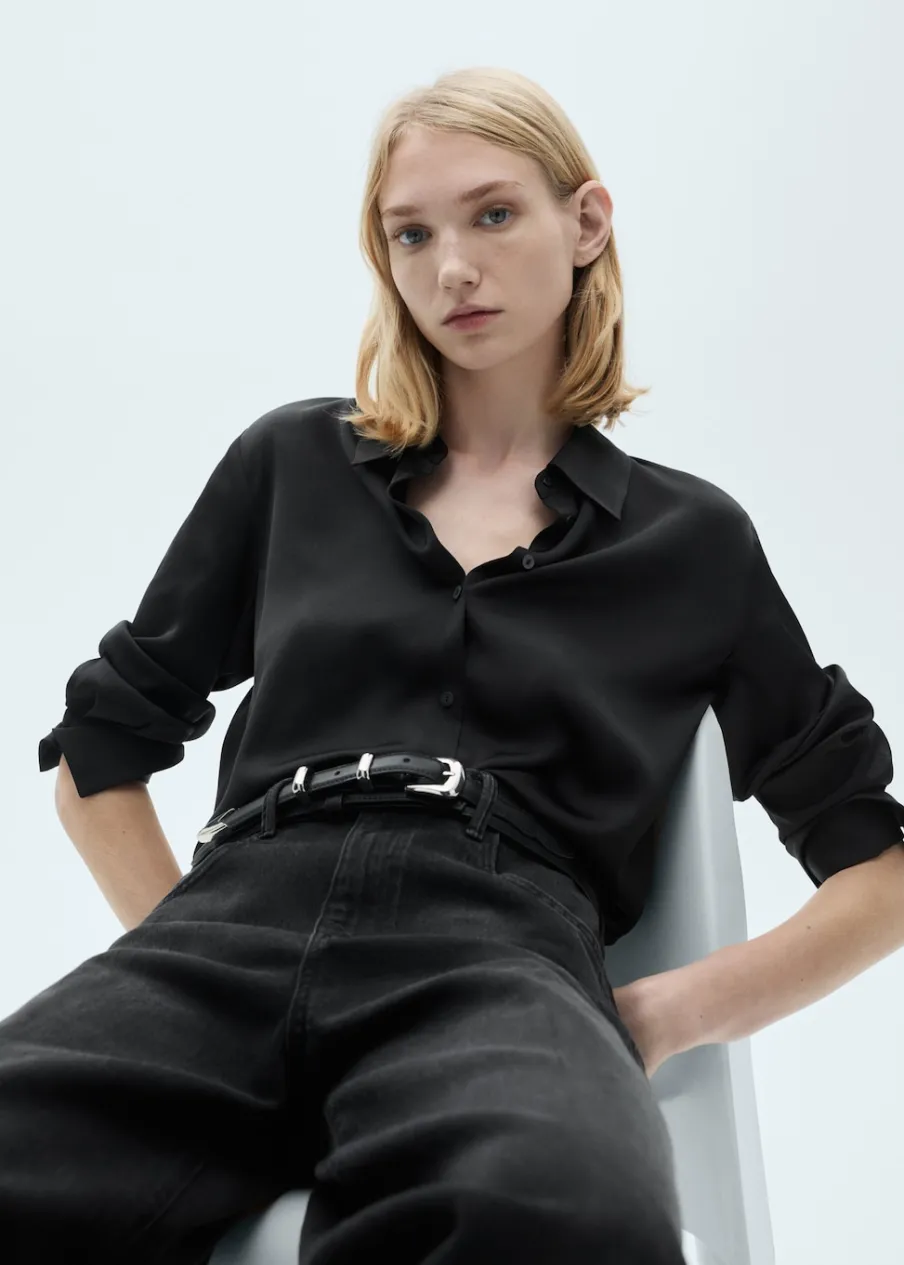 Satynowa tkanina. Lejąca tkanina z teksturą. Model prosty. Model standardowy. Krój regular. Koszulowy kołnierz. Długi rękaw z guzikami na mankietach. Zapięcie z przodu na guziki. Dostępne w Plus Size.