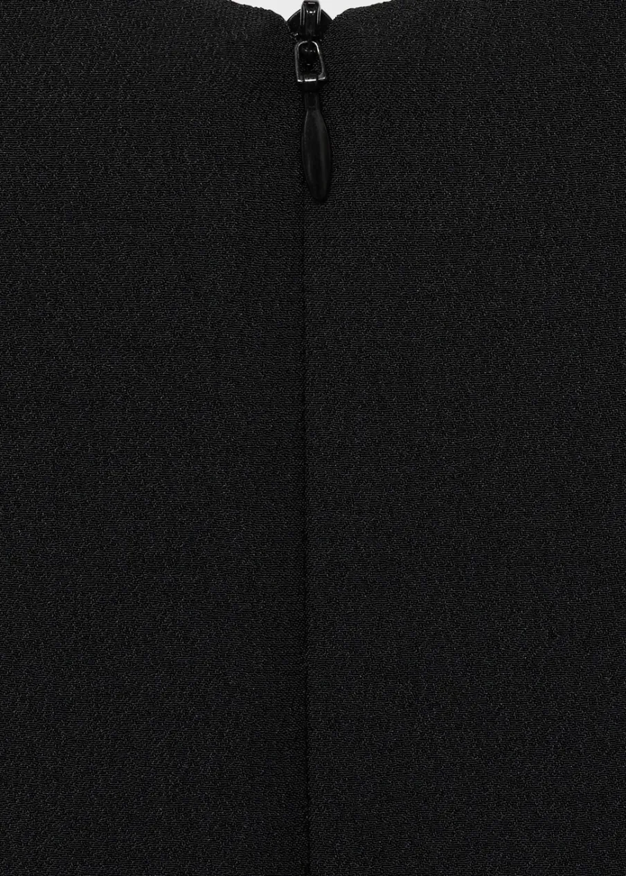 Lejąca tkanina. Model zakładany. Model wcięty. Okrągły dekolt. Bez rękawów. Drapowane detale. Zapięcie z tyłu na suwak.