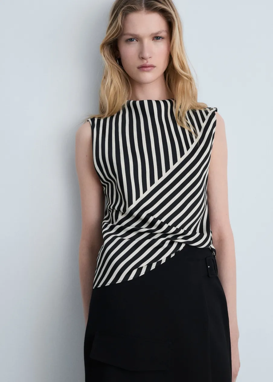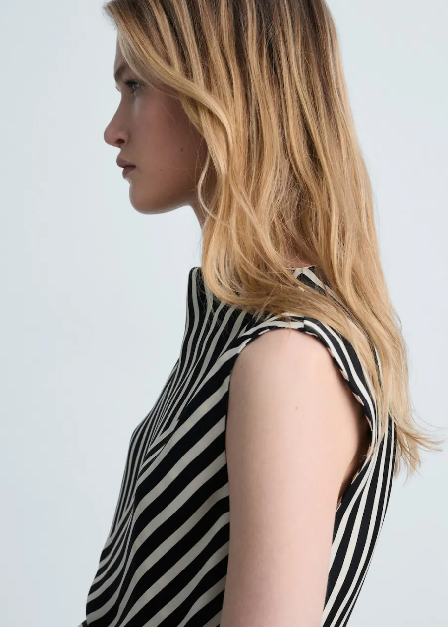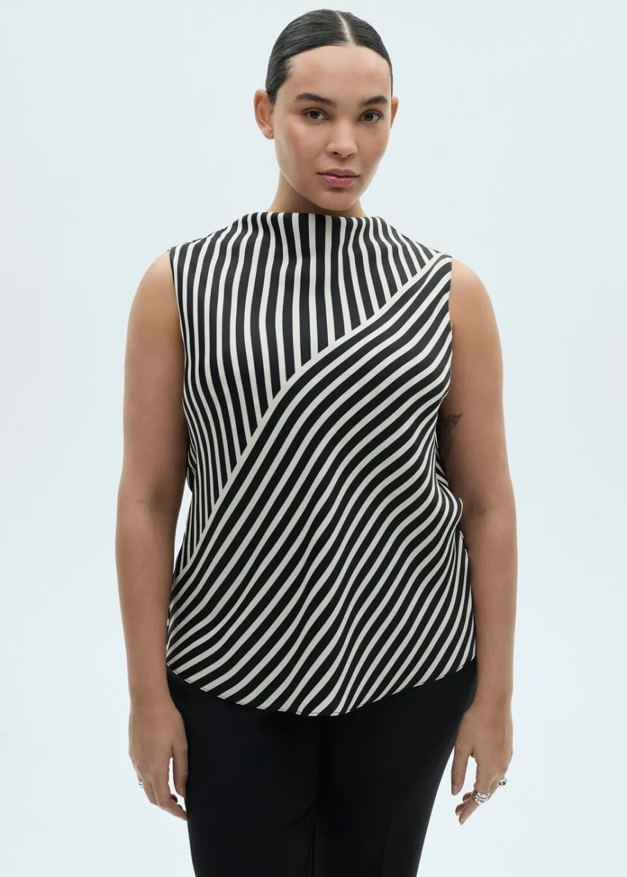 Lejąca tkanina. Satynowa tkanina. Model prosty. Wzór w pasy. Półgolf. Bez rękawów. Zapięcie z tyłu na suwak. Dostępne w Plus Size.