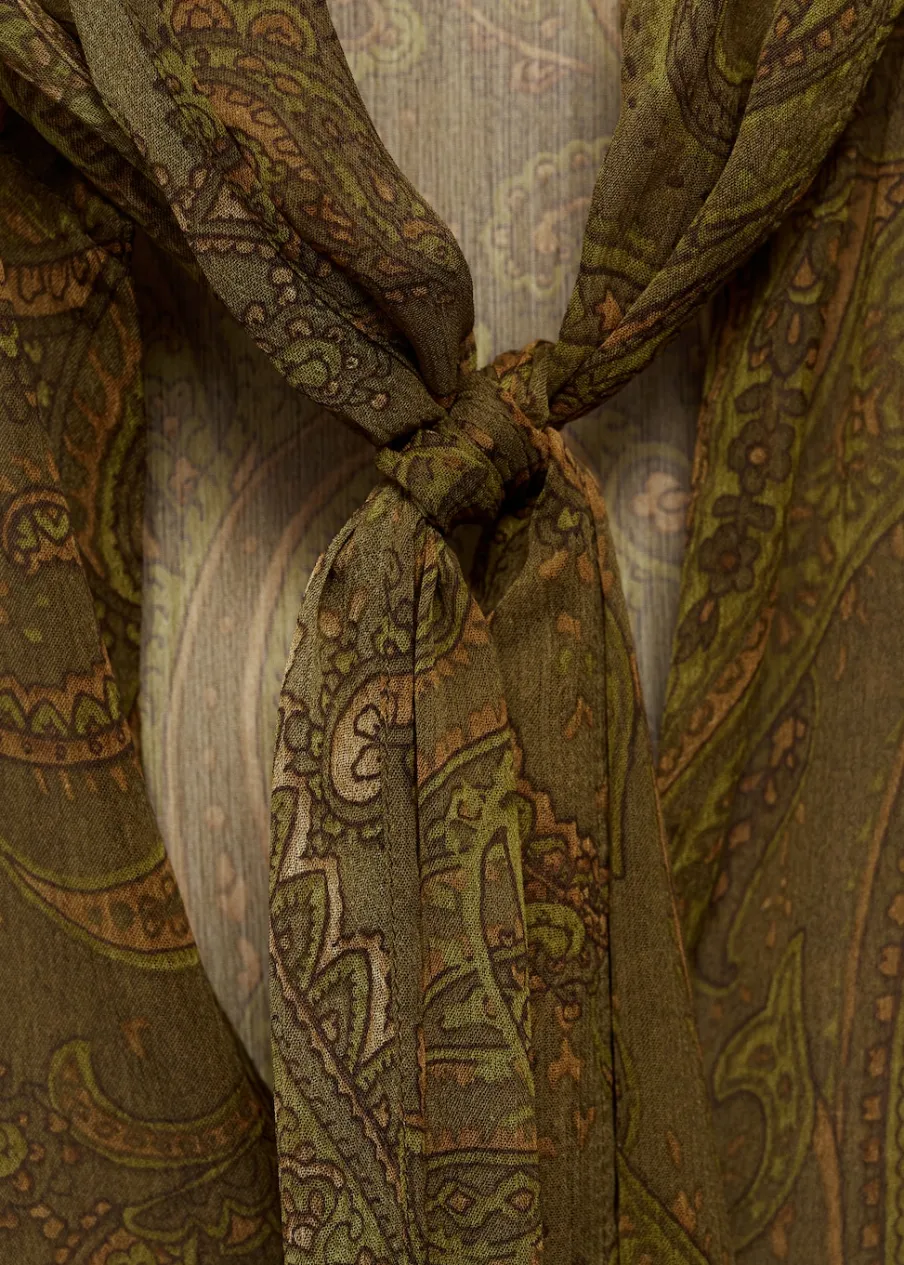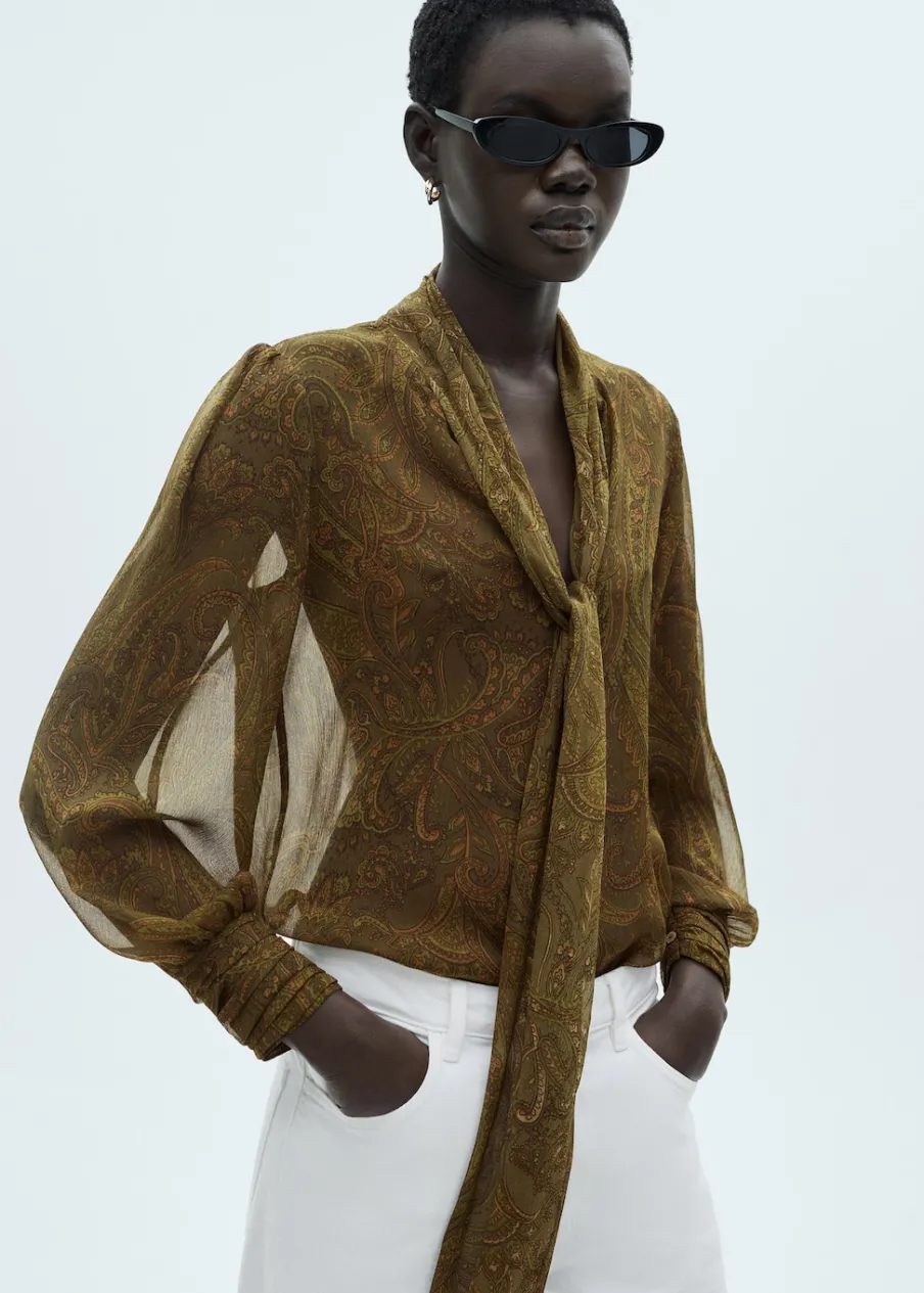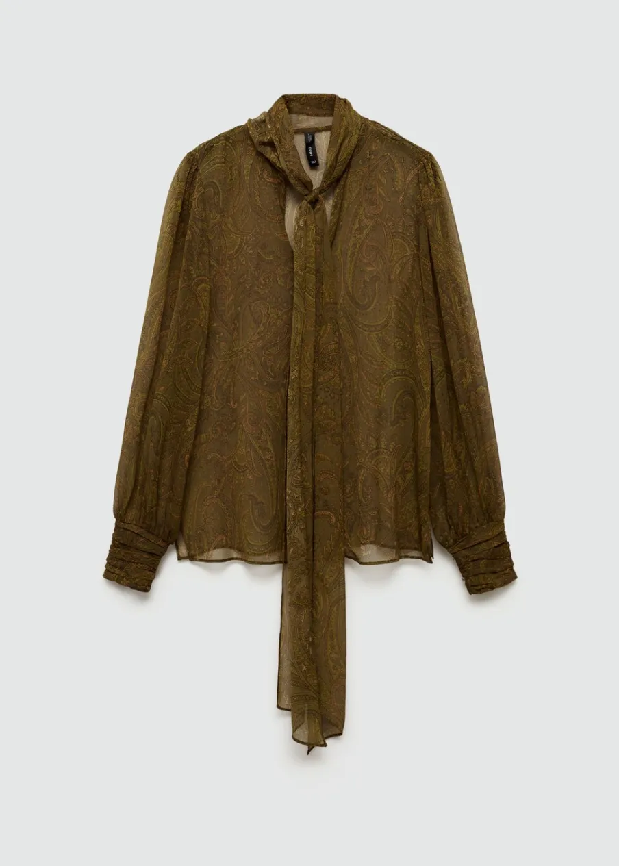 Lejąca tkanina. Wzór paisley. Model prosty. Dekolt V. Długi rękaw z guzikami na mankietach. Wiązanie na szyi. Modelka ma 175 cm wzrostu i nosi rozmiar S/36. Nadruk.