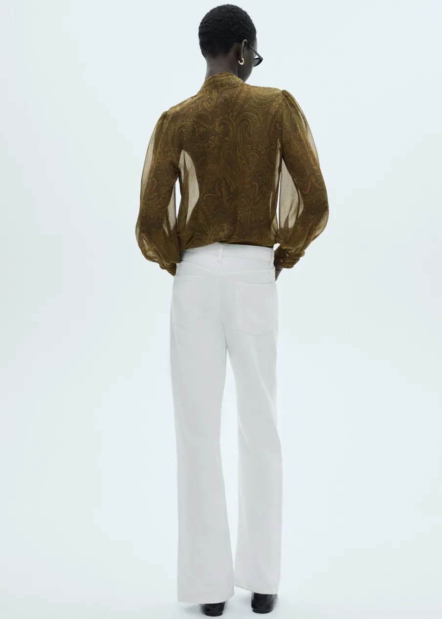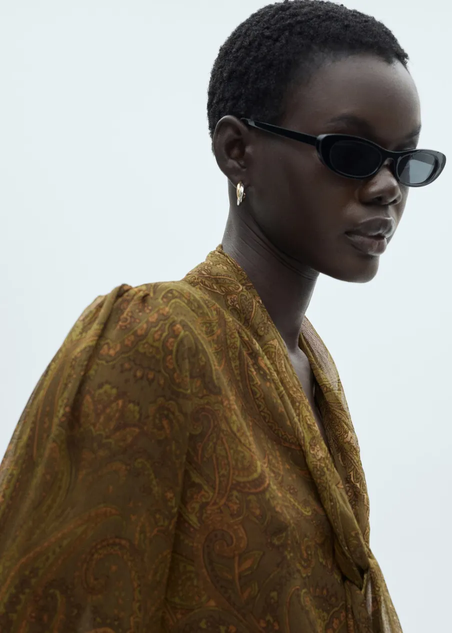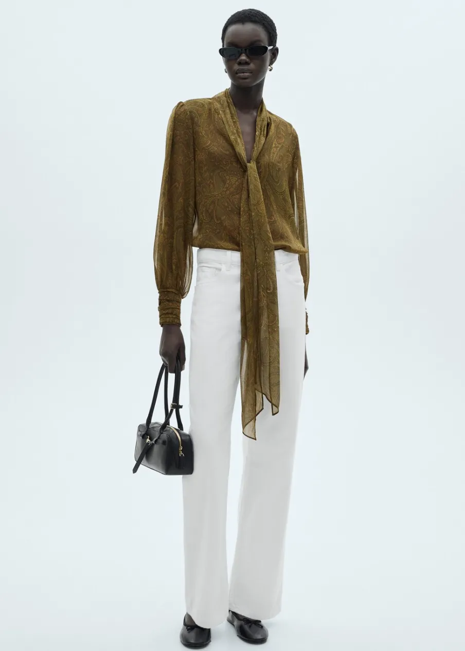 Lejąca tkanina. Wzór paisley. Model prosty. Dekolt V. Długi rękaw z guzikami na mankietach. Wiązanie na szyi. Modelka ma 175 cm wzrostu i nosi rozmiar S/36. Nadruk.