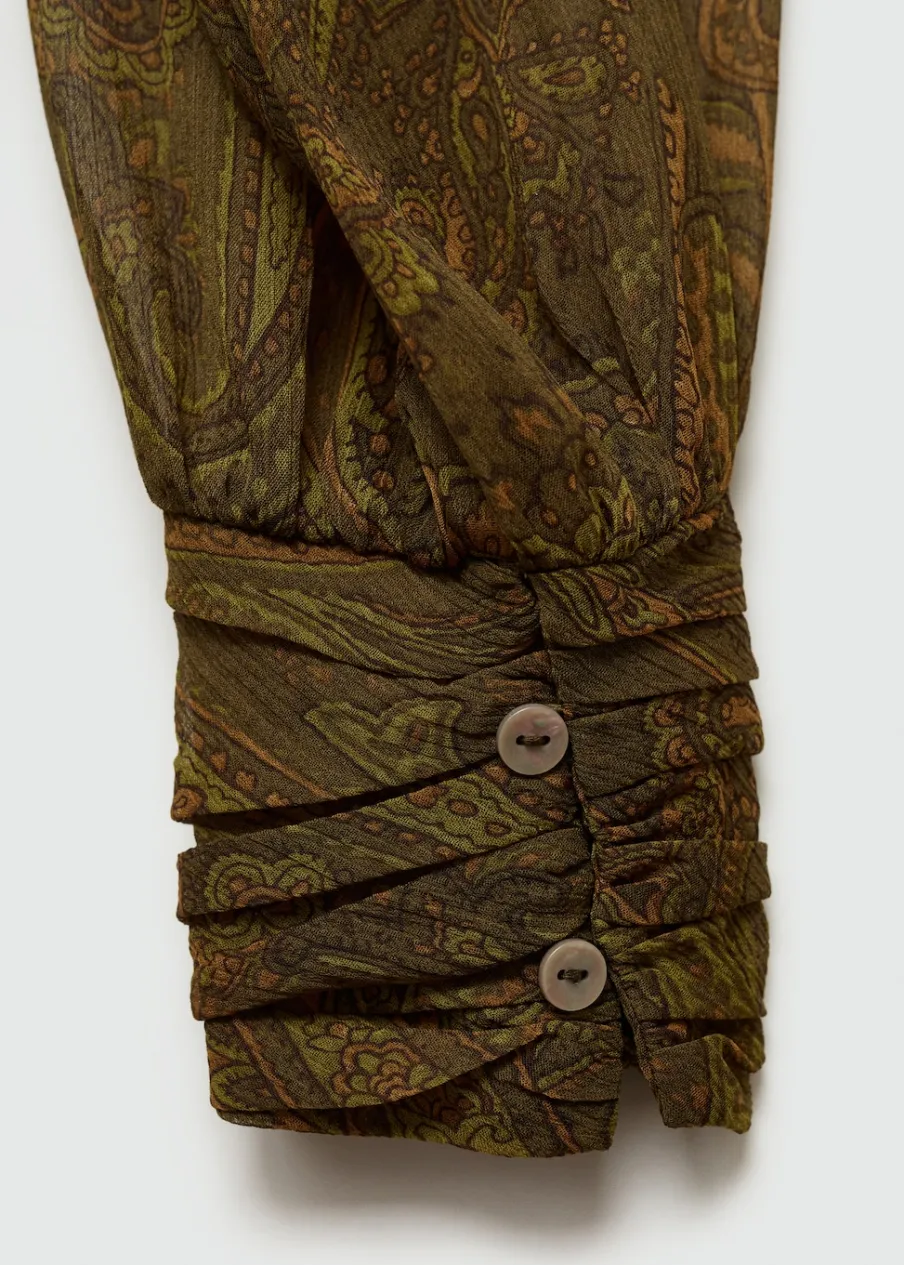 OpisLejąca tkanina. Wzór paisley. Model prosty. Dekolt V. Długi rękaw z guzikami na mankietach. Wiązanie na szyi. M…