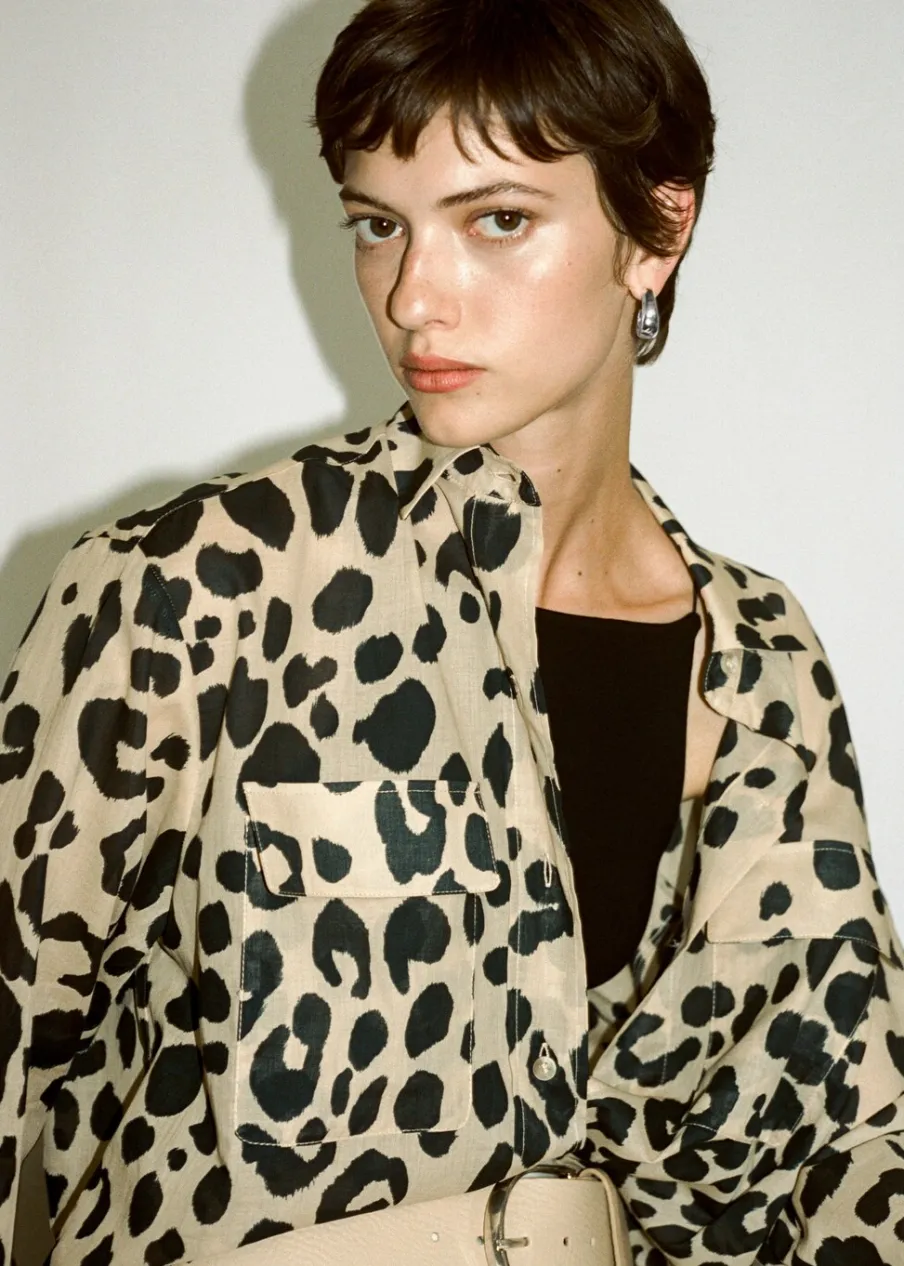 Model prosty. Zwierzęcy wzór. Koszulowy kołnierz. Długi rękaw z guzikami na mankietach. Dwie kieszenie nakładane z przodu. Zapięcie na guziki z przodu. Tkanina z 100% bawełny. Nadruk.