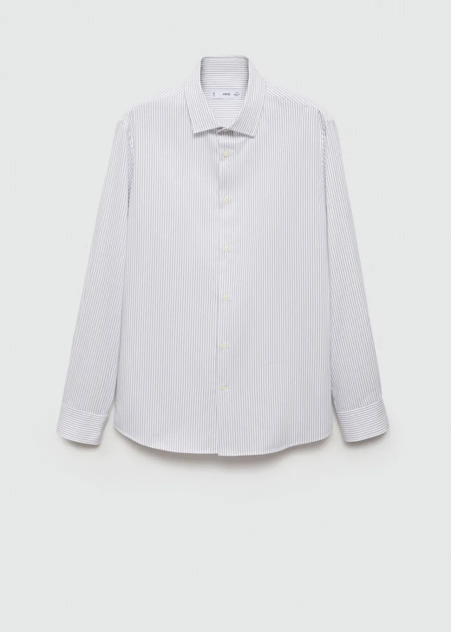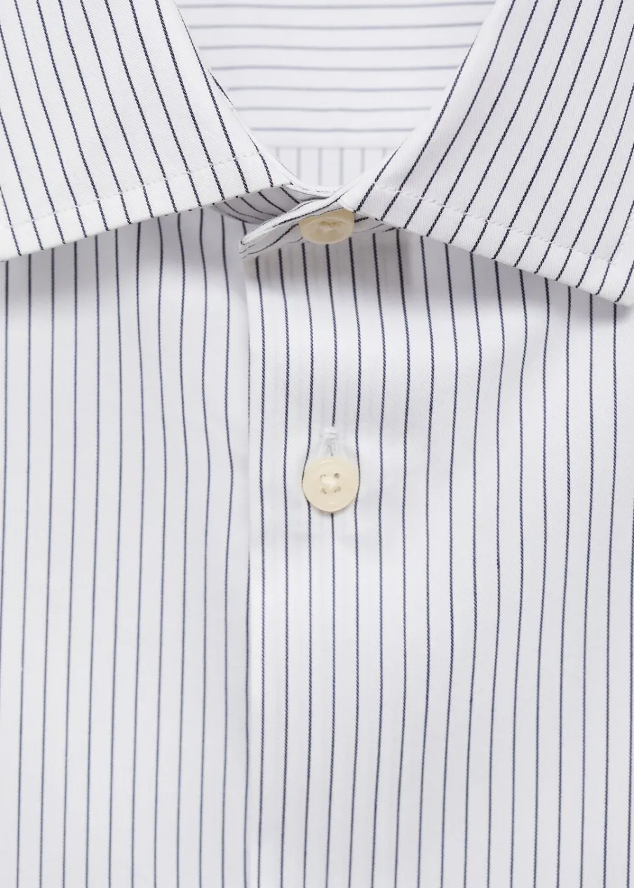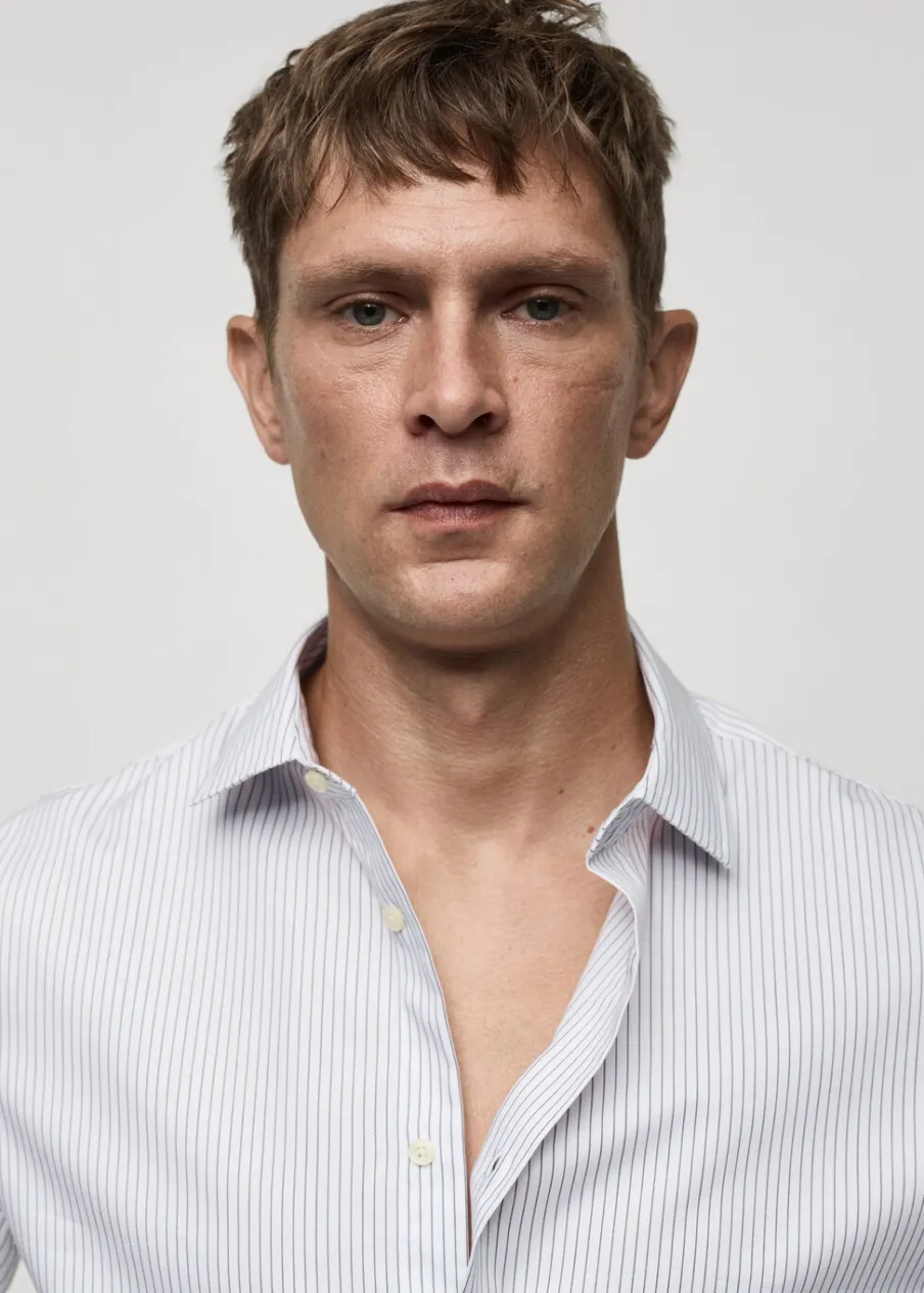 Slim-fit. Tkanina bawełniana. Wzór w pionowe paski. Długi rękaw. Klasyczny kołnierzyk na guziki. Zapinane mankiety. Zaokrąglony dół. Model ma 180 cm wzrostu i nosi rozmiar M.