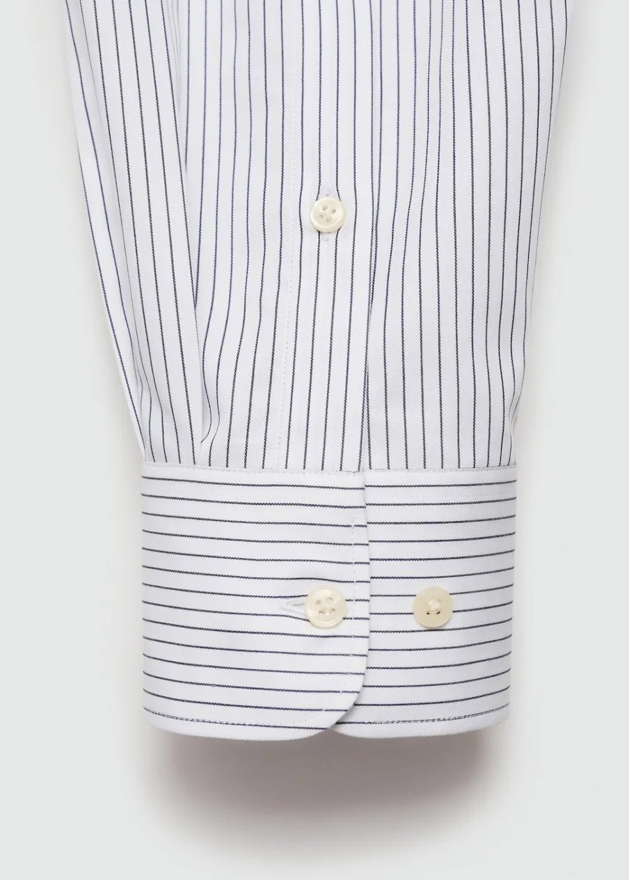 OpisSlim-fit. Tkanina bawełniana. Wzór w pionowe paski. Długi rękaw. Klasyczny kołnierzyk na guziki. Zapinane manki…