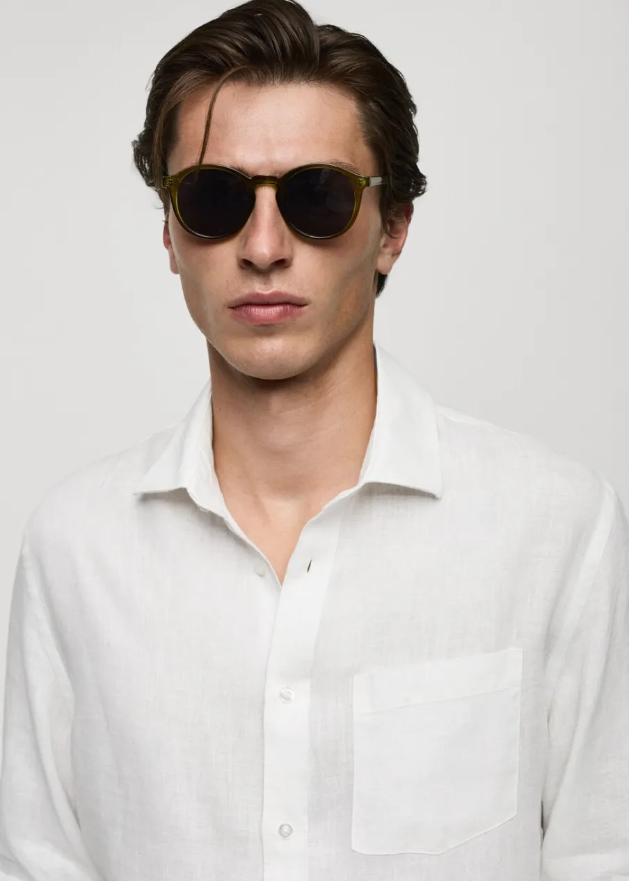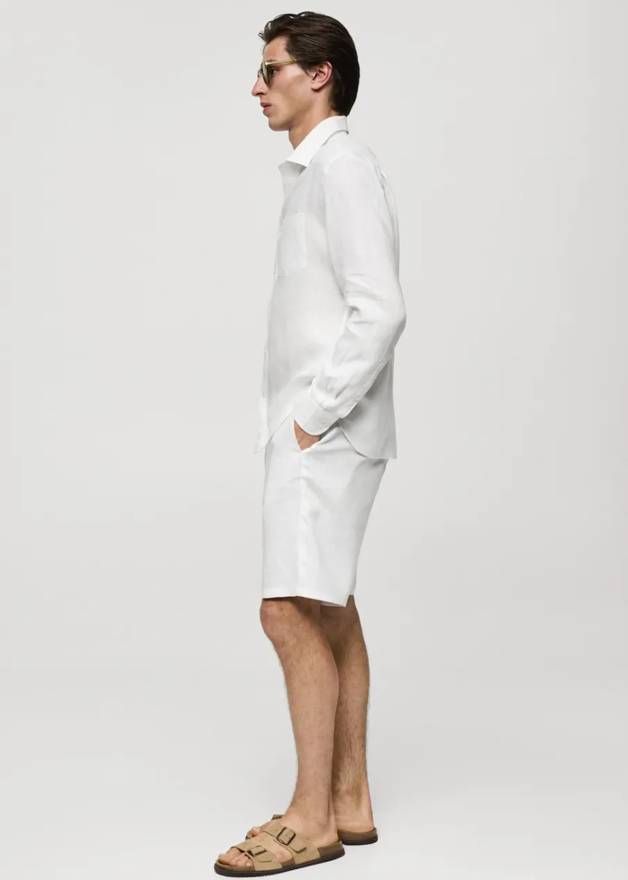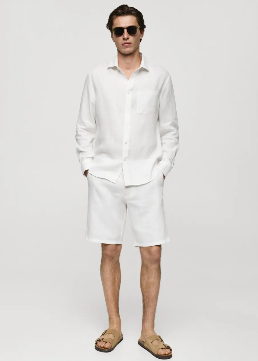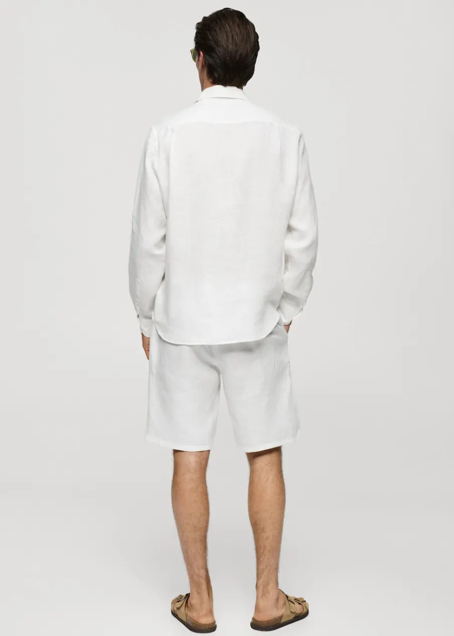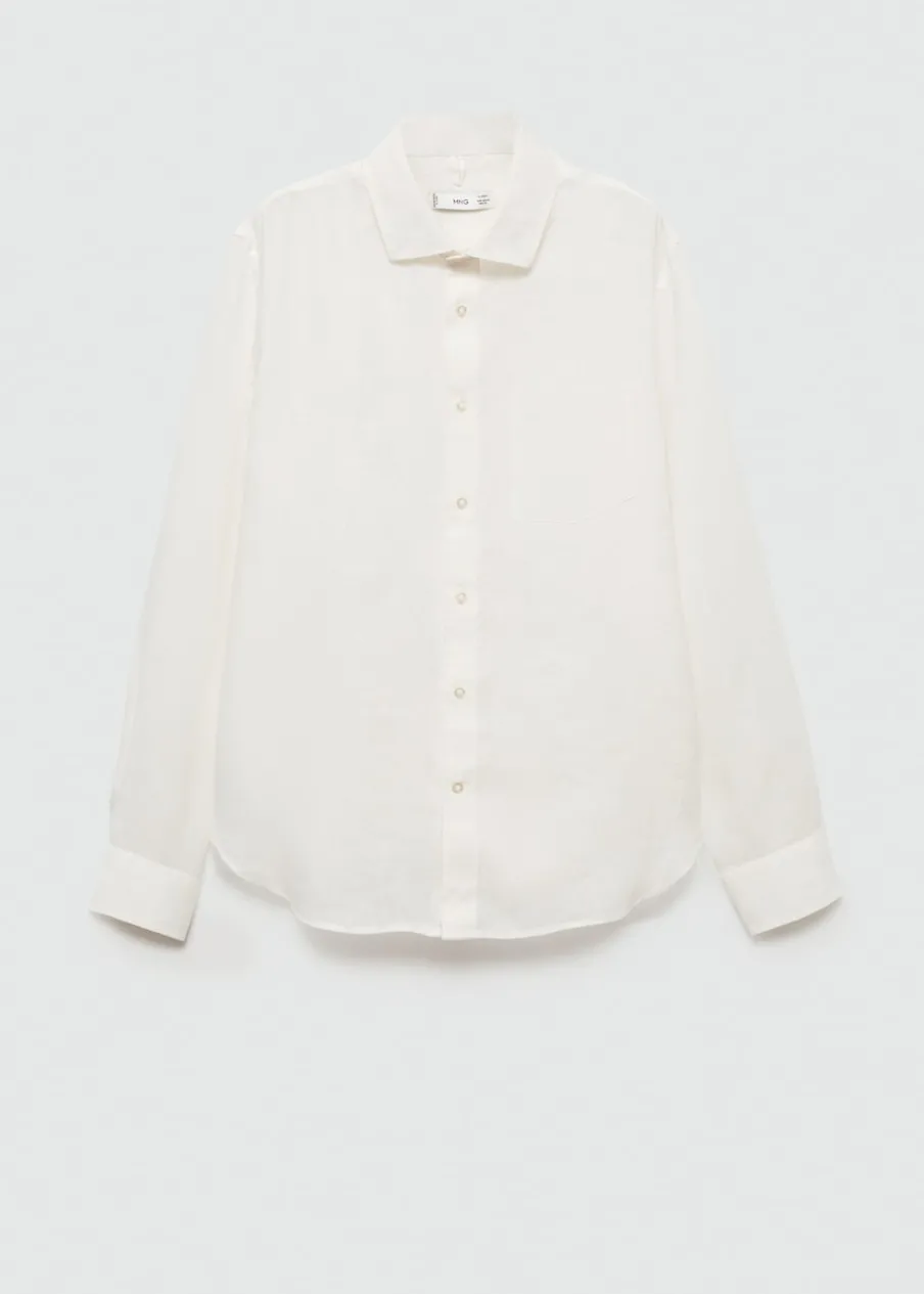 Tkanina z 100% lnu. Cienka tkanina. Zapięcie z przodu na guziki. Długi rękaw z guzikami na mankietach. Kieszeń nakładana na piersi. Model ma 185 cm wzrostu i nosi rozmiar M. Klasyczny krój. Klasyczny kołnierzyk. Zaokrąglony dół.