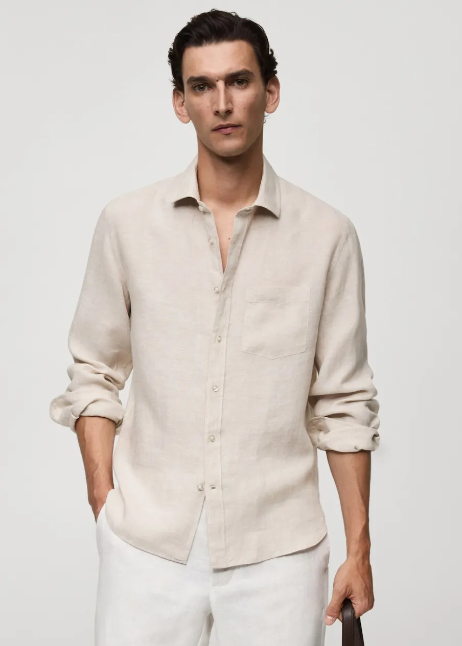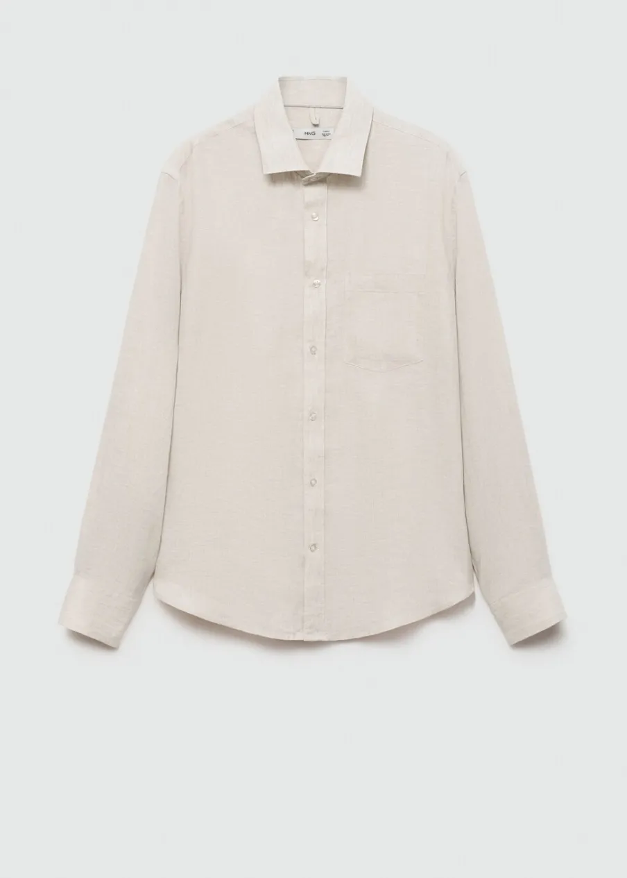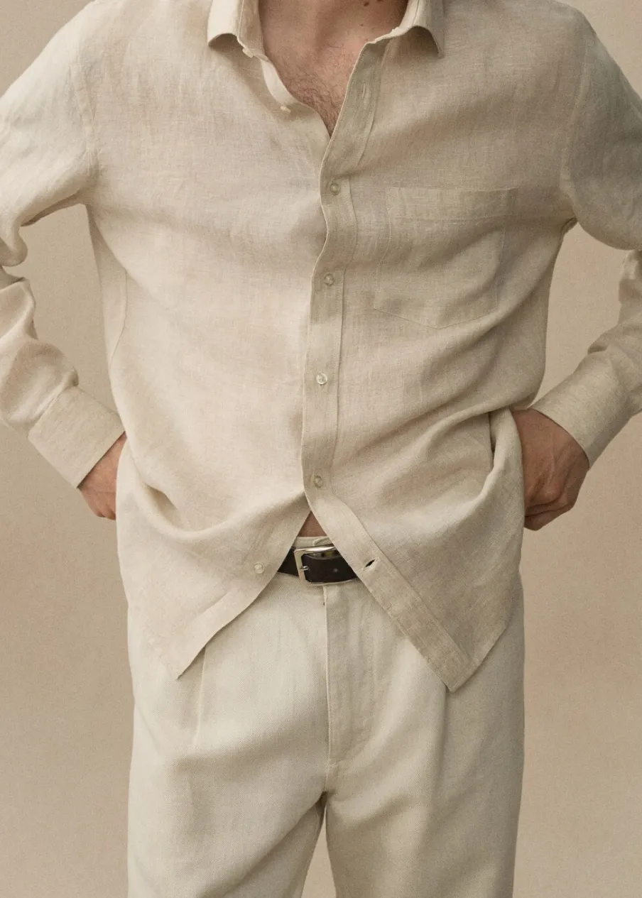 Tkanina z 100% lnu. Cienka tkanina. Zapięcie z przodu na guziki. Długi rękaw z guzikami na mankietach. Kieszeń nakładana na piersi. Model ma 185 cm wzrostu i nosi rozmiar M. Klasyczny krój. Klasyczny kołnierzyk. Zaokrąglony dół.