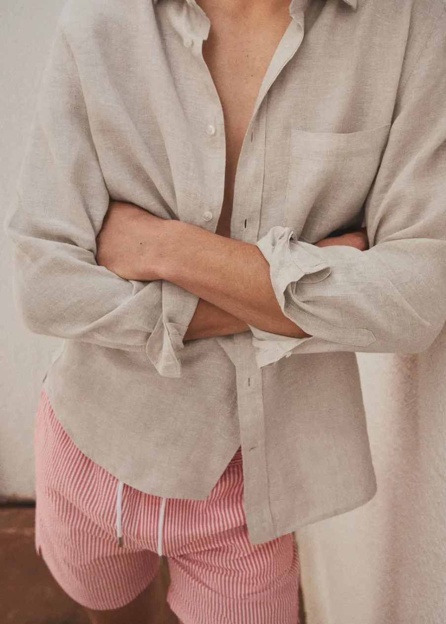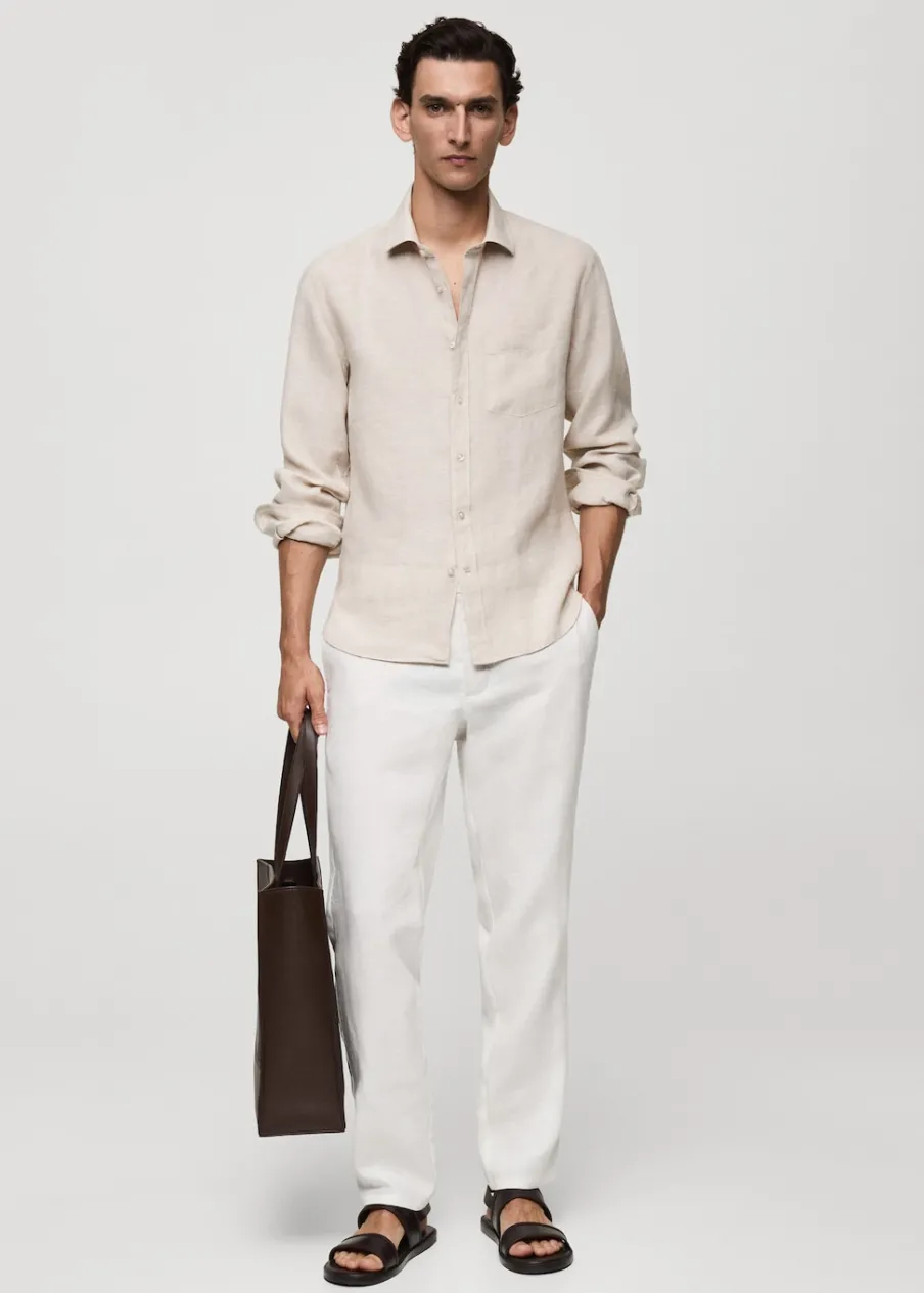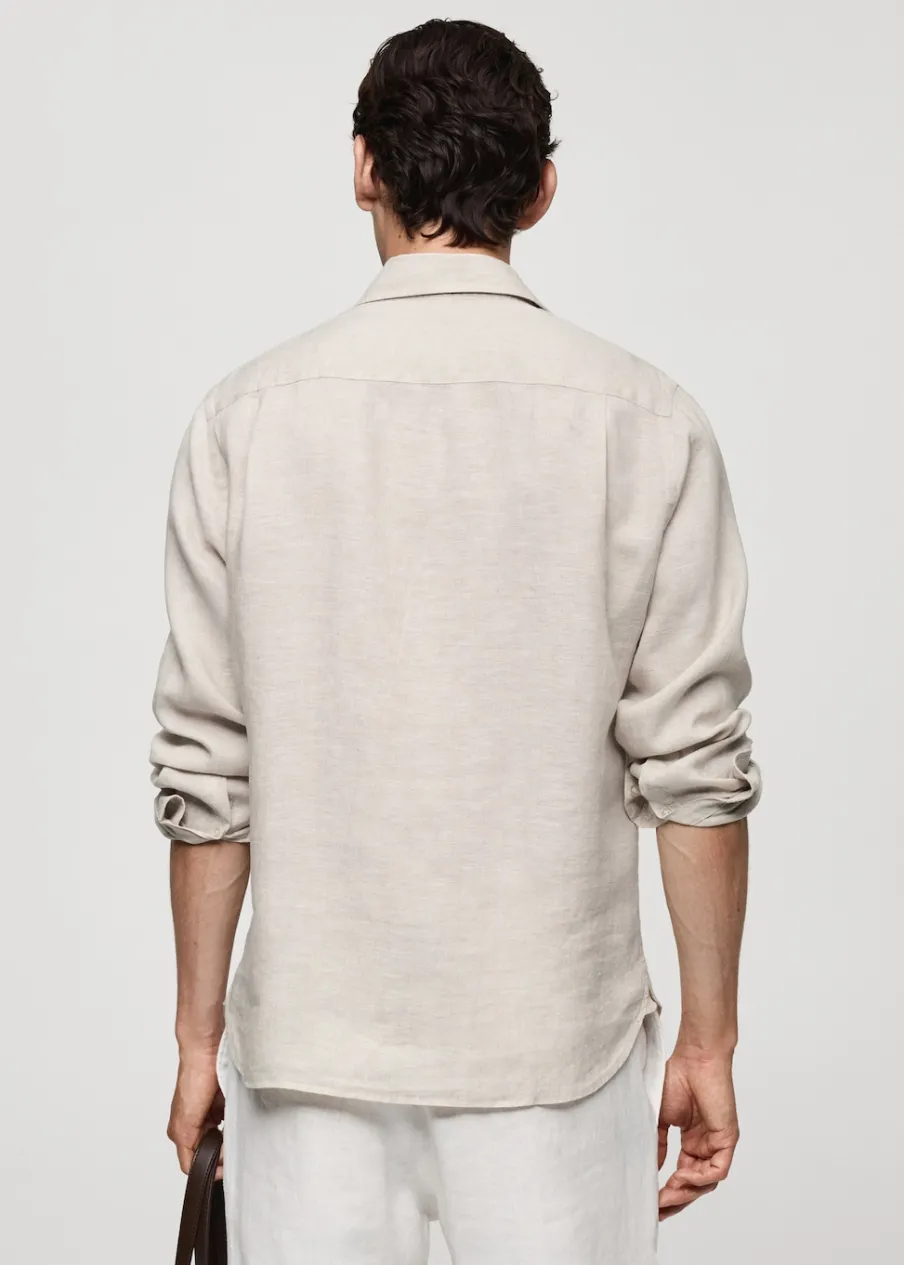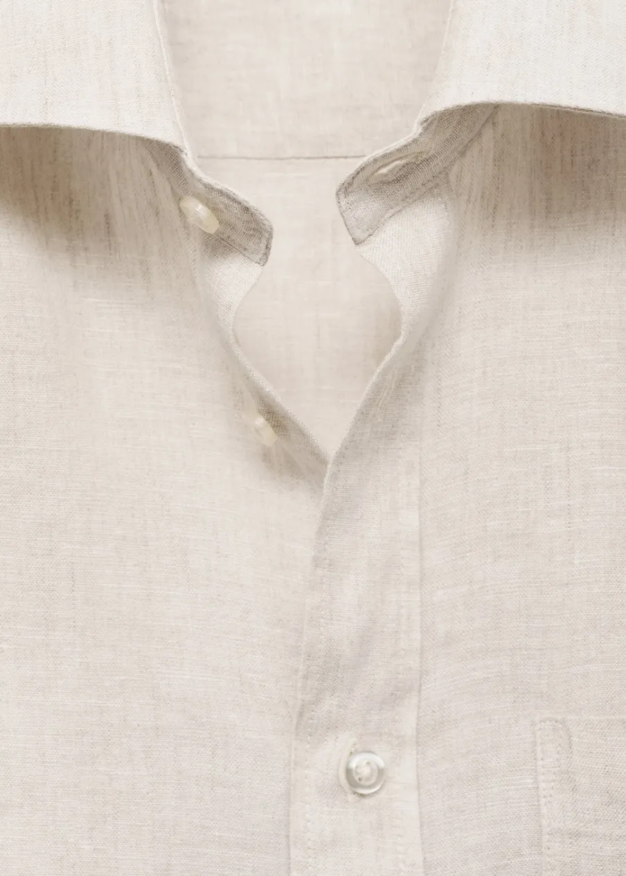 Tkanina z 100% lnu. Cienka tkanina. Zapięcie z przodu na guziki. Długi rękaw z guzikami na mankietach. Kieszeń nakładana na piersi. Model ma 185 cm wzrostu i nosi rozmiar M. Klasyczny krój. Klasyczny kołnierzyk. Zaokrąglony dół.