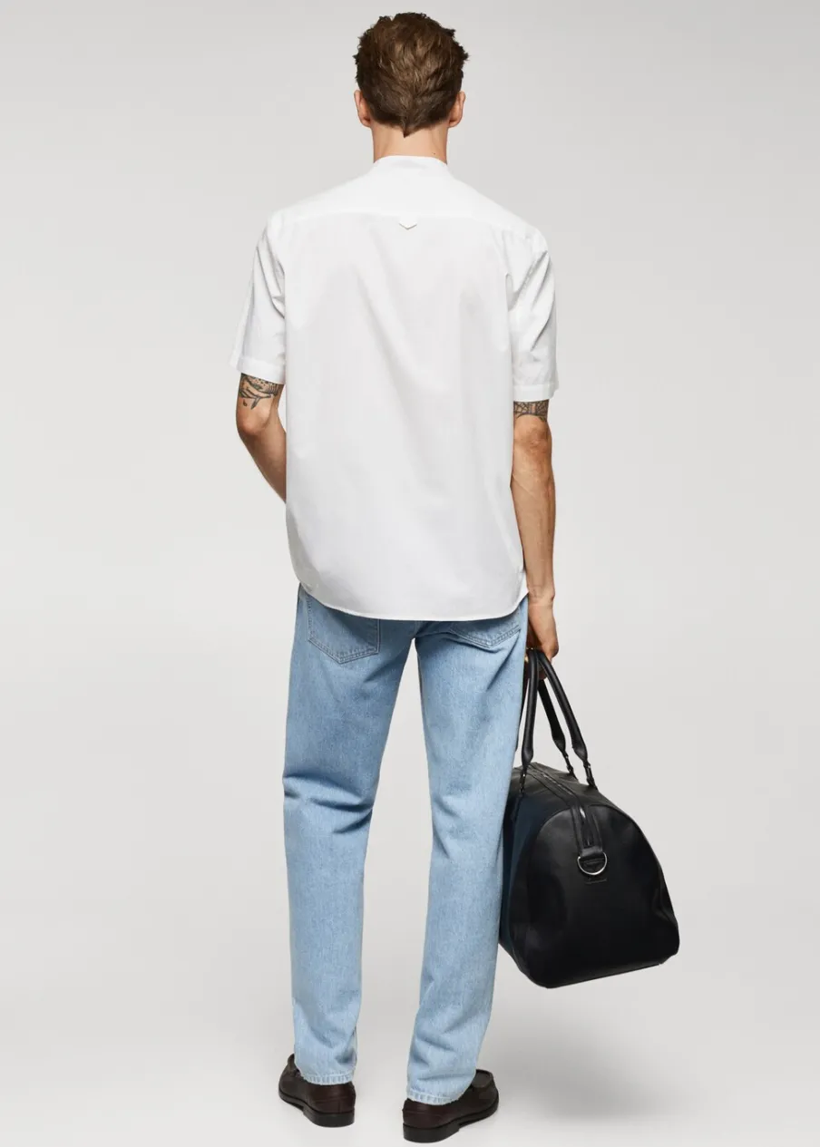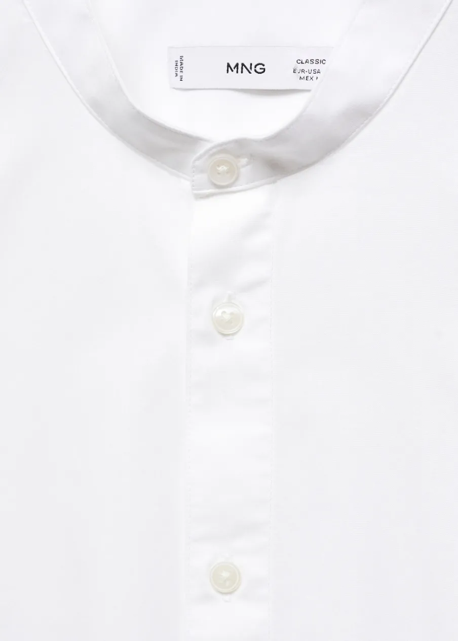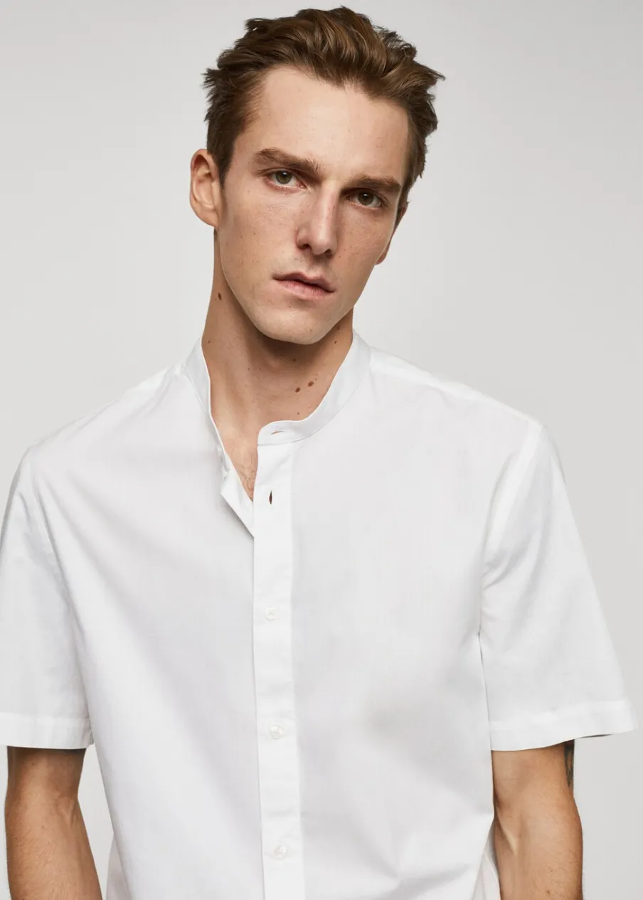 Stójkowy kołnierzyk. Krótki rękaw. Model ma 185 cm wzrostu i nosi rozmiar M. Klasyczny krój. Zapięcie na guziki z przodu. Tkanina z 100% bawełny. Zaokrąglony dół.