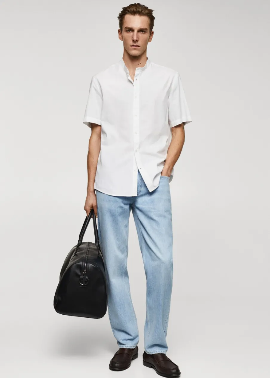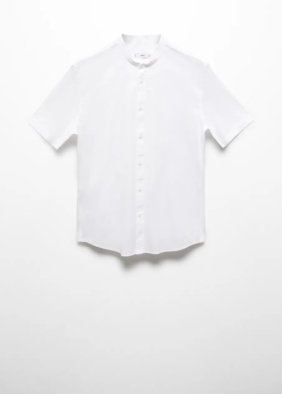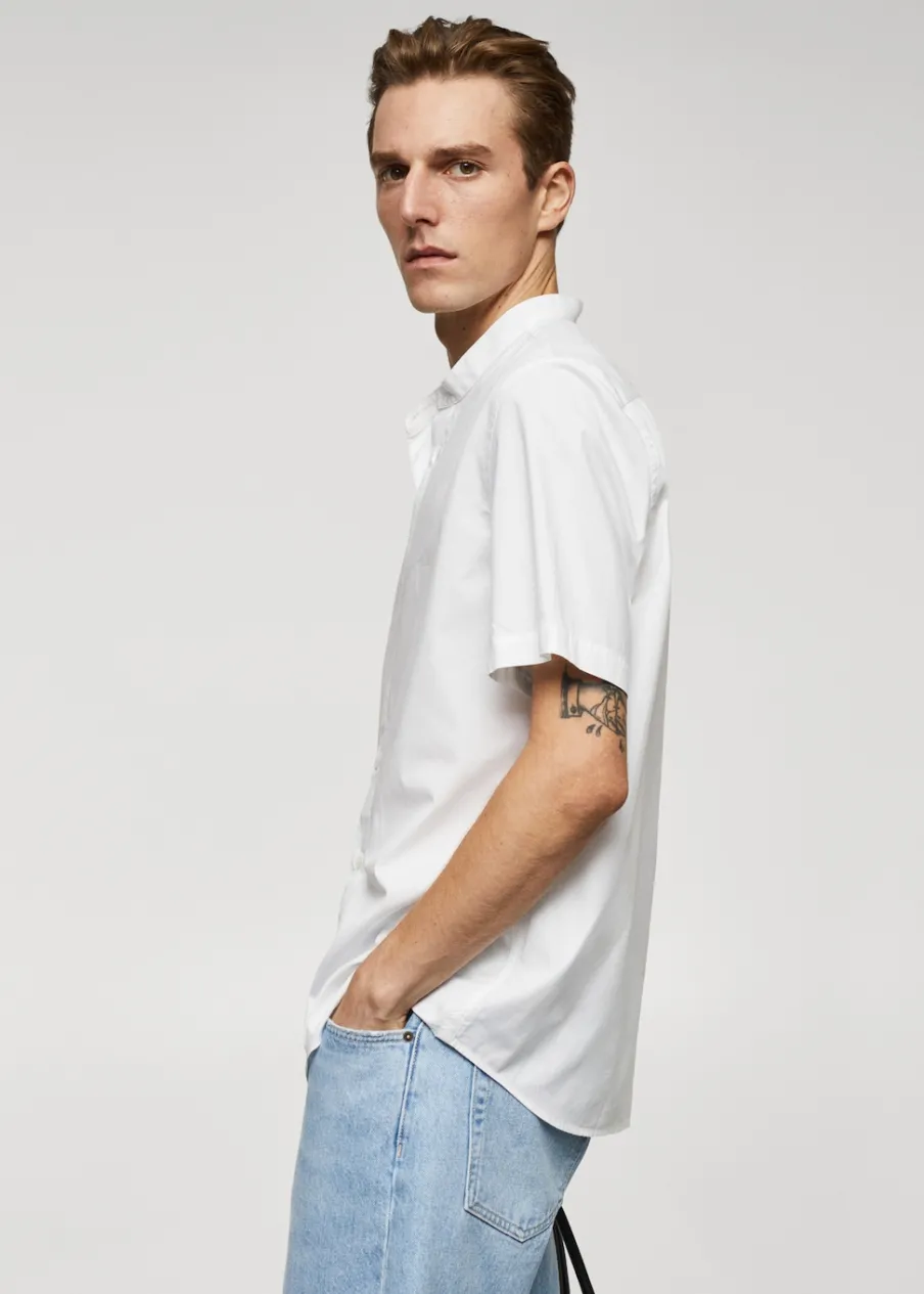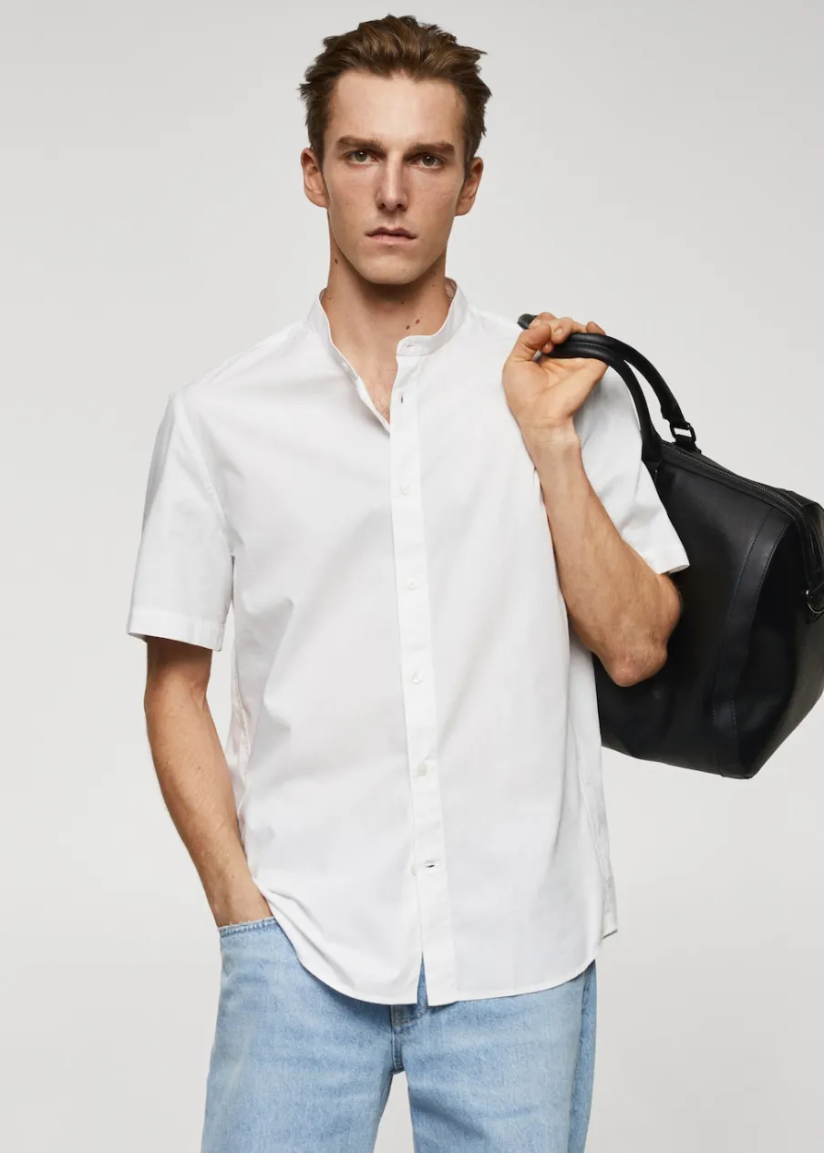 Stójkowy kołnierzyk. Krótki rękaw. Model ma 185 cm wzrostu i nosi rozmiar M. Klasyczny krój. Zapięcie na guziki z przodu. Tkanina z 100% bawełny. Zaokrąglony dół.